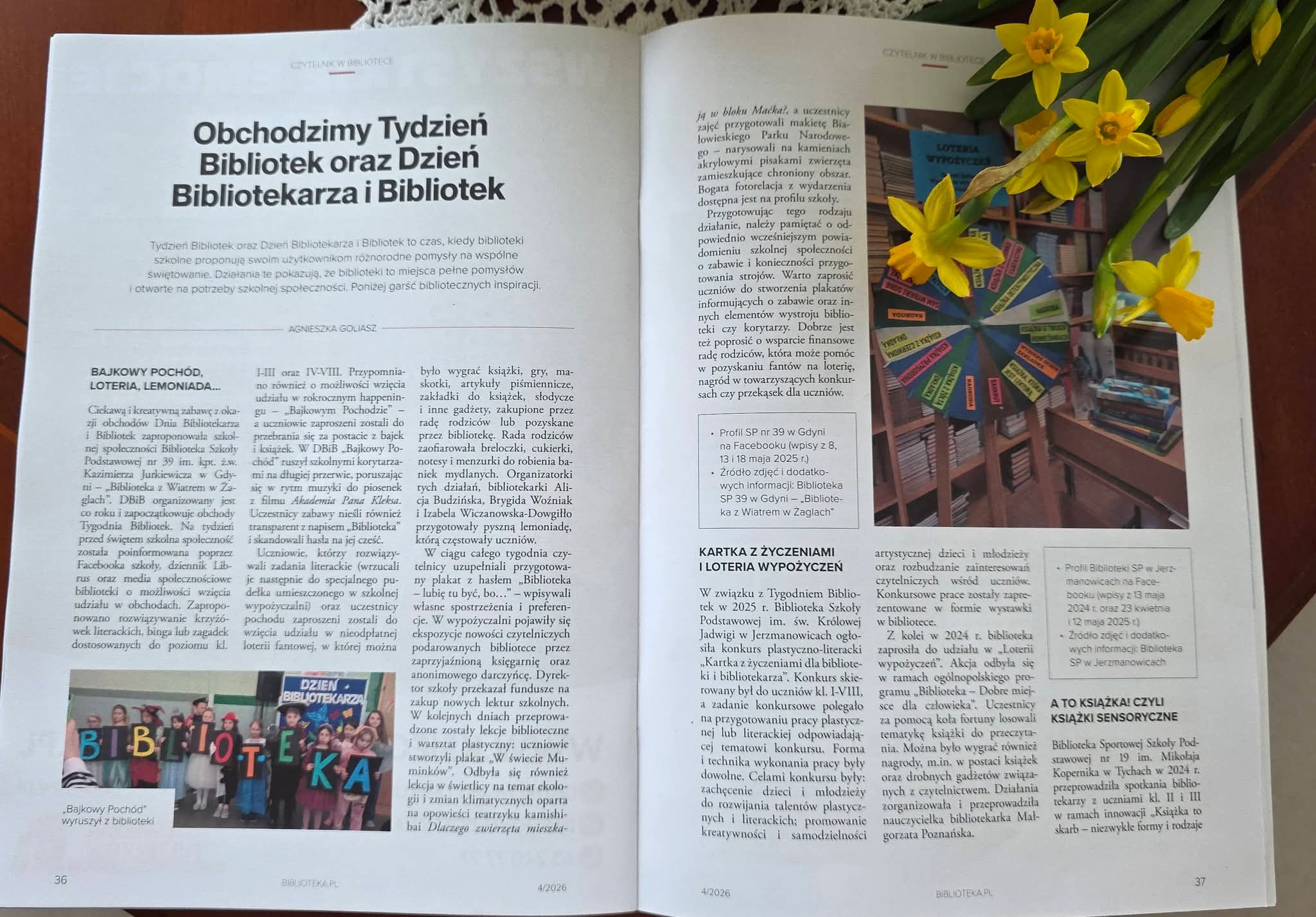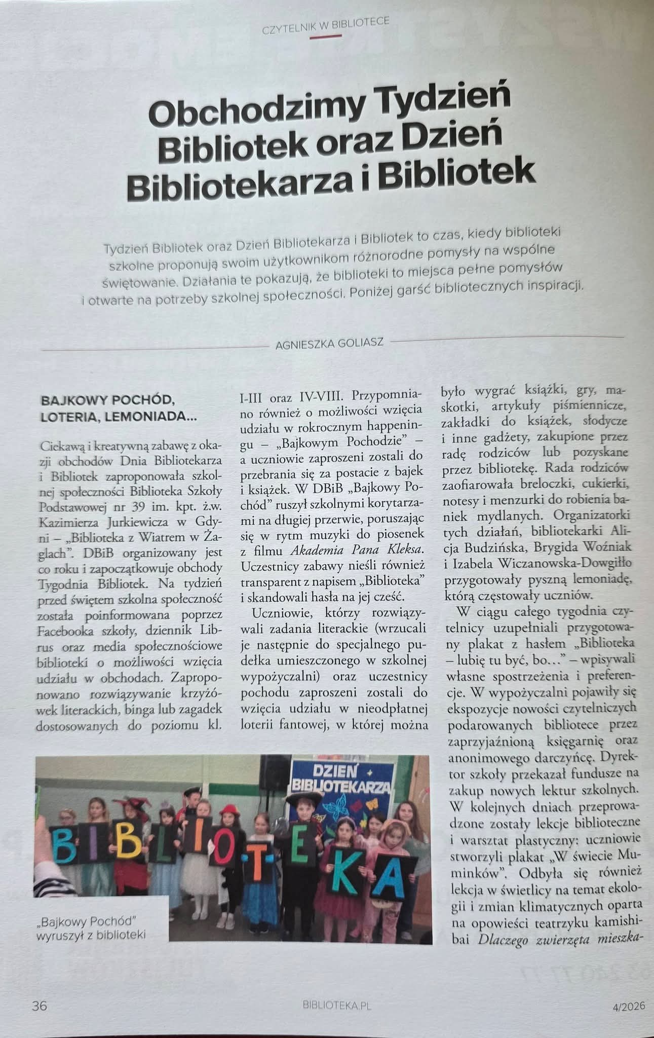 Naszymi dotychczasowymi doświadczeniami w organizacji Dnia Bibliotekarza i Bibliotek, na prośbę ogólnopolskiego miesięcznika "Biblioteka w Szkole "(numer kwietniowy/ 2026), podzieliła się Pani bibliotekarka Alicja Budzińska.