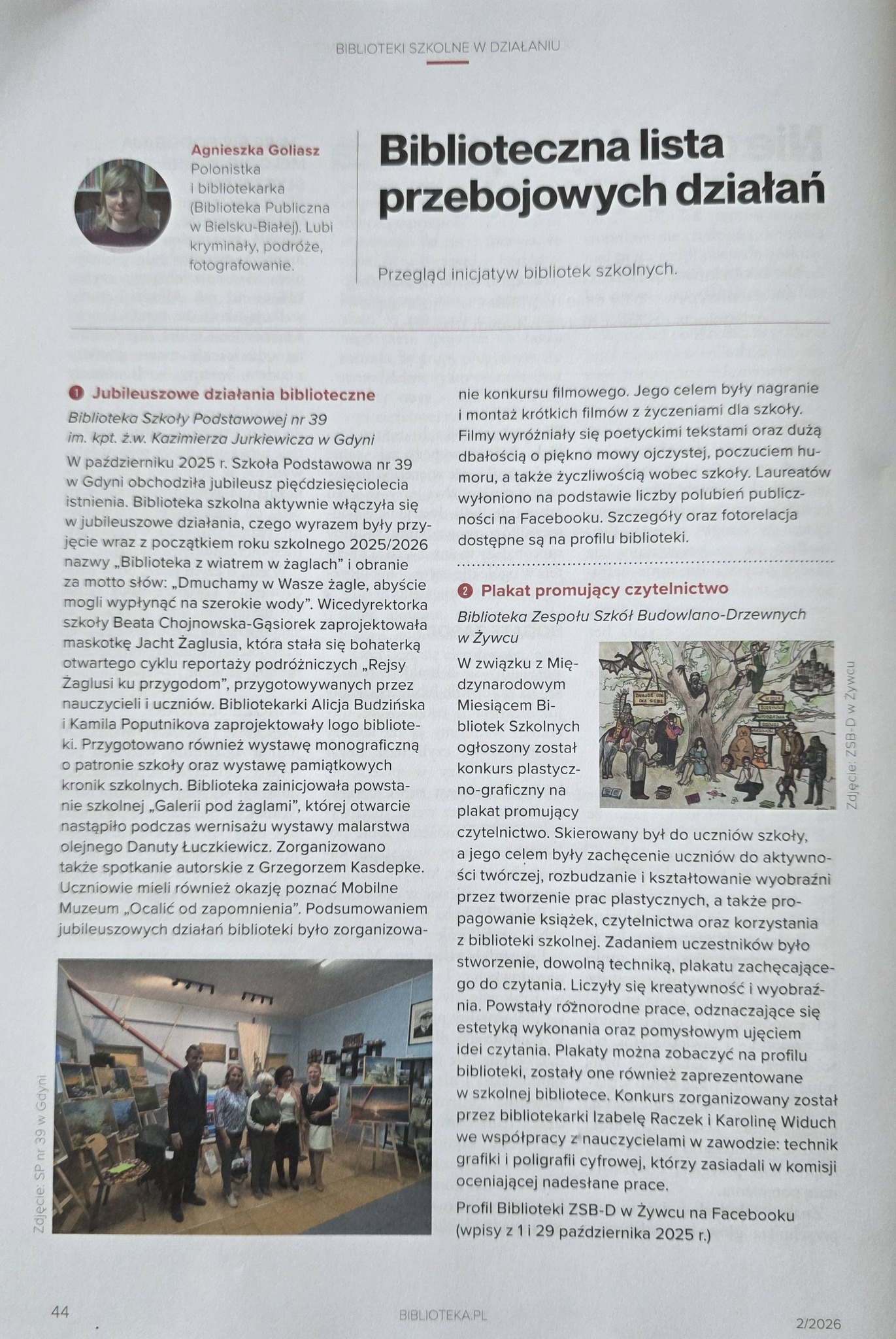 W lutowym numerze ogólnopolskiego miesięcznika pt. "Biblioteka w szkole" oraz ogólnopolskiego czasopisma wydawanego przez Stowarzyszenie Bibliotekarzy Polskich "Poradnik bibliotekarza" nr 2/ 2026 ukazały się artykuły naszej Pani bibliotekarki Alicji Budzińskiej dotyczące obchodów Jubileuszu 50-lecia naszej szkoły .