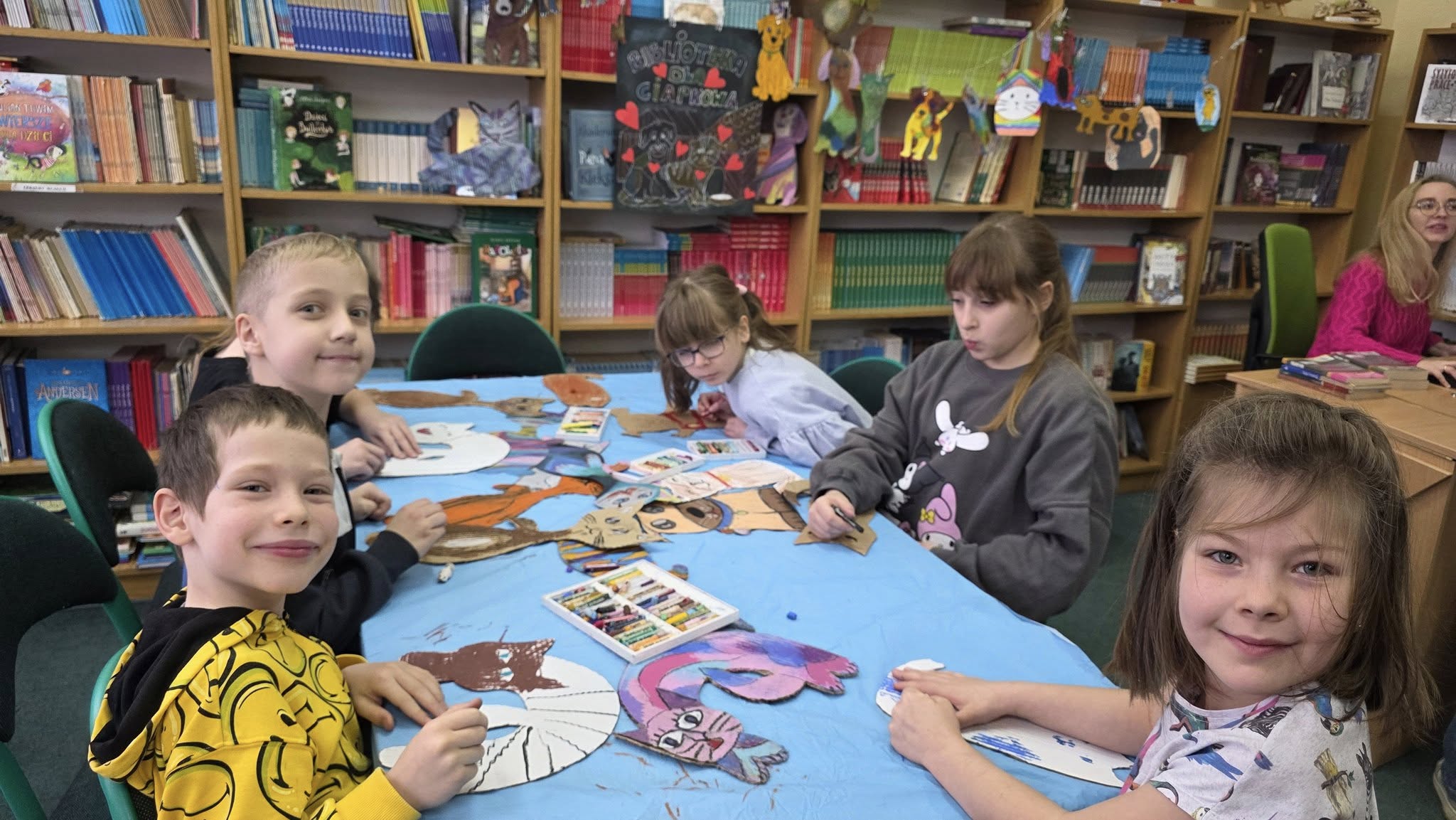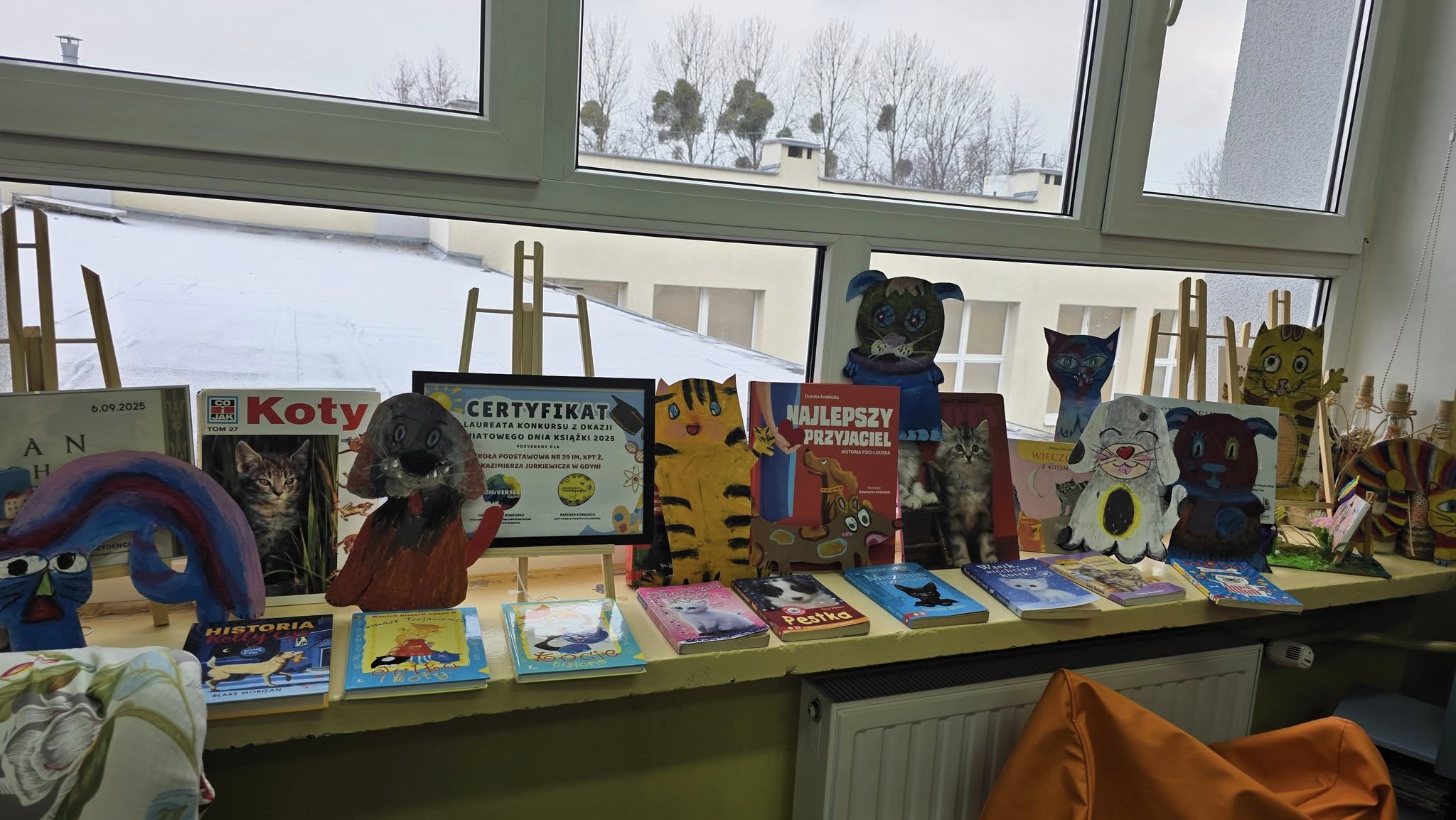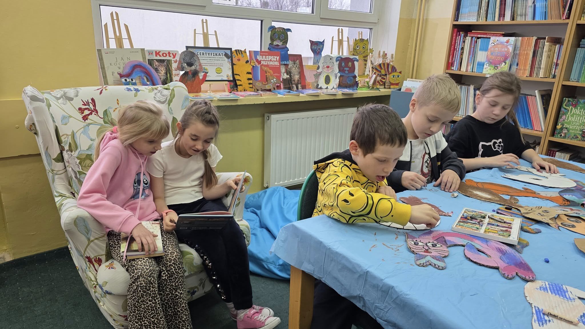 W listopadzie, w naszej wypożyczalni, w ramach akcji czytelniczej "Biblioteka dla Ciapkowa - czytamy psie i kocie opowieści" zachęcaliśmy uczniów do angażowania się w pomoc gdyńskiemu schronisku dla zwierząt. W czasie przerw panie bibliotekarki oraz sami uczniowie czytali fragmenty książek o naszych czworonożnych przyjaciołach, zaś pozostali czytelnicy, wykonywali pastelami olejnymi piękne portrety psów i kotów. Było wesoło, gwarno i mamy nadzieję, że naszą aktywnością przyczyniliśmy się także do przekazania darów w postaci karmy, kocyków, akcesoriów dla zwierząt ze schroniska. To piękna, szlachetna akcja organizowana rokrocznie w naszej szkole przez Panią Agnieszkę Zdziech, którą biblioteka z wielką radością wspiera.