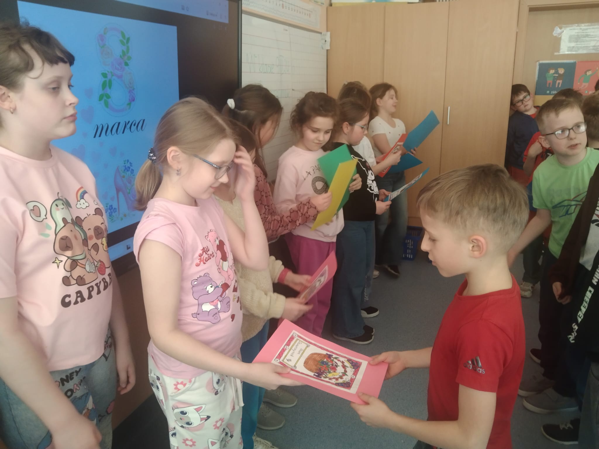 8 marca to wyjątkowy dzień, szczególnie dla wszystkich pań, zarówno tych dużych jak i tych małych. W tym roku szkolnym Dzień Kobiet obchodziliśmy 9 marca. Tego dnia panowała w klasie świąteczna atmosfera. Chłopcy z elegancją złożyli koleżankom życzenia i wręczyli własnoręcznie wykonane kolorowe laurki. Dodatkowo dziewczynki dostały wspaniałe upominki ufundowane przez rodziców. Na uczniów czekało wiele niespodzianek i atrakcji: zagadki i kalambury z odgadywaniem dziewczęcych postaci z bajek i filmów, wspólne zabawy z wykorzystaniem tablicy interaktywnej i wykonywanie tematycznych rysunków w edytorze grafiki. Ten miły dzień na pewno na długo zostanie w pamięci dziewczynek.