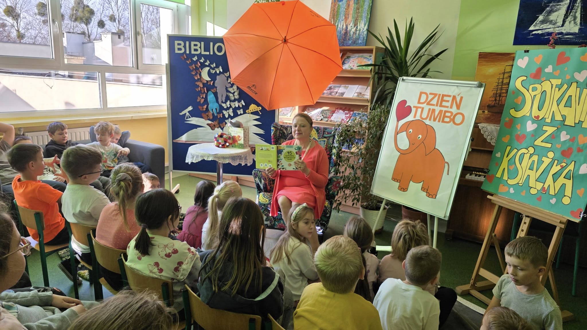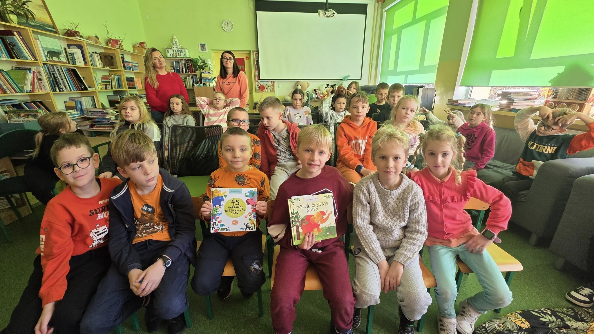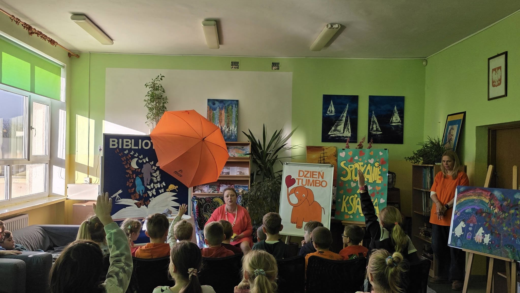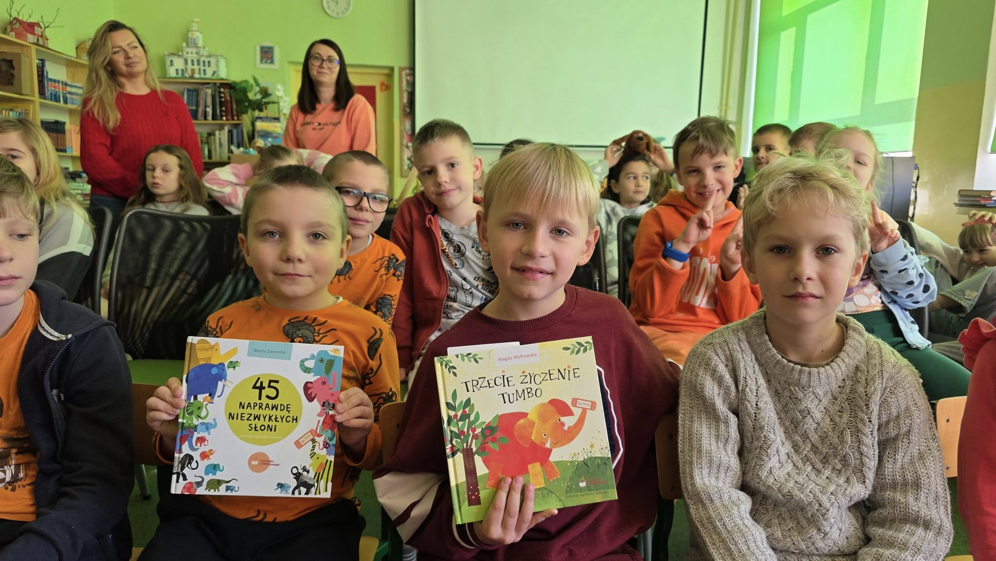 W cyklu "Spotkanie z książką" poznaliśmy dzisiaj książeczkę Marty Zaremby pt. "45 naprawdę niezwykłych słoni" oraz książeczkę Magdy Małkowskiej "Trzecie życie Tumbo", czytanych przez Panią bibliotekarkę Alicję dzieciom z klasy 2b, 2c, 2d i 3b. Uczniowie zostali uświadomieni, że w klasie nikt nie musi być sam ze swoim smutkiem. Czasem wystarczy dobre słowo, przyjazny gest albo po prostu bycie obok. Pomarańczowy słoń Tumbo, bohater dzisiejszych opowieści, w łagodny sposób przeprowadził nas przez tą trudną tematykę i wskazał jak ważne jest, żeby pamiętać, że każdy przeżywa smutek inaczej. Dlatego powinniśmy być dla siebie życzliwi i uważni — tak budujemy klasę, w której każdy będzie się czuł bezpiecznie.