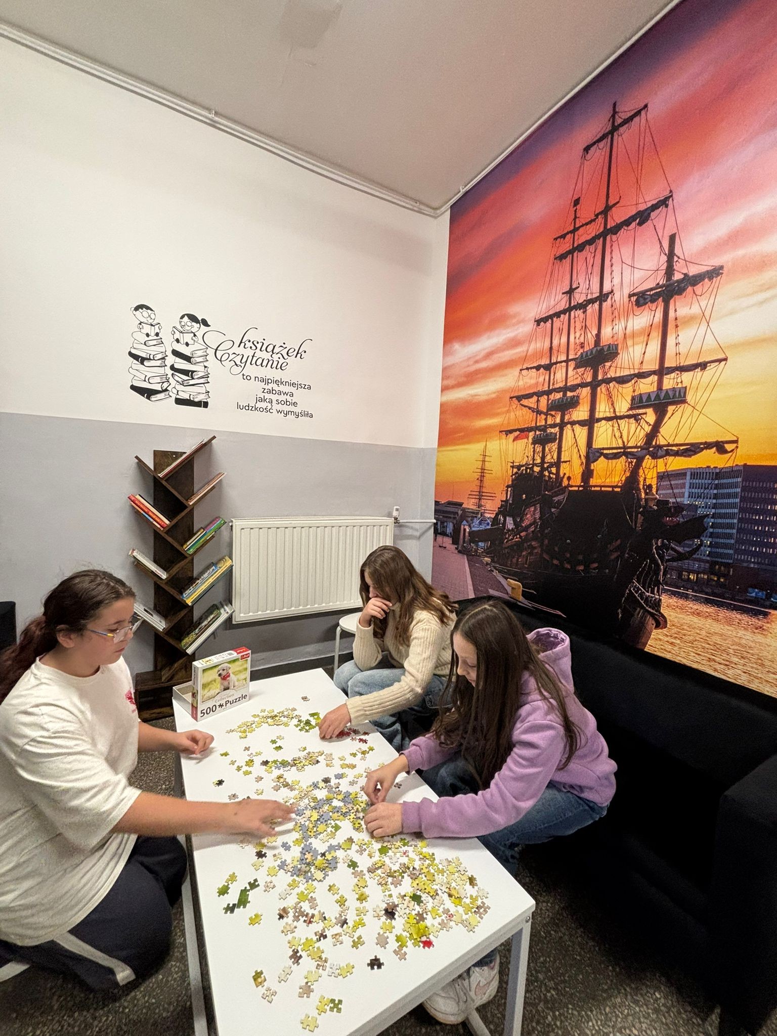 Zapraszamy do kącika czytelniczego przy świetlicy! To idealne miejsce na chwilę wyciszenia, poczytanie ulubionej książki lub ułożenie paru puzzli (tylko podczas przerw).