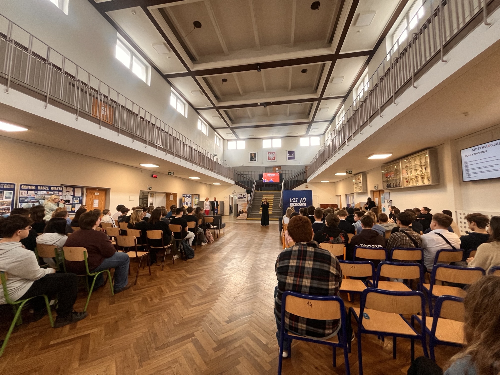 Celem kongresu było wzmacnianie młodych ludzi w obszarze zdrowia psychicznego, motywacji oraz świadomego rozwoju. Uczniowie mieli okazję wziąć udział w inspirujących spotkaniach z prelegentami, obejrzeć pokaz cheerleaders, a także wysłuchać wyjątkowej rozmowy z gościem specjalnym – Tytusem Chmielewskim, podróżnikiem rowerowym i twórcą internetowym. Jego historia była doskonałym przykładem odwagi, wytrwałości i podejmowania działania mimo niepewności.