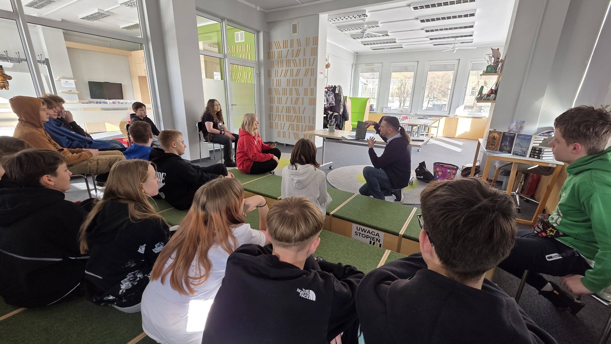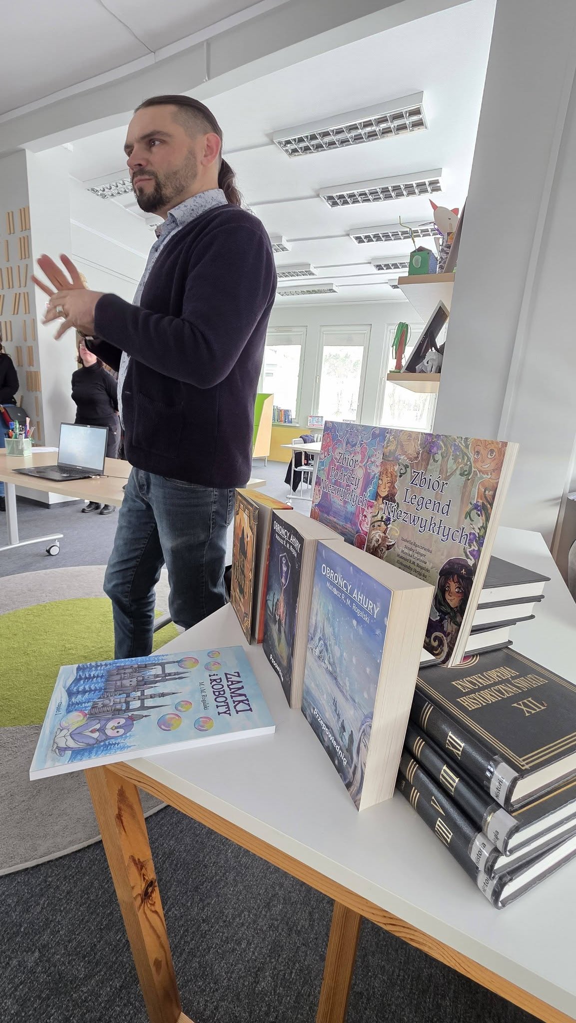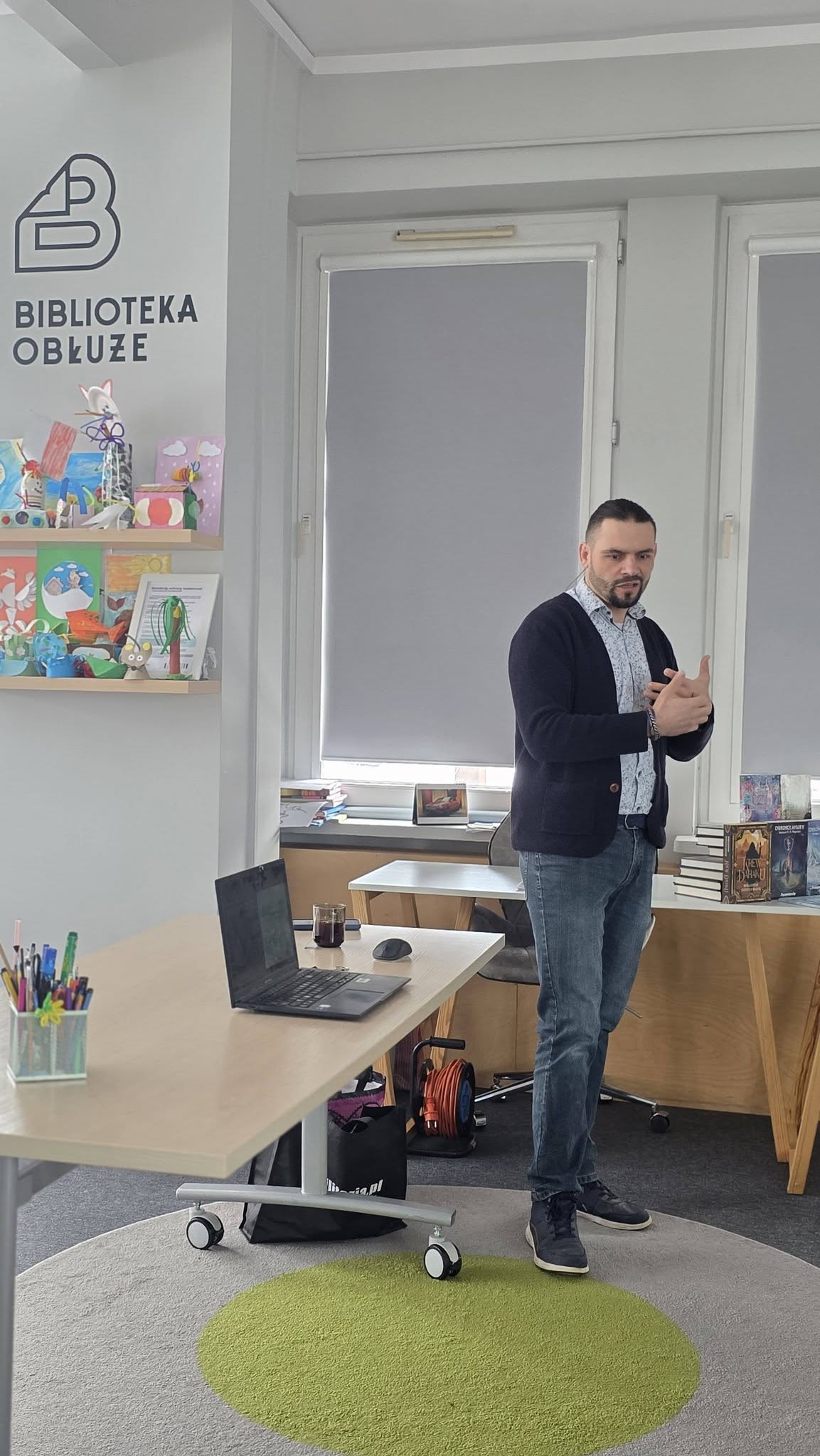 Dzięki współpracy Biblioteka z wiatrem w żaglach Szkoły Podstawowej nr 39 w Gdyni i naszej dzielnicowej Biblioteki Obłuże, uczniowie z klasy VIIa i VIIb uczestniczyli w warsztatach literackich pt. „Nie każdy bohater musi latać”. Na początku Pan Mateusz Rogalski z wykształcenia historyk, politolog, pedagog, pisarz książek fantazy, science fiction, kryminałów i bajek, opowiedział nam o swoich niesamowitych podróżach m.in. motocyklem i Koleją Transsyberyjską po Rosji i Indiach oraz przeżytych tam przygodach. Jego obserwacje i doświadczenia pozwalają mu tworzyć wyjątkowych bohaterów i fabuły książek. Zadanie przygotowane dla uczniów polegało na stworzeniu bohaterów literackich tj. elfy, krasnale, orki, trolle, gobliny oraz ludzi zgodnie z zasadami sesji RPG (role-playing game), w której podczas spotkania grupa osób wspólnie tworzona jest opowieść, a jej gracze wcielają się w wymyślonych bohaterów. Uczniowie pracowali na autorskich kartach postaci, w których o cechach wyglądu, charakteru, umiejętności i profesji losowo decydowały rzuty kośćmi ściennymi. Zajęcia wciągnęły do zabawy wszystkich uczniów, którzy stworzyli unikalnych, często nieidealnych, ale bardzo ciekawych bohaterów, snując ich dalsze losy. Spotkanie rozwijało wyobraźnię, kreatywne myślenie, pobudzało emocje i empatię, a młodzież wyszła z tych niecodziennych zajęć bardzo zadowolona, pełna pomysłów i dobrej energii.