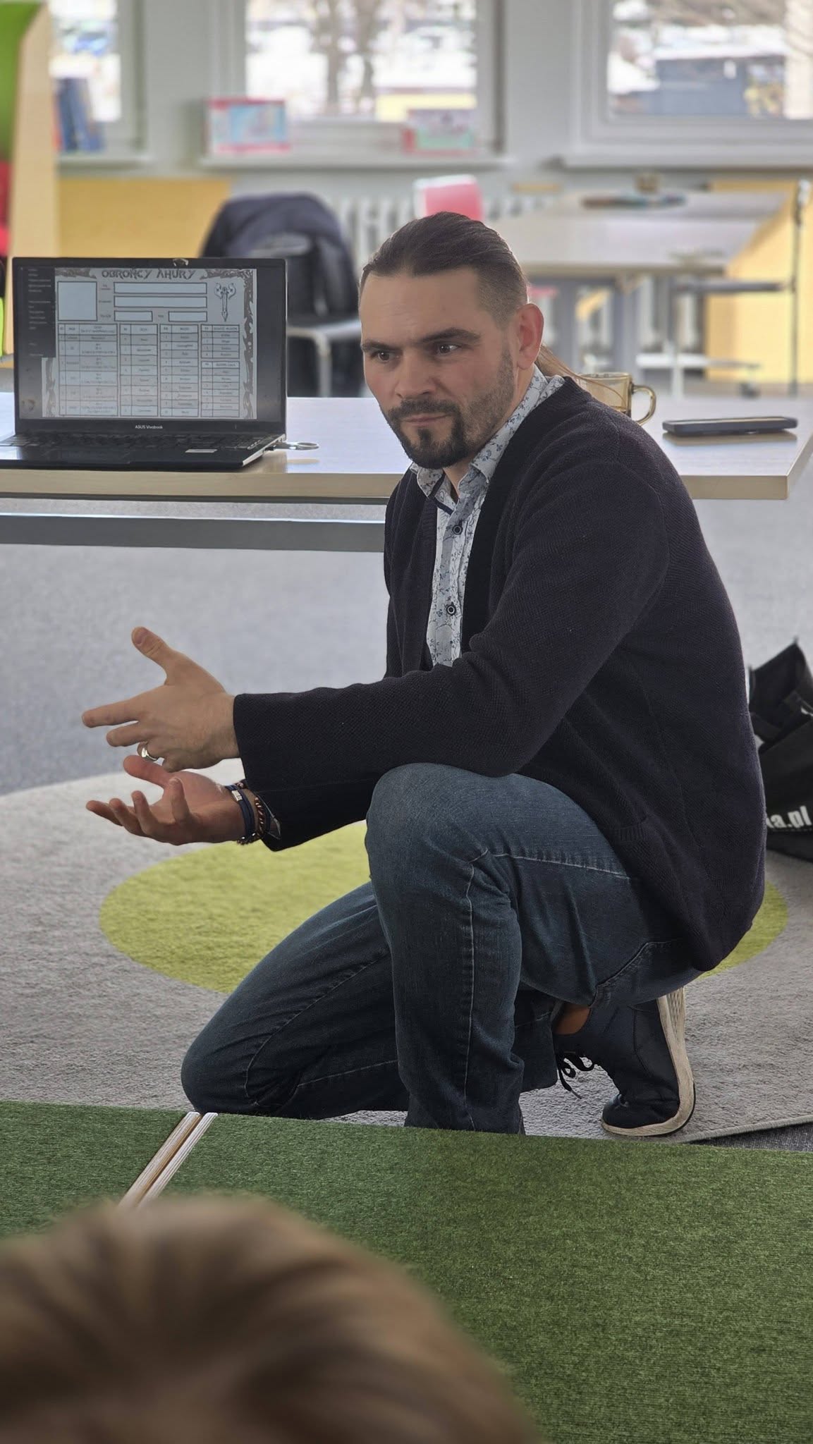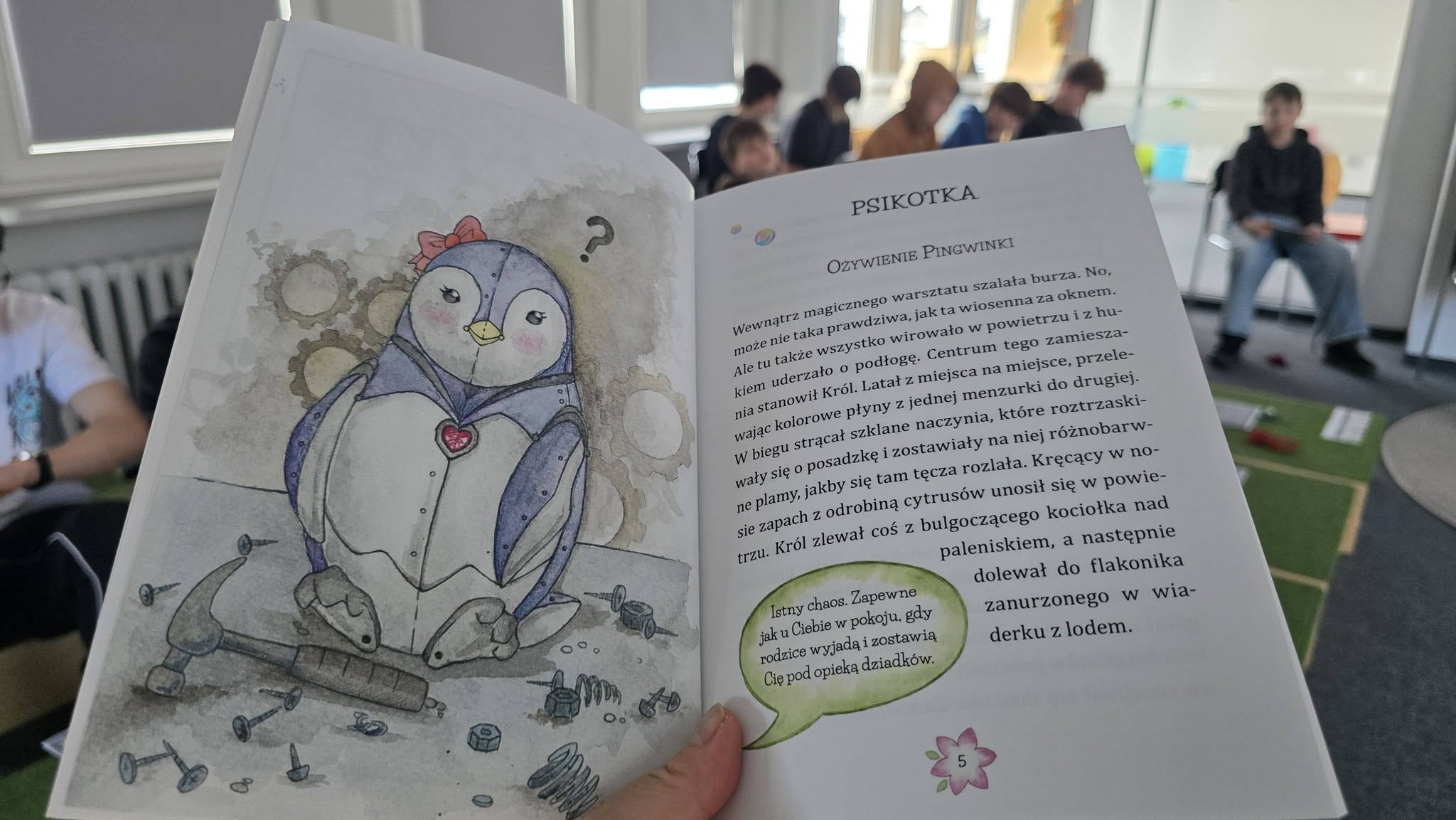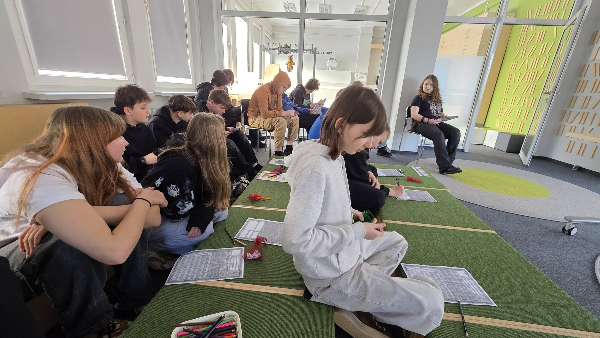 Dzięki współpracy Biblioteka z wiatrem w żaglach Szkoły Podstawowej nr 39 w Gdyni i naszej dzielnicowej Biblioteki Obłuże, uczniowie z klasy VIIa i VIIb uczestniczyli w warsztatach literackich pt. „Nie każdy bohater musi latać”. Na początku Pan Mateusz Rogalski z wykształcenia historyk, politolog, pedagog, pisarz książek fantazy, science fiction, kryminałów i bajek, opowiedział nam o swoich niesamowitych podróżach m.in. motocyklem i Koleją Transsyberyjską po Rosji i Indiach oraz przeżytych tam przygodach. Jego obserwacje i doświadczenia pozwalają mu tworzyć wyjątkowych bohaterów i fabuły książek. Zadanie przygotowane dla uczniów polegało na stworzeniu bohaterów literackich tj. elfy, krasnale, orki, trolle, gobliny oraz ludzi zgodnie z zasadami sesji RPG (role-playing game), w której podczas spotkania grupa osób wspólnie tworzona jest opowieść, a jej gracze wcielają się w wymyślonych bohaterów. Uczniowie pracowali na autorskich kartach postaci, w których o cechach wyglądu, charakteru, umiejętności i profesji losowo decydowały rzuty kośćmi ściennymi. Zajęcia wciągnęły do zabawy wszystkich uczniów, którzy stworzyli unikalnych, często nieidealnych, ale bardzo ciekawych bohaterów, snując ich dalsze losy. Spotkanie rozwijało wyobraźnię, kreatywne myślenie, pobudzało emocje i empatię, a młodzież wyszła z tych niecodziennych zajęć bardzo zadowolona, pełna pomysłów i dobrej energii.