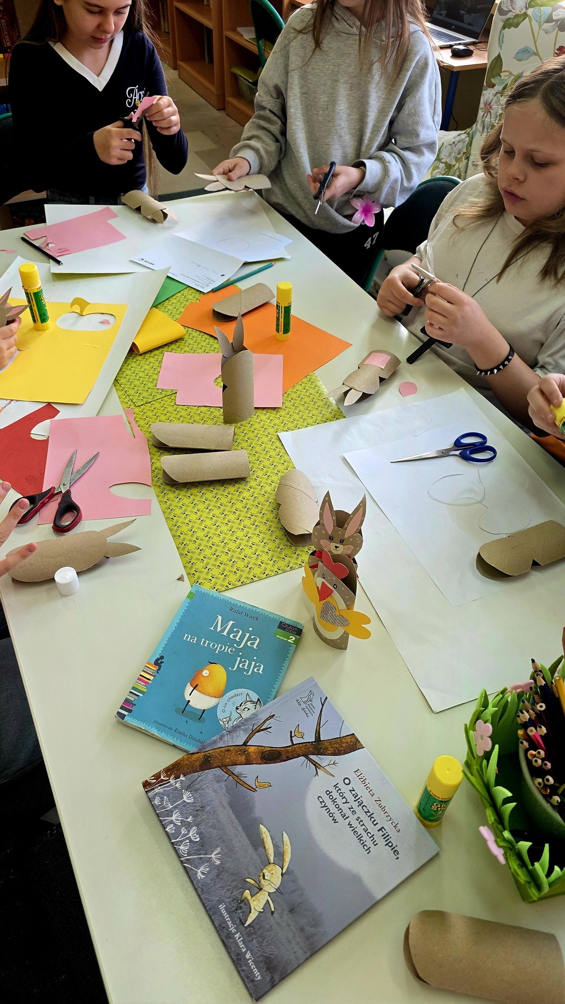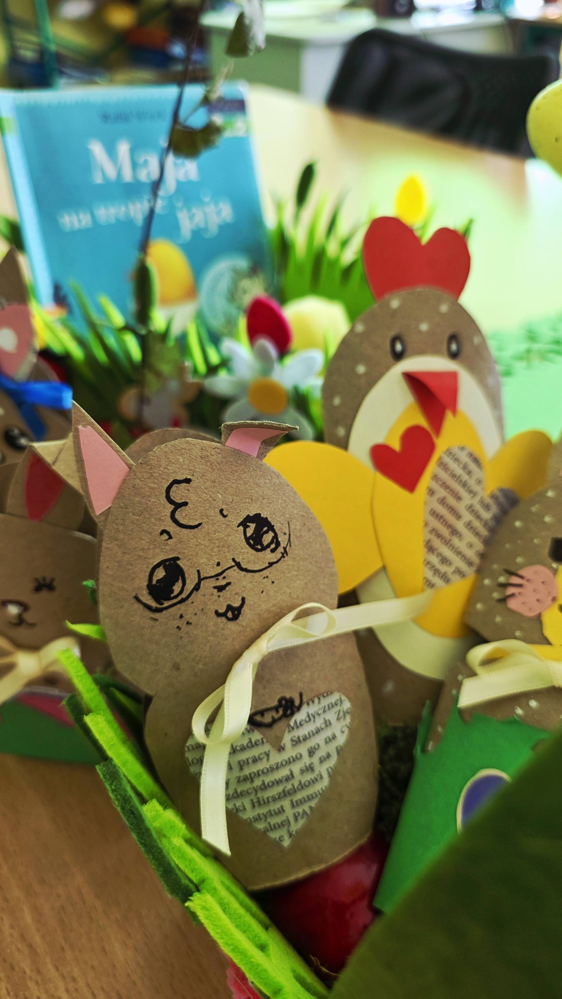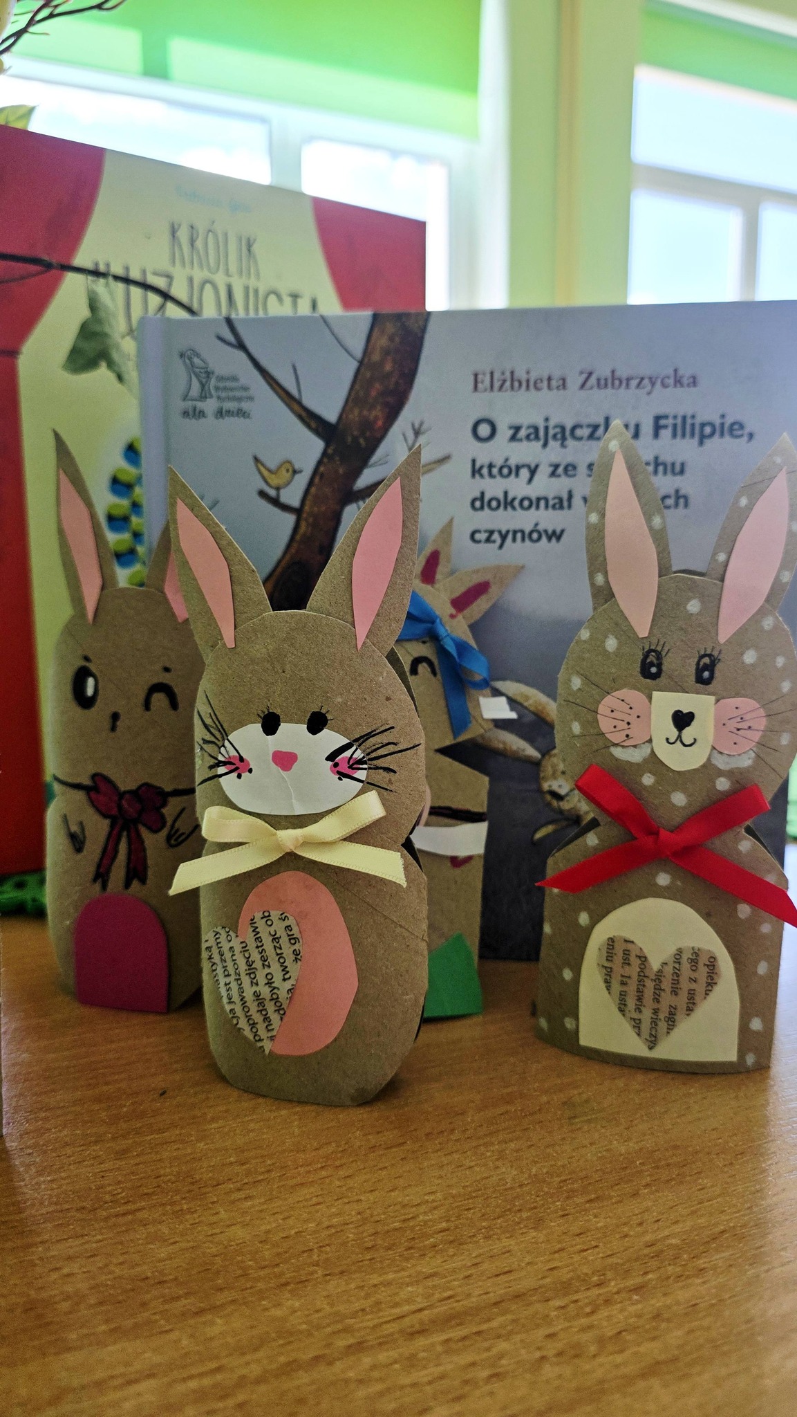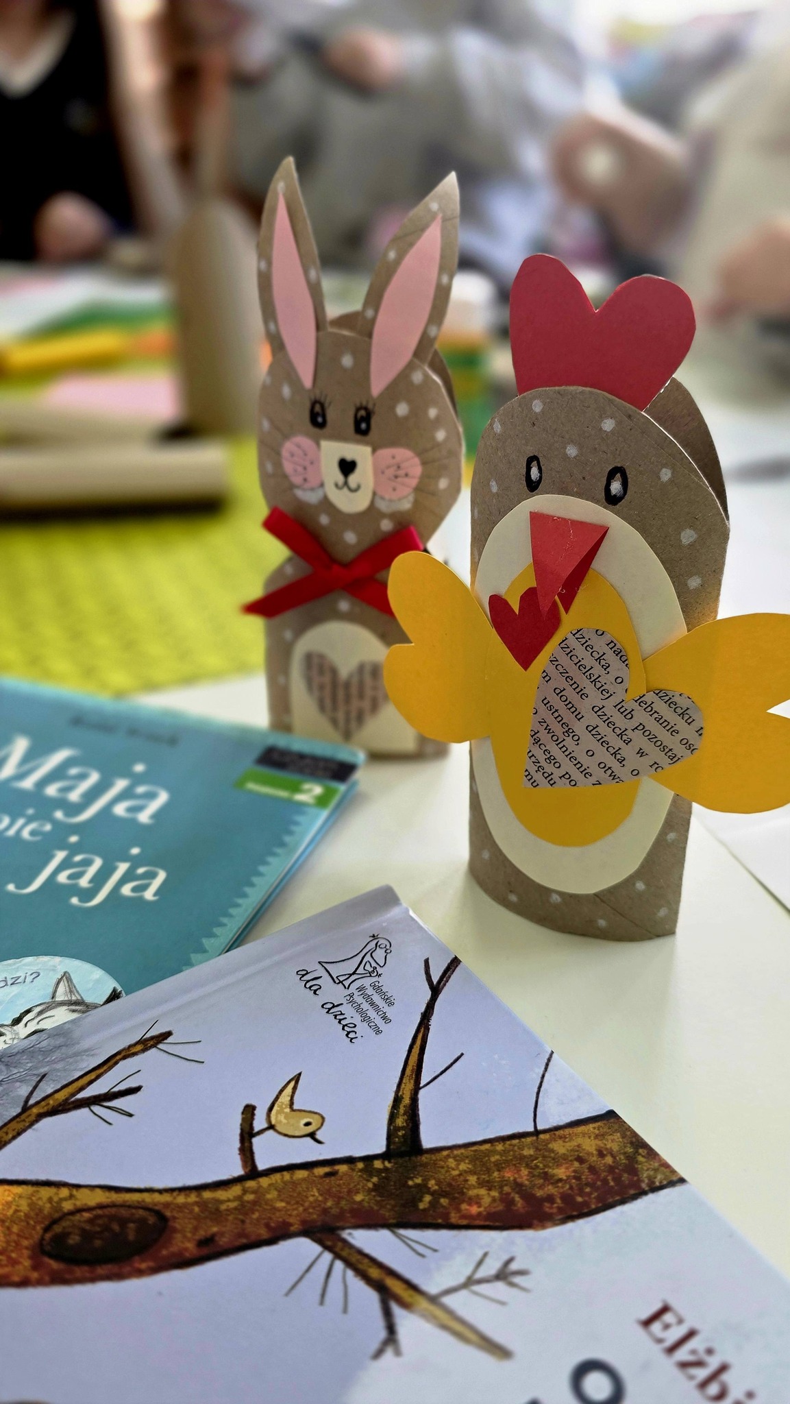 Ponieważ wielkimi krokami zbliżają się do nas Święta Wielkanocne, w czytelni i wypożyczalni odbyły się dla uczniów warsztaty plastyczne połączone z cztaniem książek. Dzieci przygotowały kurczaczki i zajączki z papierowych roleki i kolorowych papierów, słuchając fragmentów książki "Maja na tropie jaja" i "Jak zajączki dokonał ze strachu wielkich czynów". Nasze czytelniczki również dokonały podczas spotkania nadzwyczajnej rzeczy, przygotowując przepiękne, oryginalne prace plastyczne, które stały się elementem wystroju biblioteki, a także zajączkowymi prezentami dla najbliższych..
