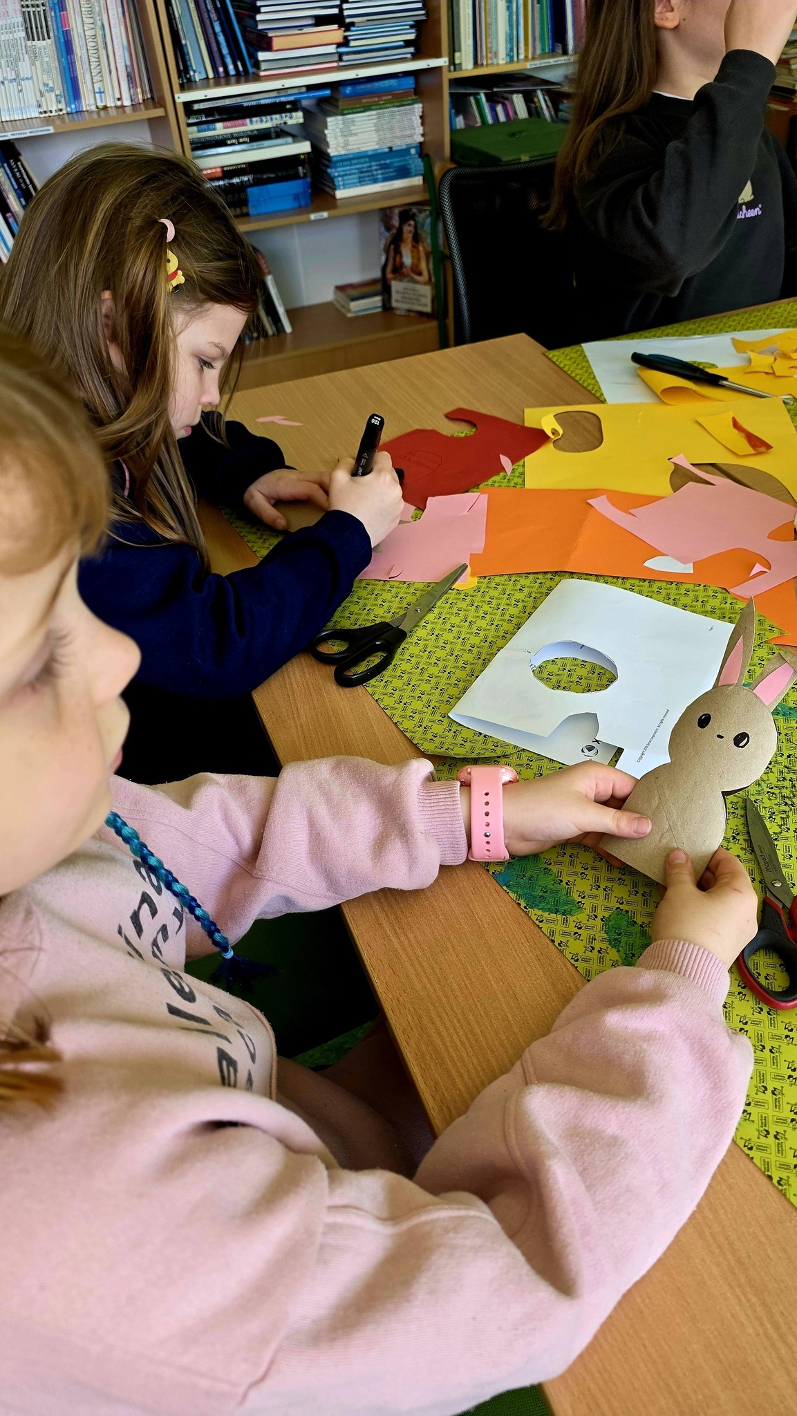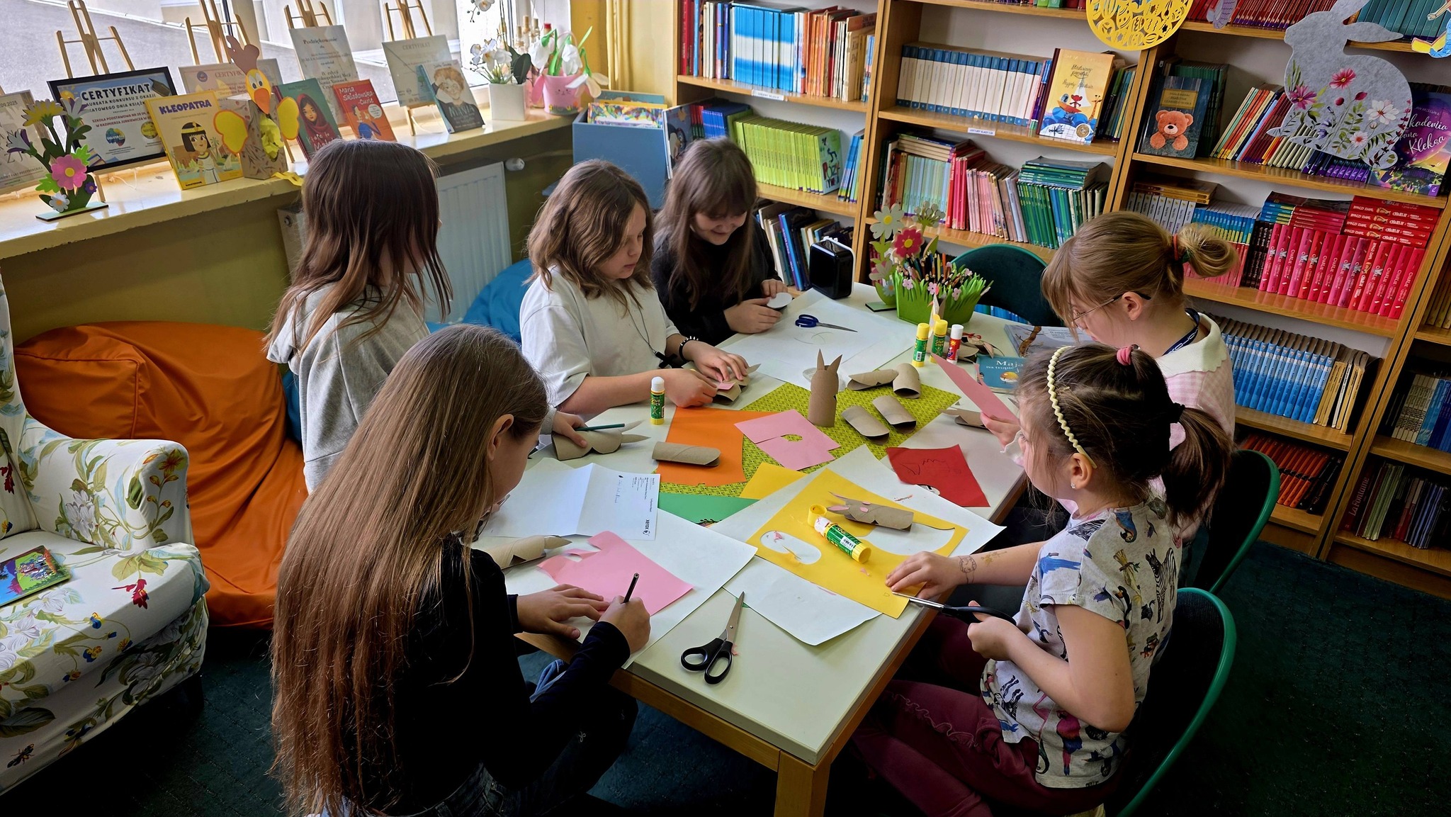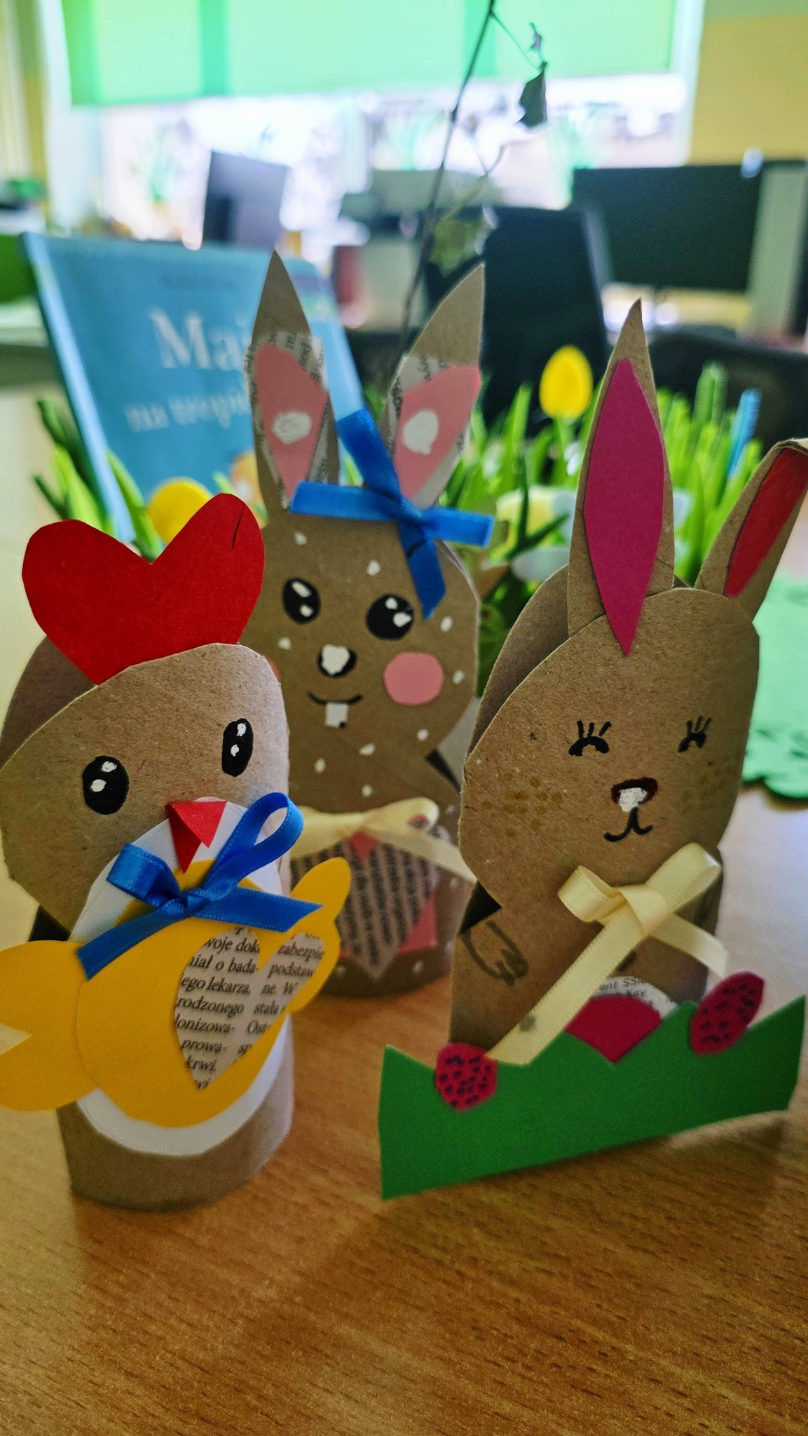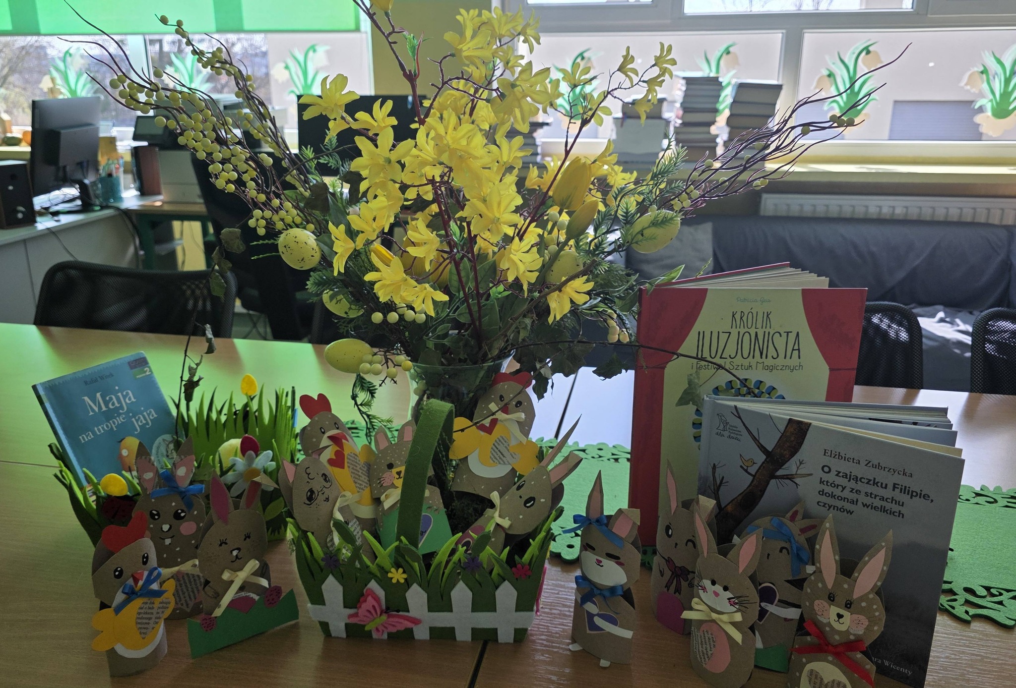 Ponieważ wielkimi krokami zbliżają się do nas Święta Wielkanocne, w czytelni i wypożyczalni odbyły się dla uczniów warsztaty plastyczne połączone z cztaniem książek. Dzieci przygotowały kurczaczki i zajączki z papierowych roleki i kolorowych papierów, słuchając fragmentów książki "Maja na tropie jaja" i "Jak zajączki dokonał ze strachu wielkich czynów". Nasze czytelniczki również dokonały podczas spotkania nadzwyczajnej rzeczy, przygotowując przepiękne, oryginalne prace plastyczne, które stały się elementem wystroju biblioteki, a także zajączkowymi prezentami dla najbliższych..