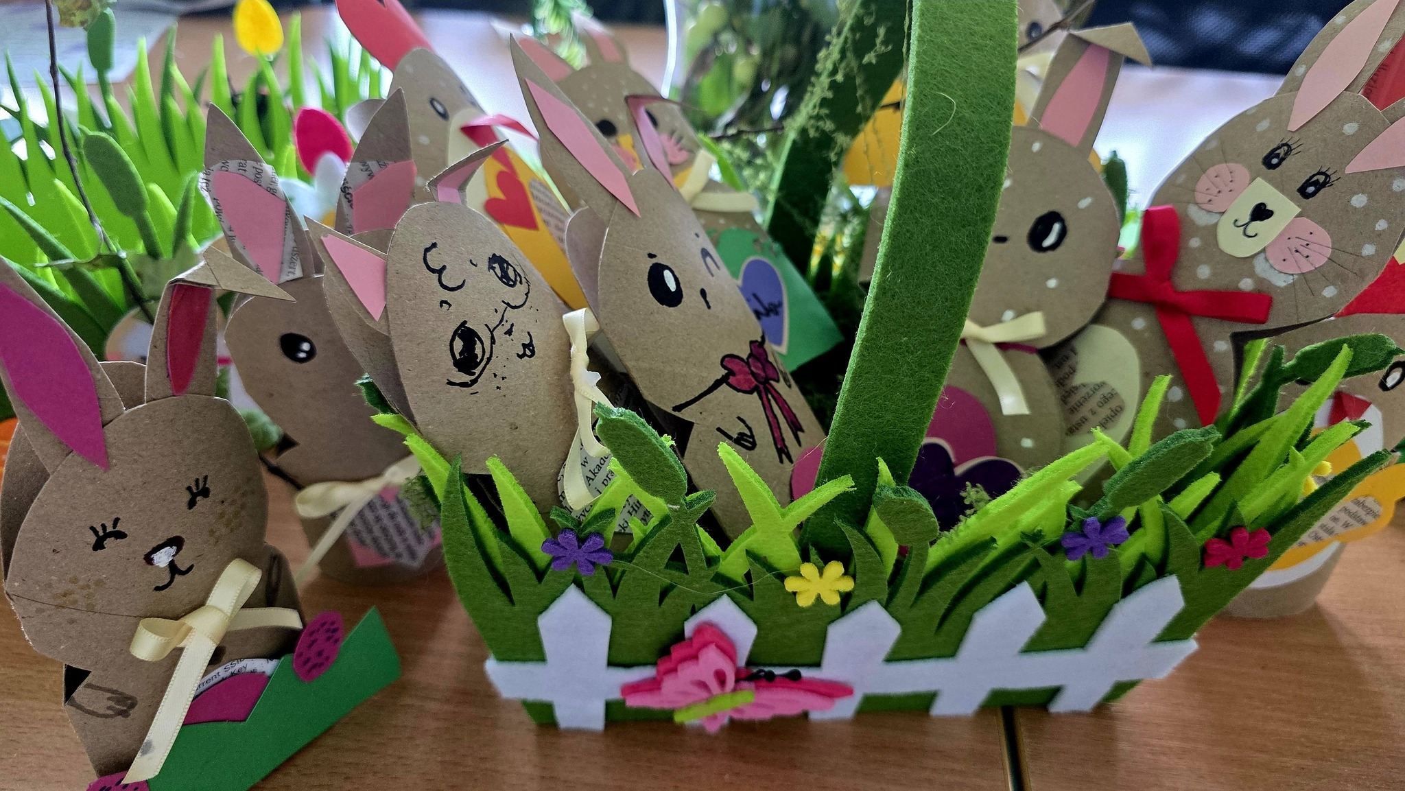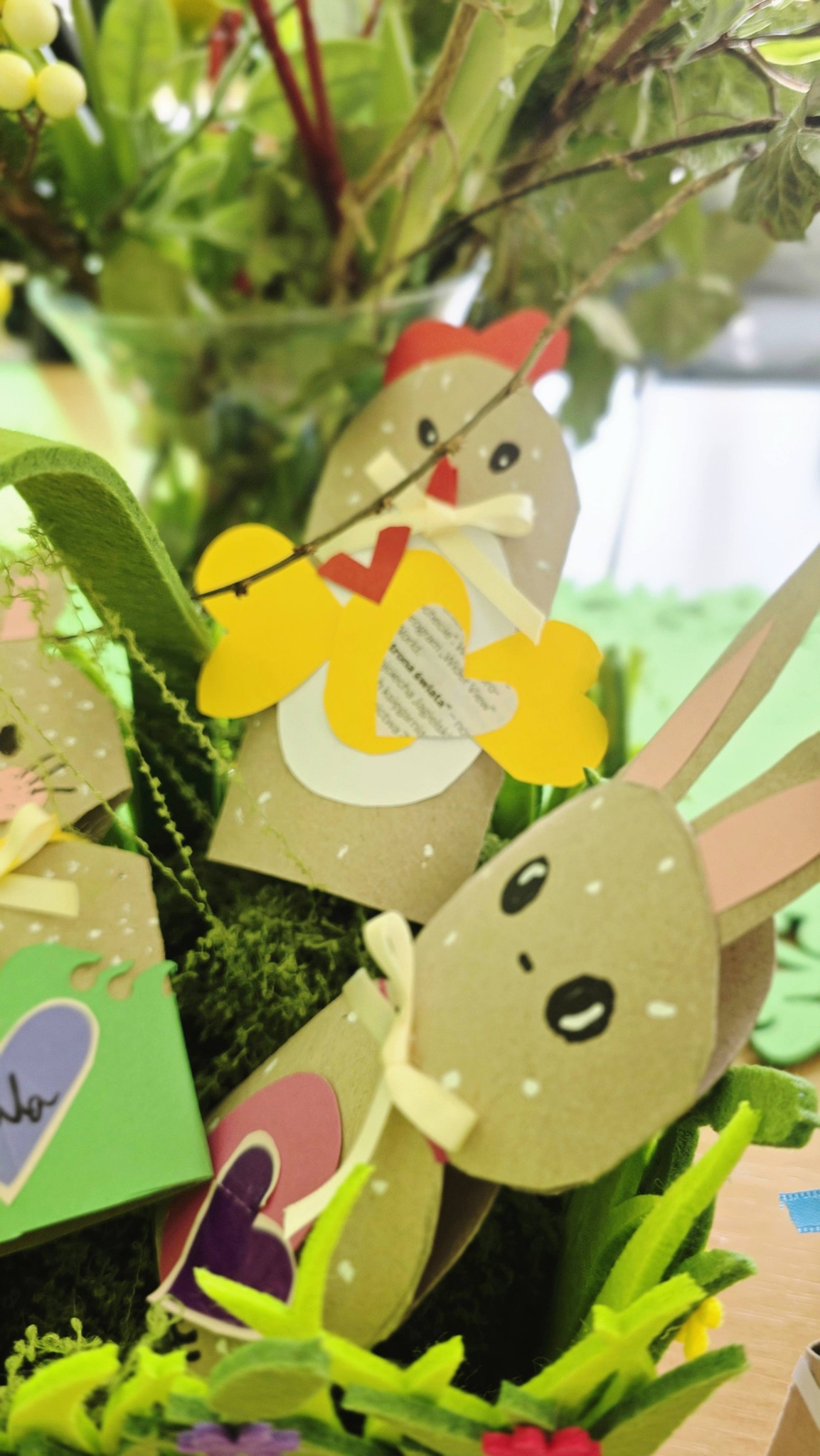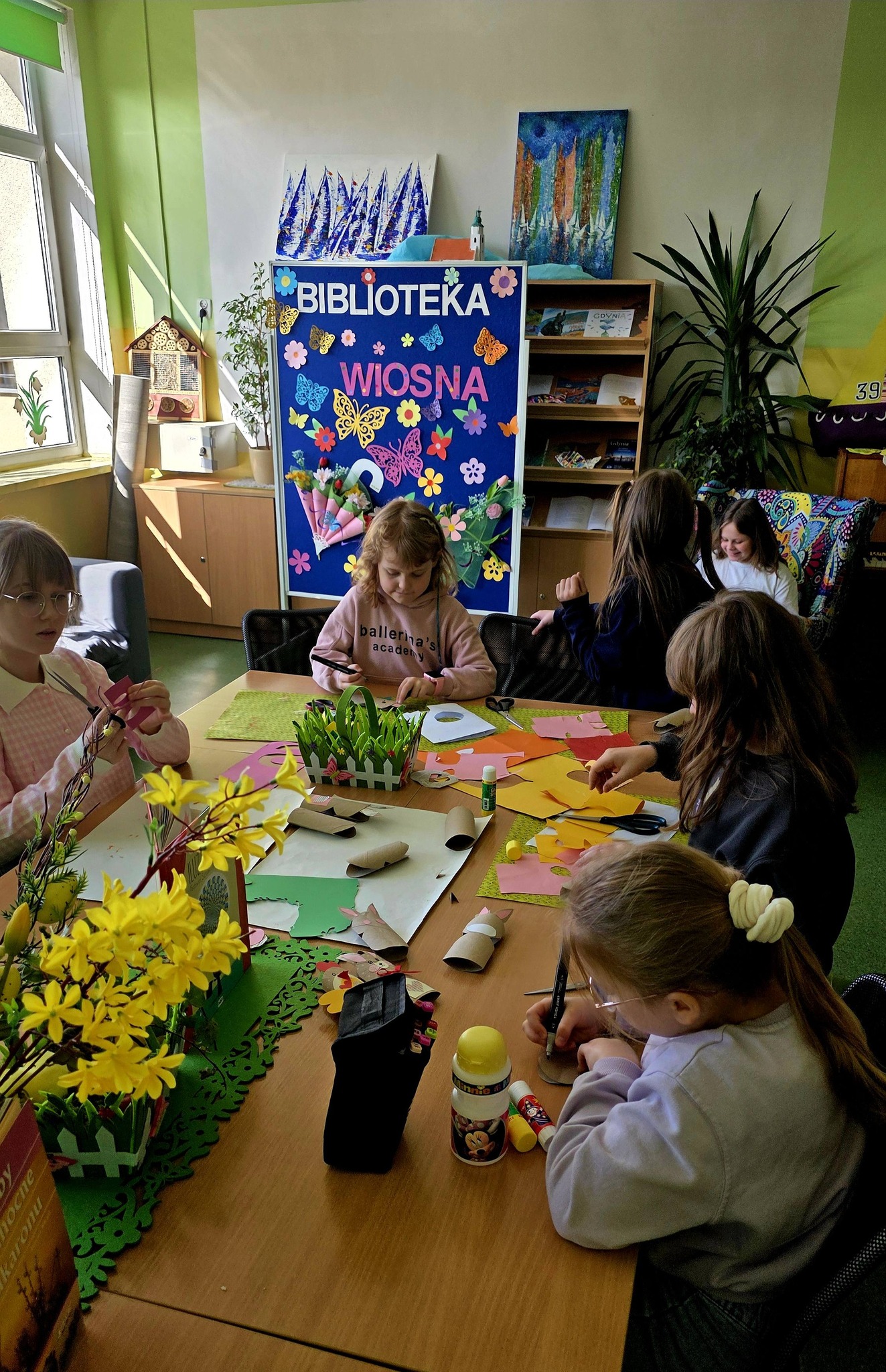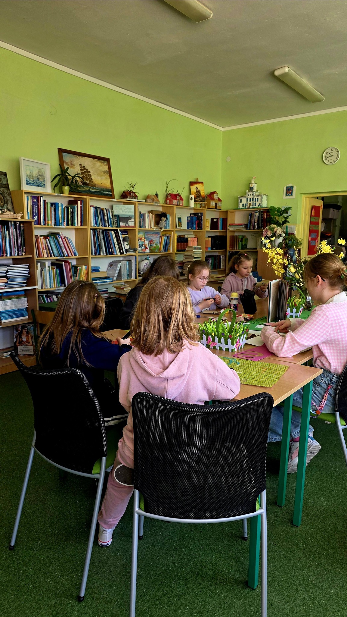 Ponieważ wielkimi krokami zbliżają się do nas Święta Wielkanocne, w czytelni i wypożyczalni odbyły się dla uczniów warsztaty plastyczne połączone z cztaniem książek. Dzieci przygotowały kurczaczki i zajączki z papierowych roleki i kolorowych papierów, słuchając fragmentów książki "Maja na tropie jaja" i "Jak zajączki dokonał ze strachu wielkich czynów". Nasze czytelniczki również dokonały podczas spotkania nadzwyczajnej rzeczy, przygotowując przepiękne, oryginalne prace plastyczne, które stały się elementem wystroju biblioteki, a także zajączkowymi prezentami dla najbliższych..