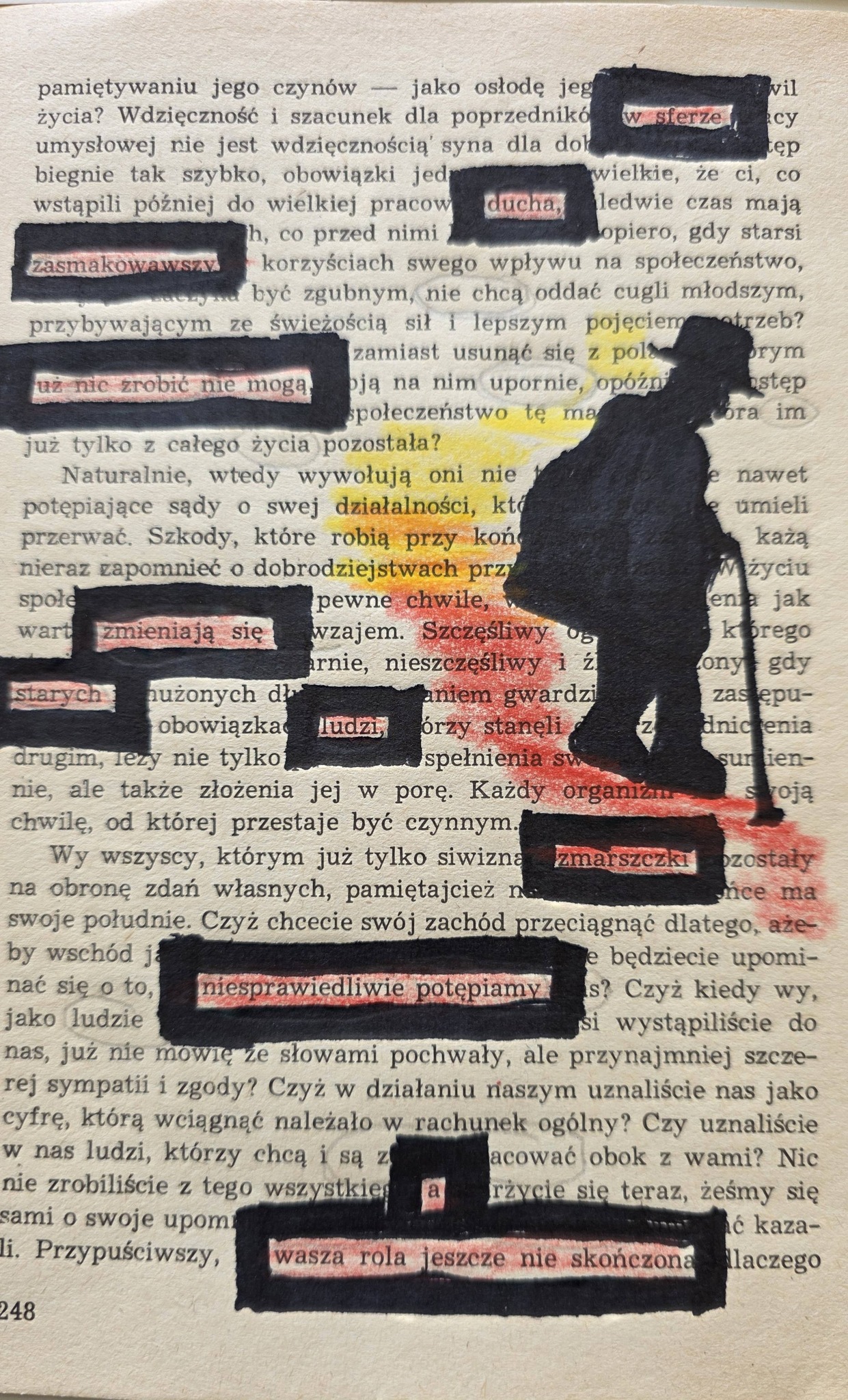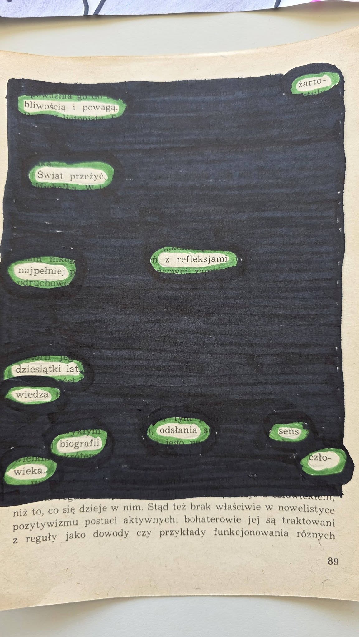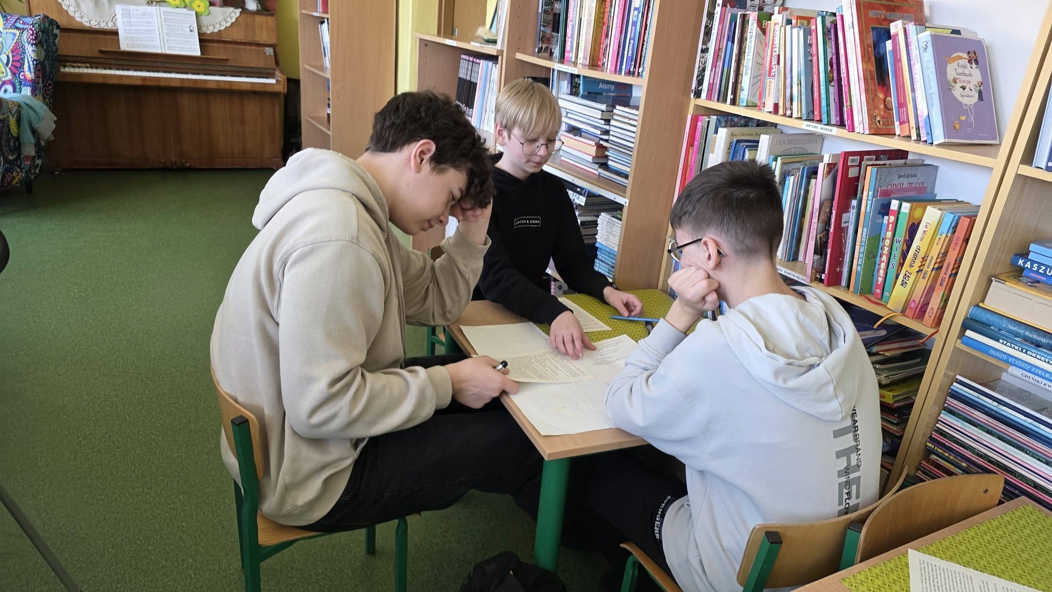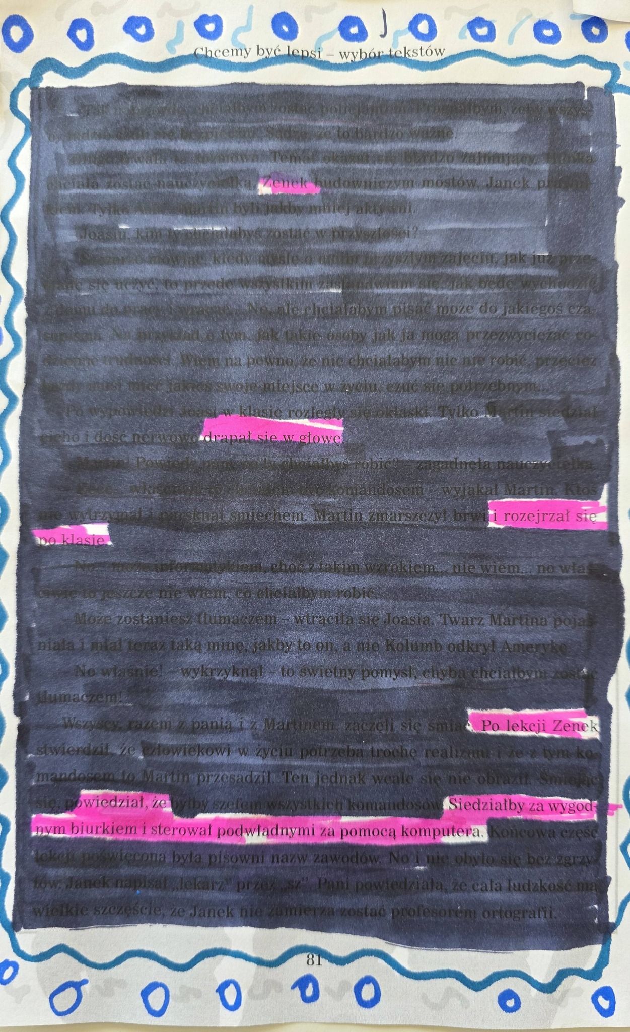 Podczas lekcji bibliotecznej prowadzonej przez Panią Alicję uczniowie kl. VIIIa, zmierzyli się z niecodziennym wyzwaniem - techniką Blackout Poetry. To forma twórczej zabawy, którą można przetłumaczyć jako „poezję zaciemnienia”, polegająca na tworzeniu nowych tekstów poprzez selekcję i wykreślanie słów z już istniejących artykułów, starych książek czy gazet.