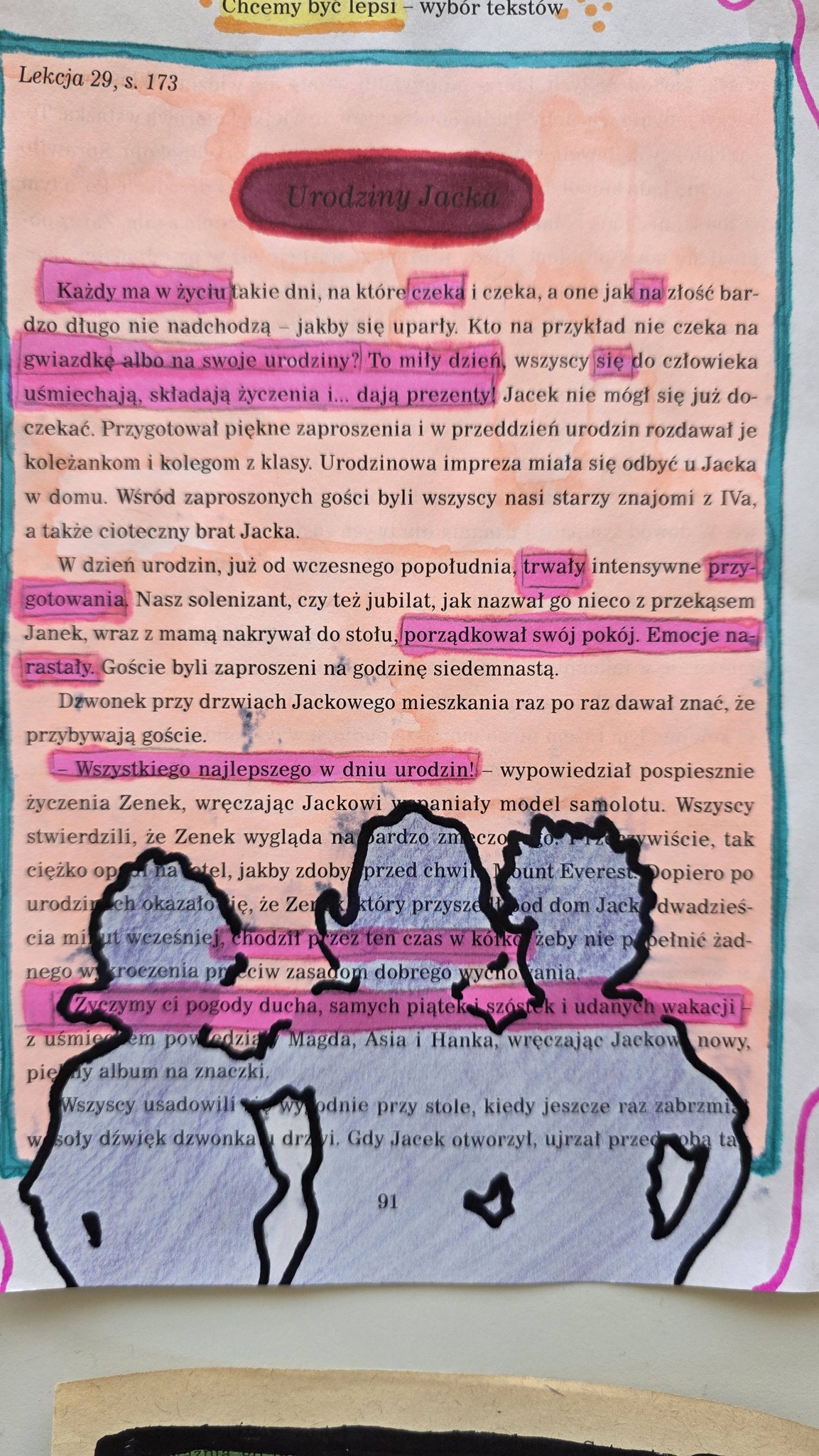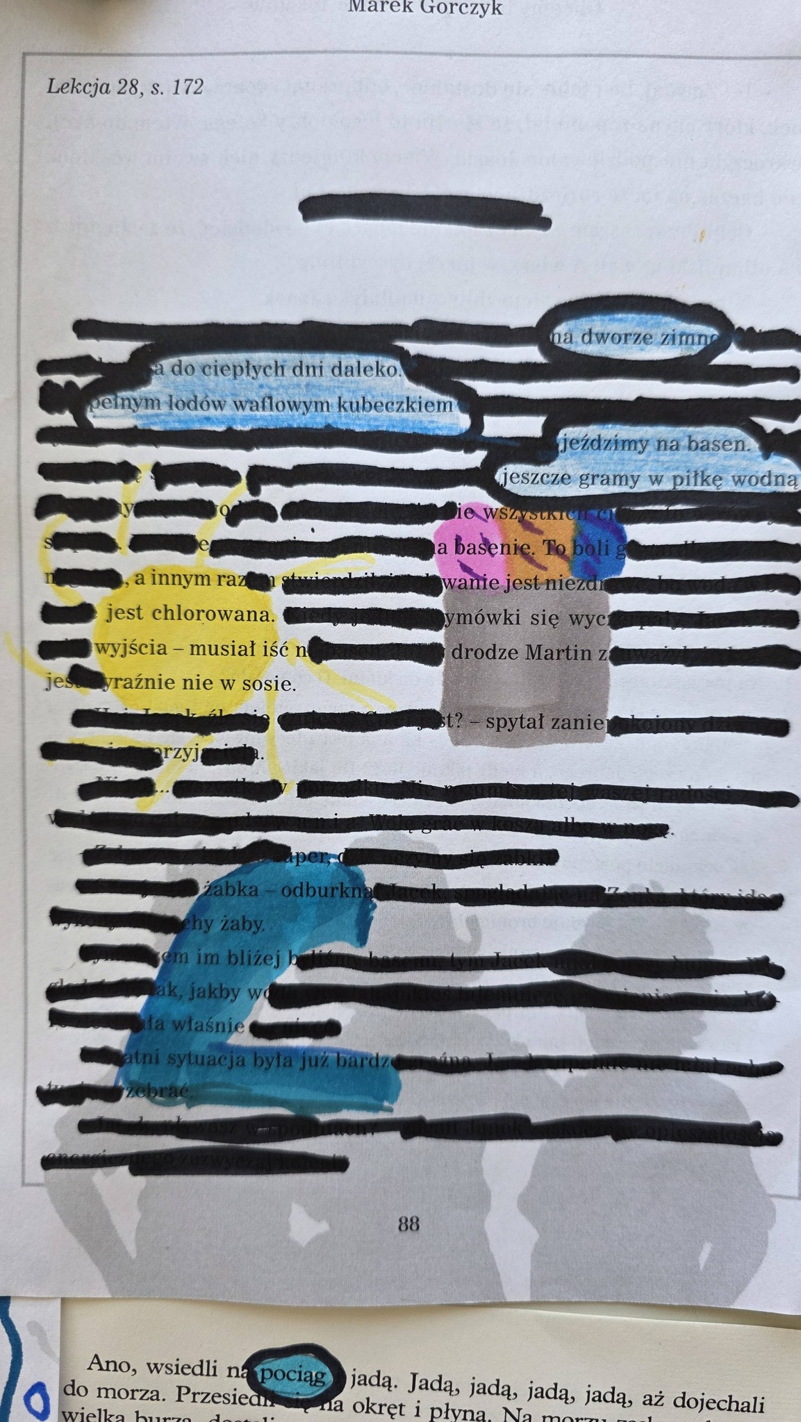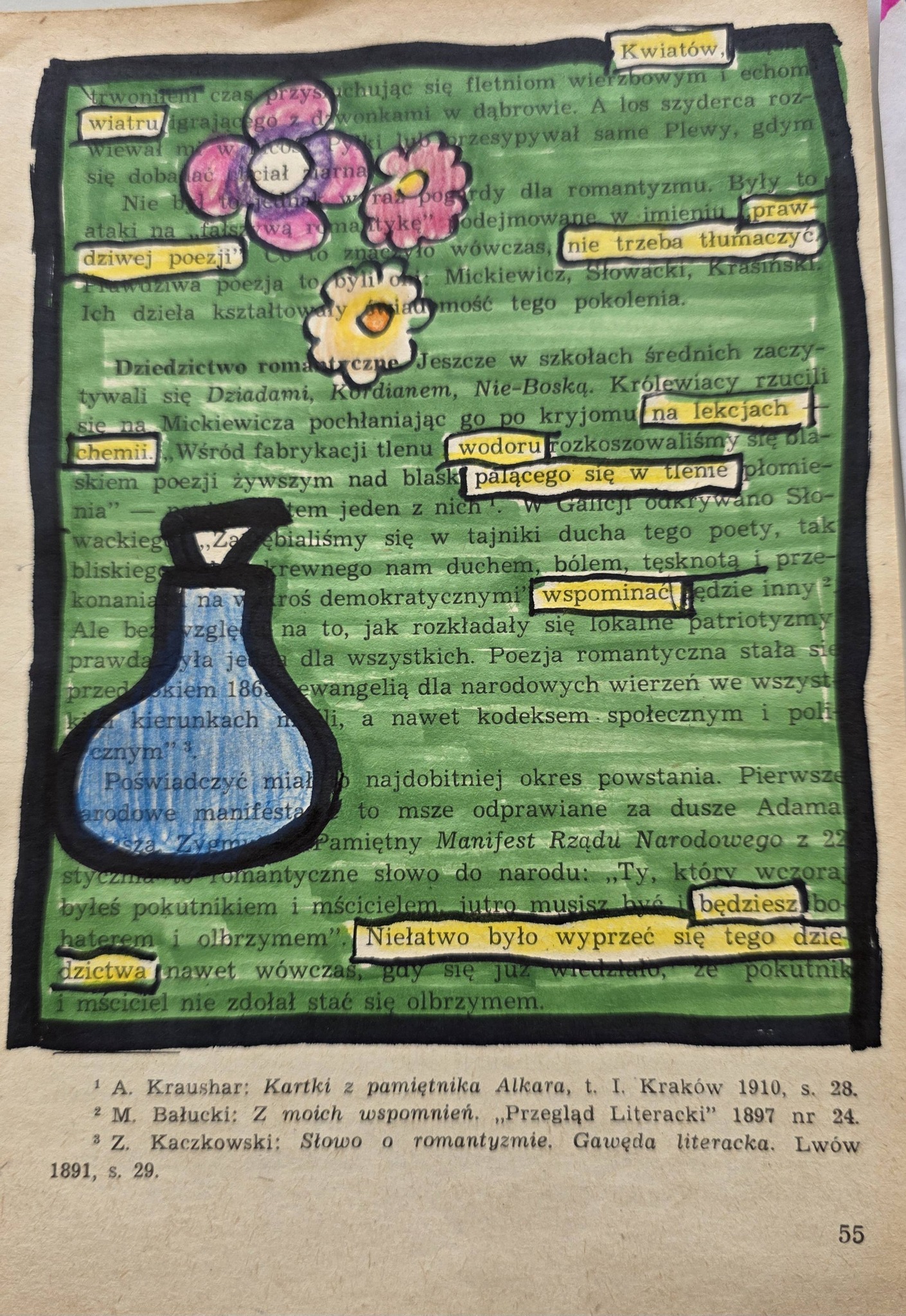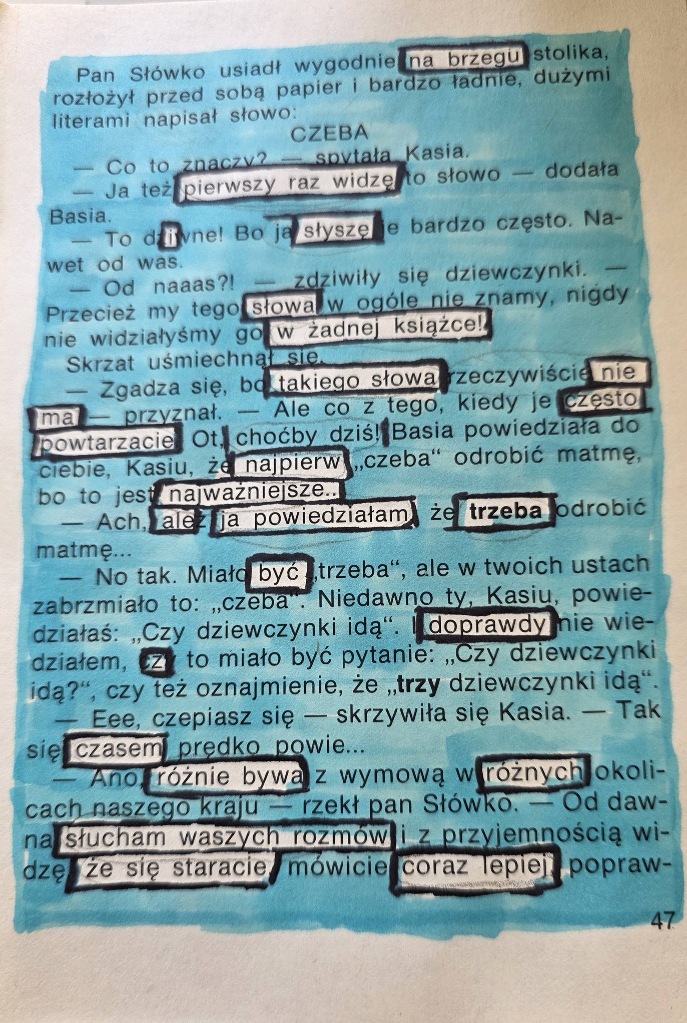 Podczas lekcji bibliotecznej prowadzonej przez Panią Alicję uczniowie kl. VIIIa, zmierzyli się z niecodziennym wyzwaniem - techniką Blackout Poetry. To forma twórczej zabawy, którą można przetłumaczyć jako „poezję zaciemnienia”, polegająca na tworzeniu nowych tekstów poprzez selekcję i wykreślanie słów z już istniejących artykułów, starych książek czy gazet.