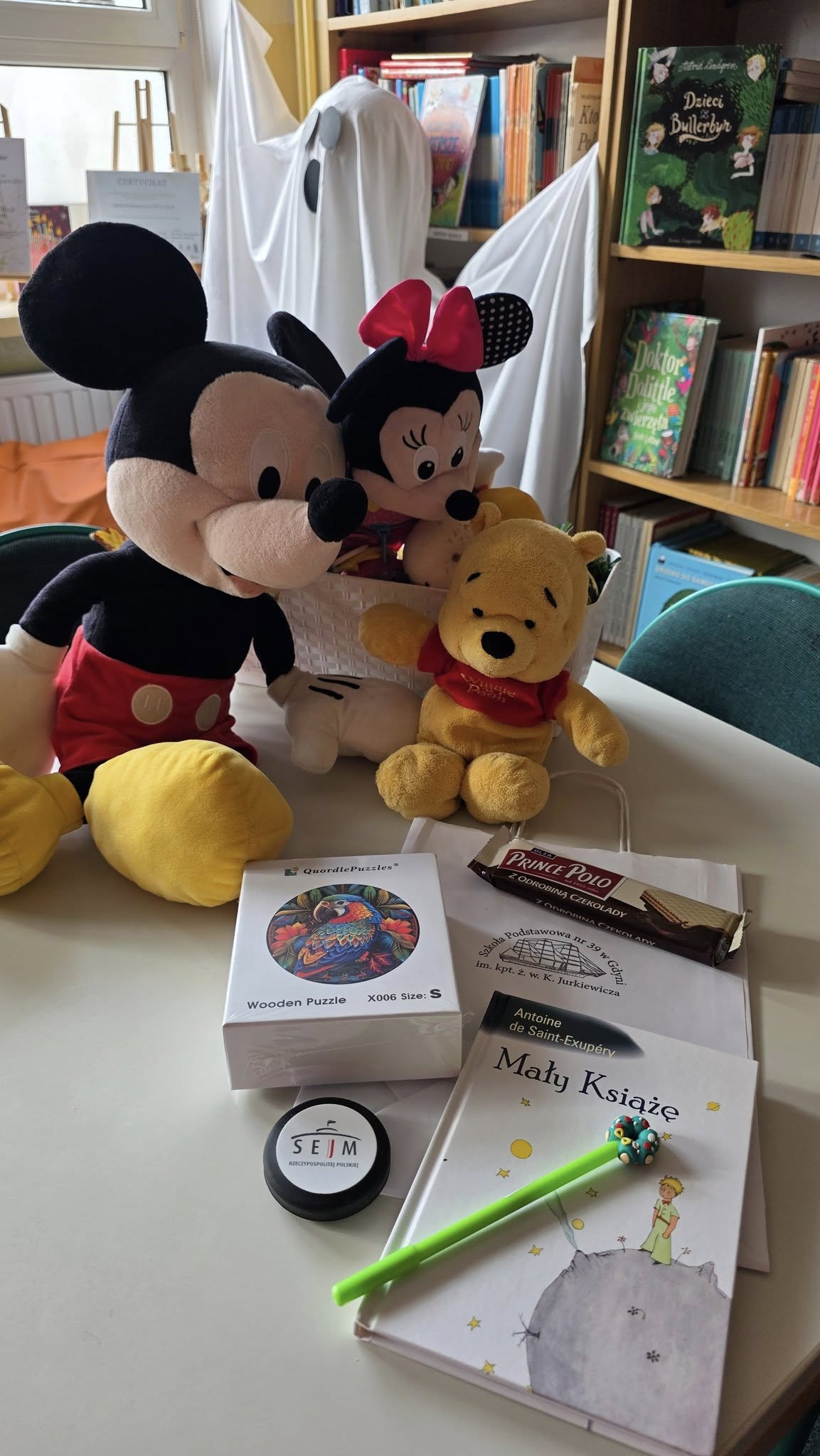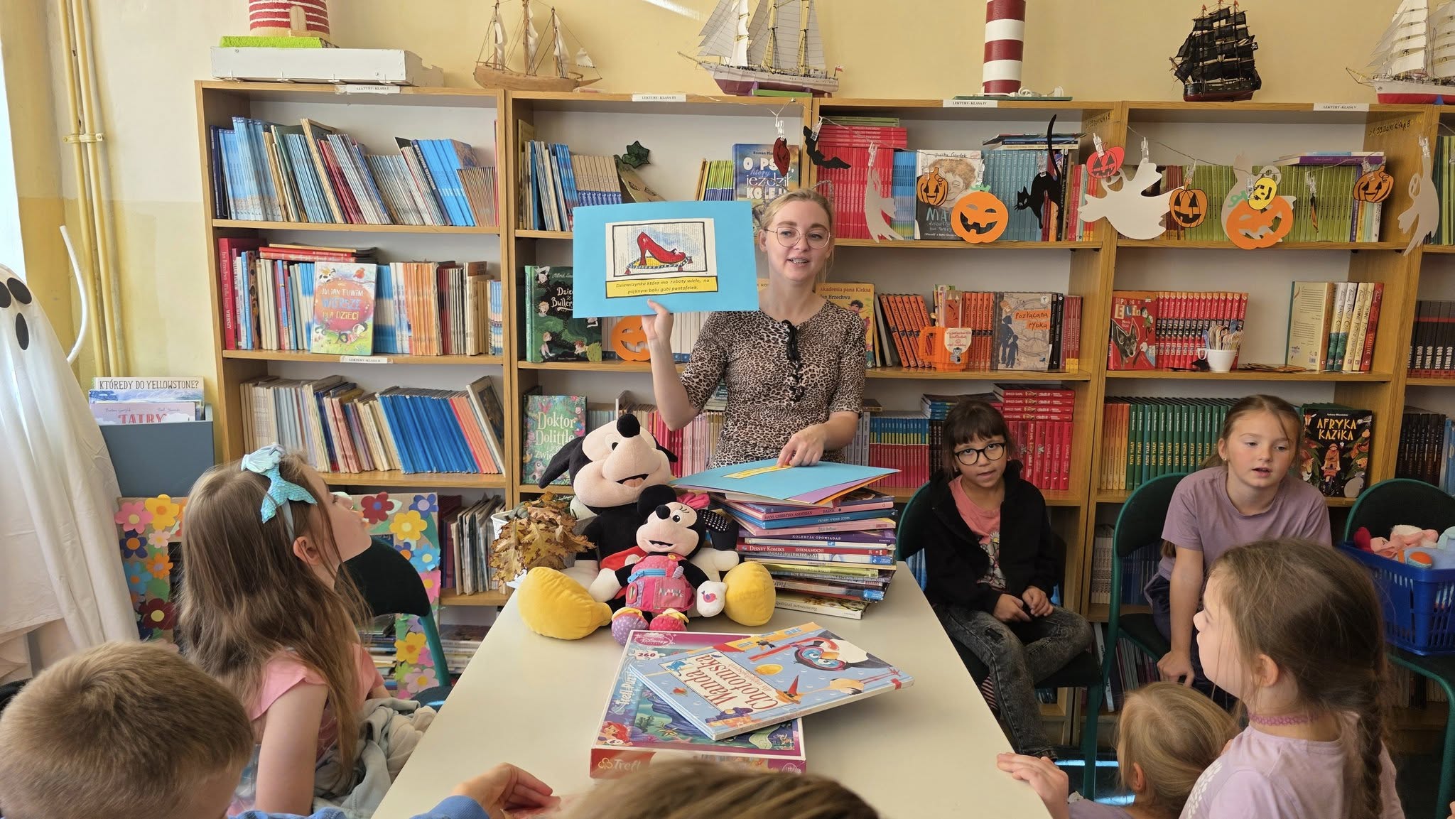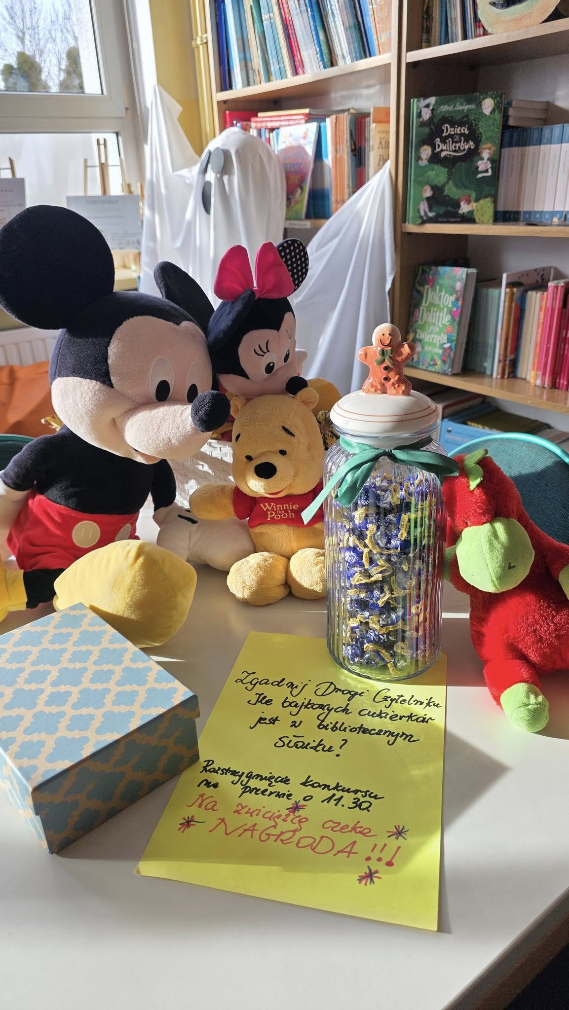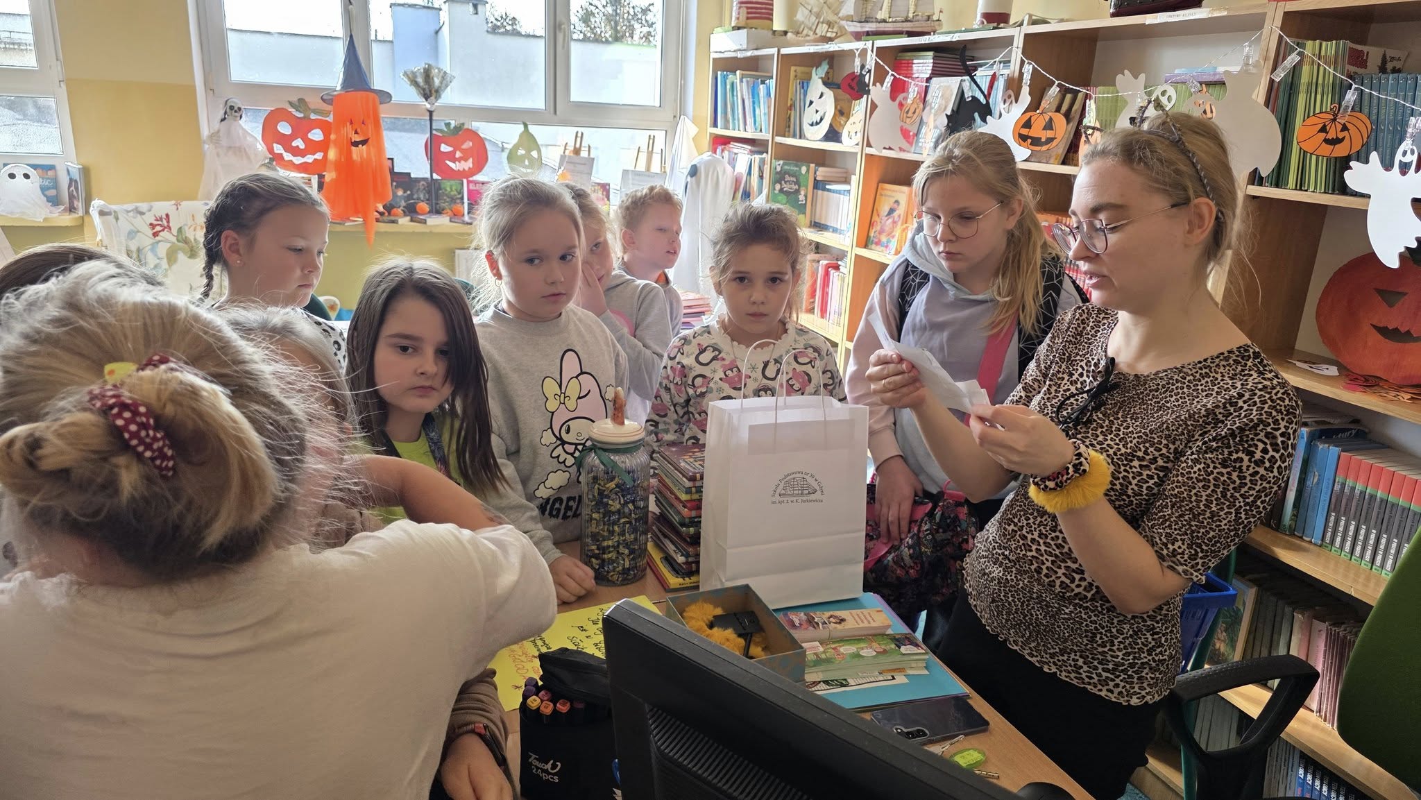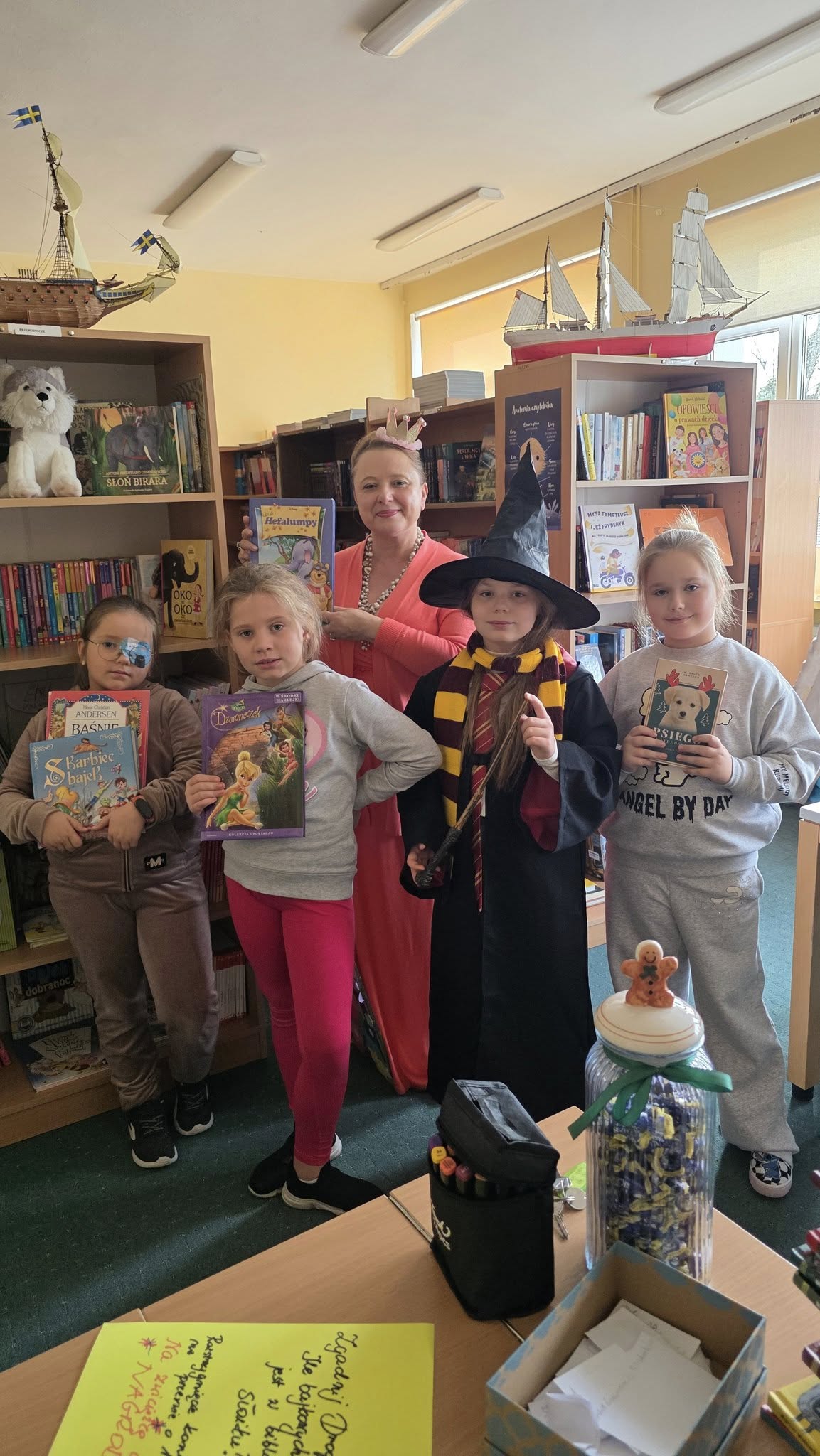 Nasza biblioteka zamieniła się dzisiaj w miejsce pełne wesołości i śmiechu, bowiem w nasze progi przybyły bajkowe postacie m.in. Mała Syrenka, Kot w butach, Spider-Man, Hermiona z Hogwartu. Czytaliśmy bajkę i układaliśmy puzzle pt. ”Mała syrenka” , wypisaliśmy naszych ulubionych bajkowych i baśniowych bohaterów, uczniowie szacowali ile cukierków (dar Rady Rodziców) było w bajkowym słoiku, a zwyciężczyni otrzymała w nagrodę książkę pt. „Mały książę”, słuchawki i długopis ufundowane przez bibliotekę. Ponadto klasa Ic wraz z Panią Kornelią i Panią Joanną przybyły na lekcję biblioteczną, podczas której uczniowie zapoznali się z zasadami funkcjonowania biblioteki szkolnej rozpoznawali bajkowe rekwizyty i rozwiązywali zagadki oraz opowiedzieli o swoich ulubionych bajkach i baśniach, otrzymując na koniec spotkania pamiątkowe zakładki do książek. Dzieci z radością pozowały do zdjęć z Panią bibliotekarką Alicją i nową Panią bibliotekarką Kamilą. Fantastycznie spędziliśmy ten wspólny magiczny czas.