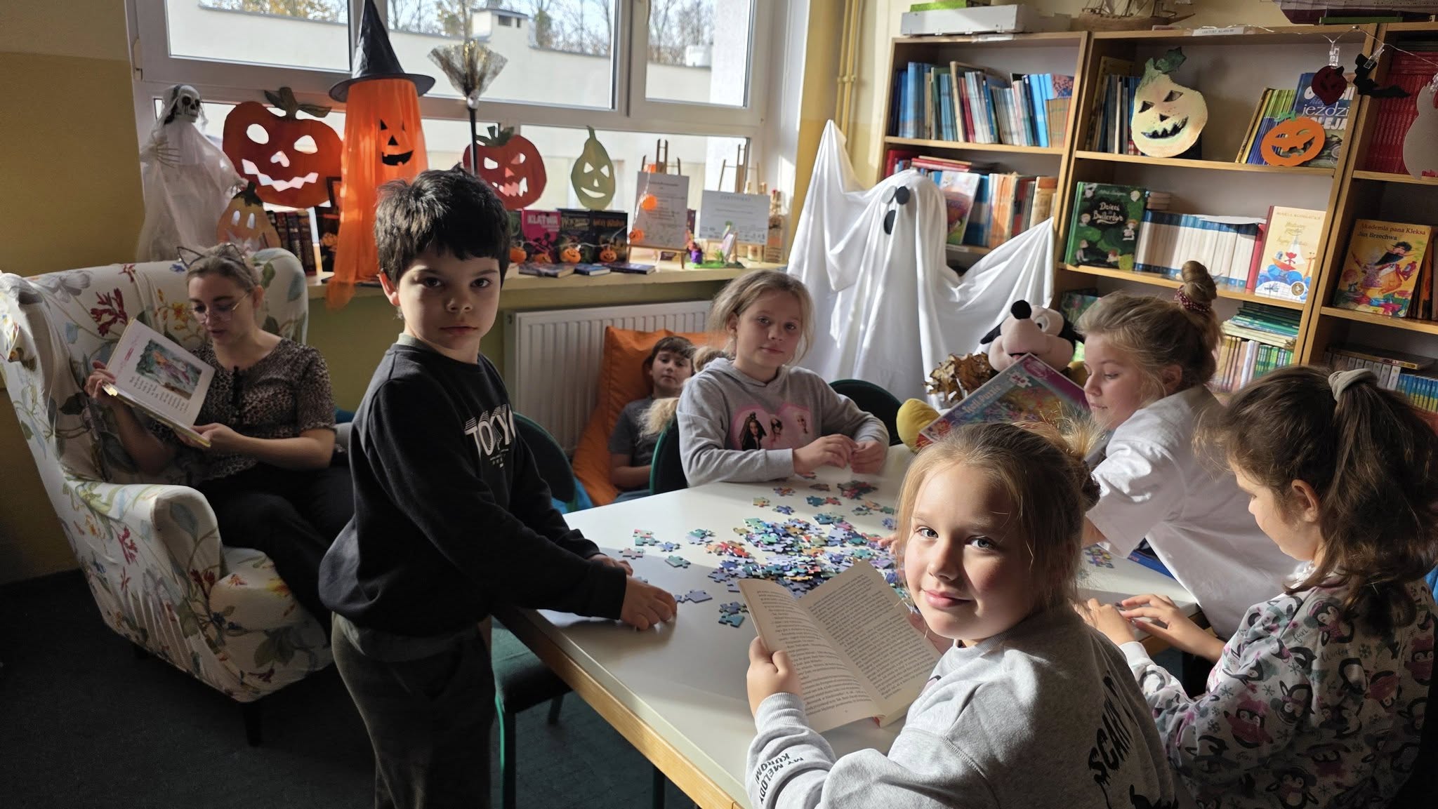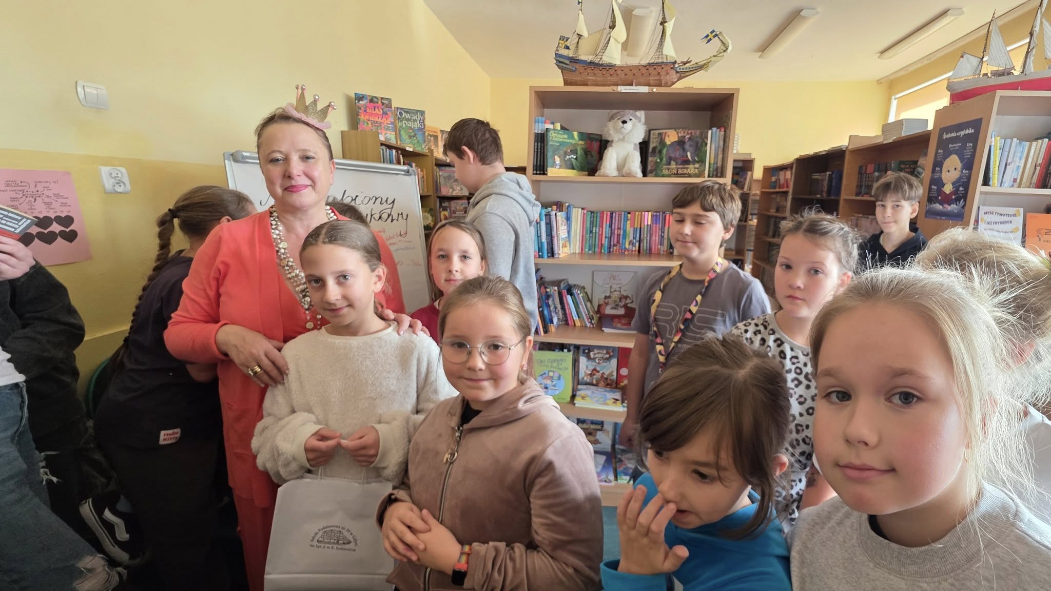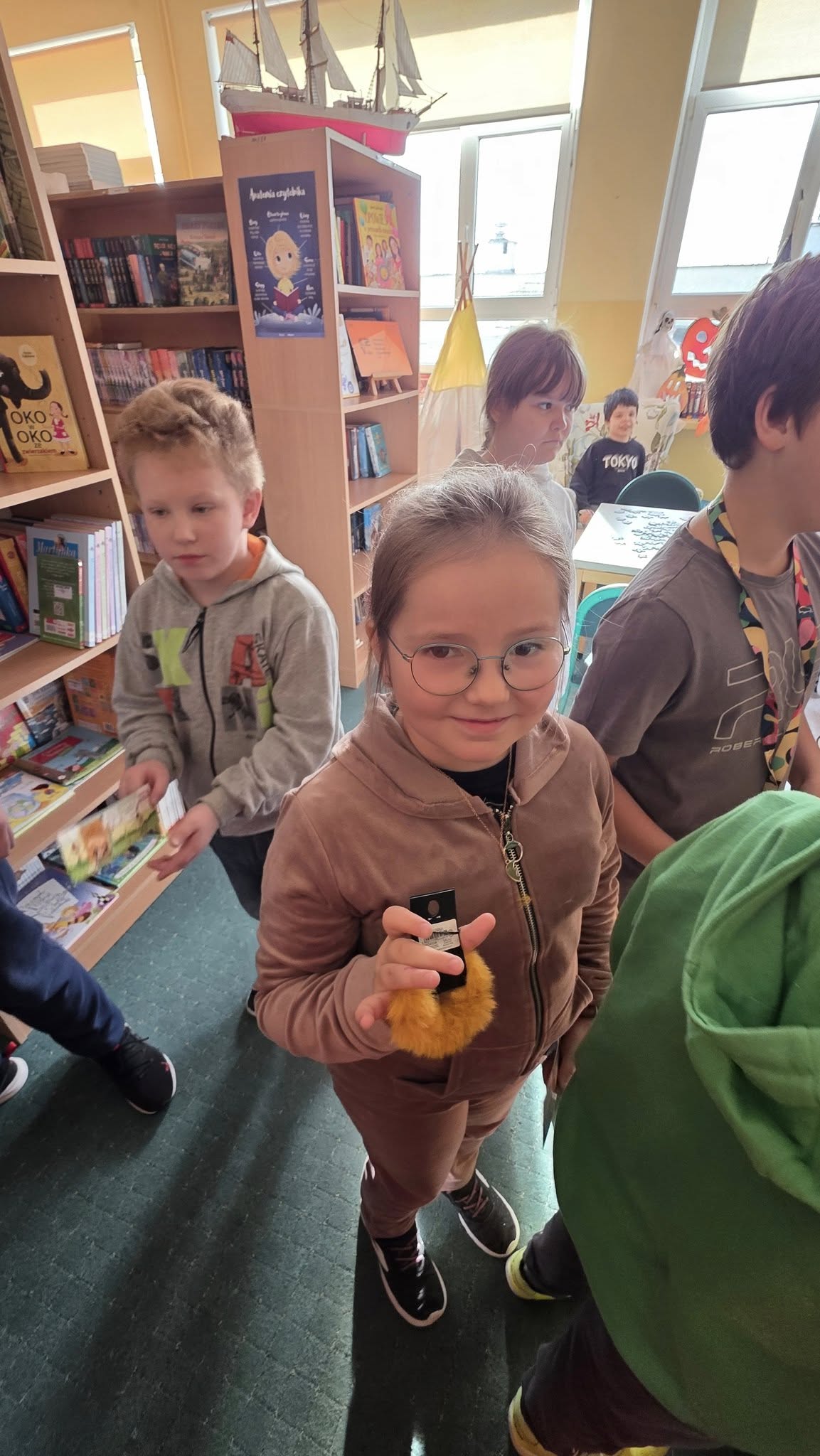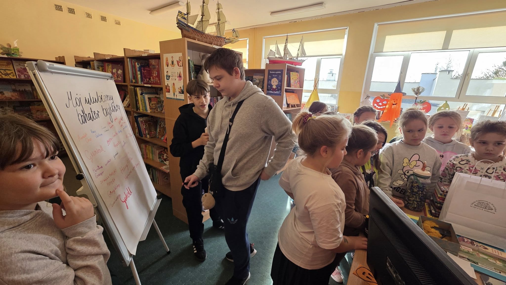 Nasza biblioteka zamieniła się dzisiaj w miejsce pełne wesołości i śmiechu, bowiem w nasze progi przybyły bajkowe postacie m.in. Mała Syrenka, Kot w butach, Spider-Man, Hermiona z Hogwartu. Czytaliśmy bajkę i układaliśmy puzzle pt. ”Mała syrenka” , wypisaliśmy naszych ulubionych bajkowych i baśniowych bohaterów, uczniowie szacowali ile cukierków (dar Rady Rodziców) było w bajkowym słoiku, a zwyciężczyni otrzymała w nagrodę książkę pt. „Mały książę”, słuchawki i długopis ufundowane przez bibliotekę. Ponadto klasa Ic wraz z Panią Kornelią i Panią Joanną przybyły na lekcję biblioteczną, podczas której uczniowie zapoznali się z zasadami funkcjonowania biblioteki szkolnej rozpoznawali bajkowe rekwizyty i rozwiązywali zagadki oraz opowiedzieli o swoich ulubionych bajkach i baśniach, otrzymując na koniec spotkania pamiątkowe zakładki do książek. Dzieci z radością pozowały do zdjęć z Panią bibliotekarką Alicją i nową Panią bibliotekarką Kamilą. Fantastycznie spędziliśmy ten wspólny magiczny czas.