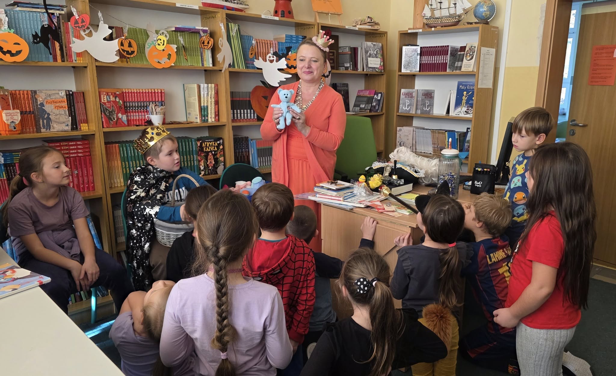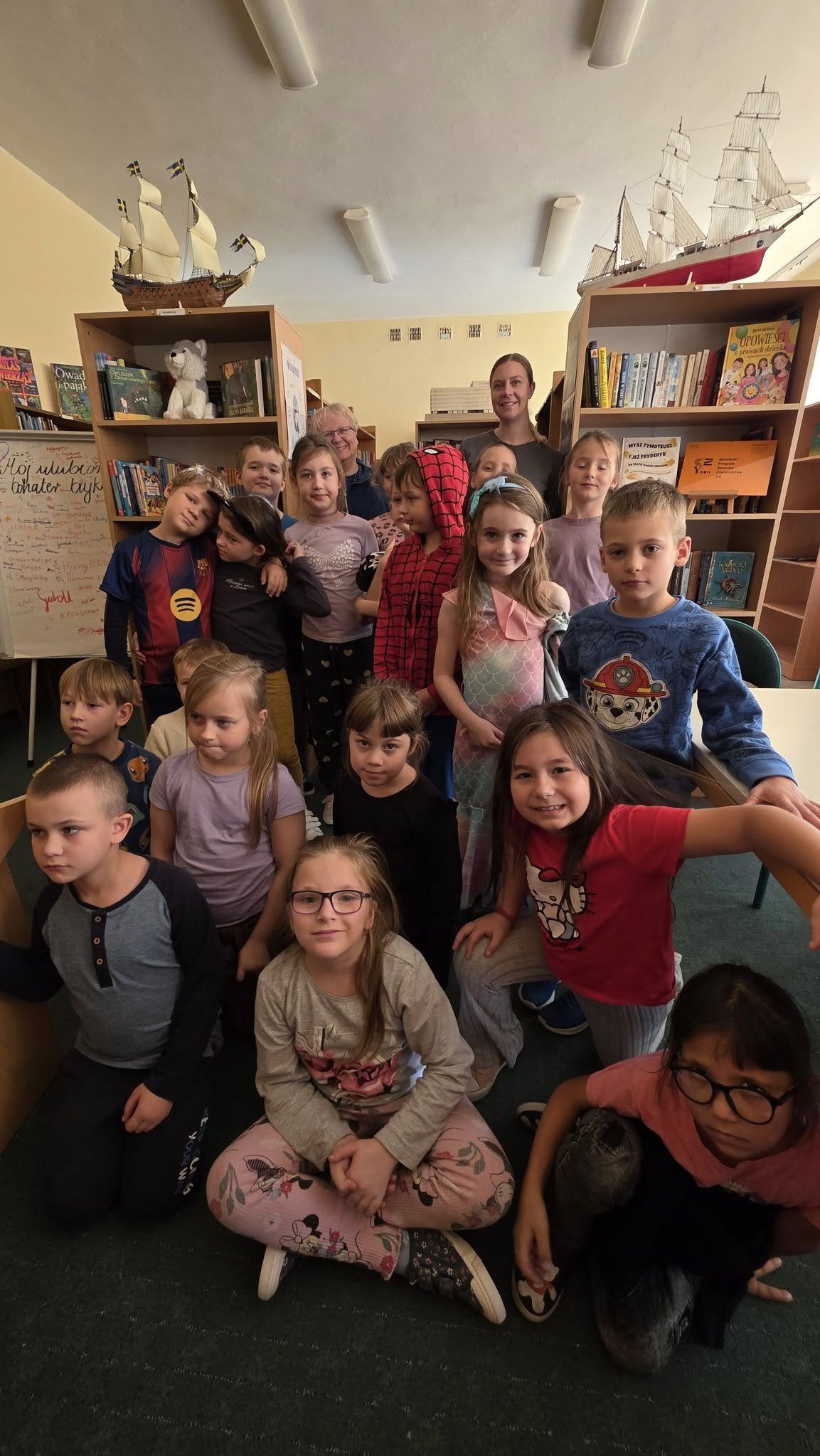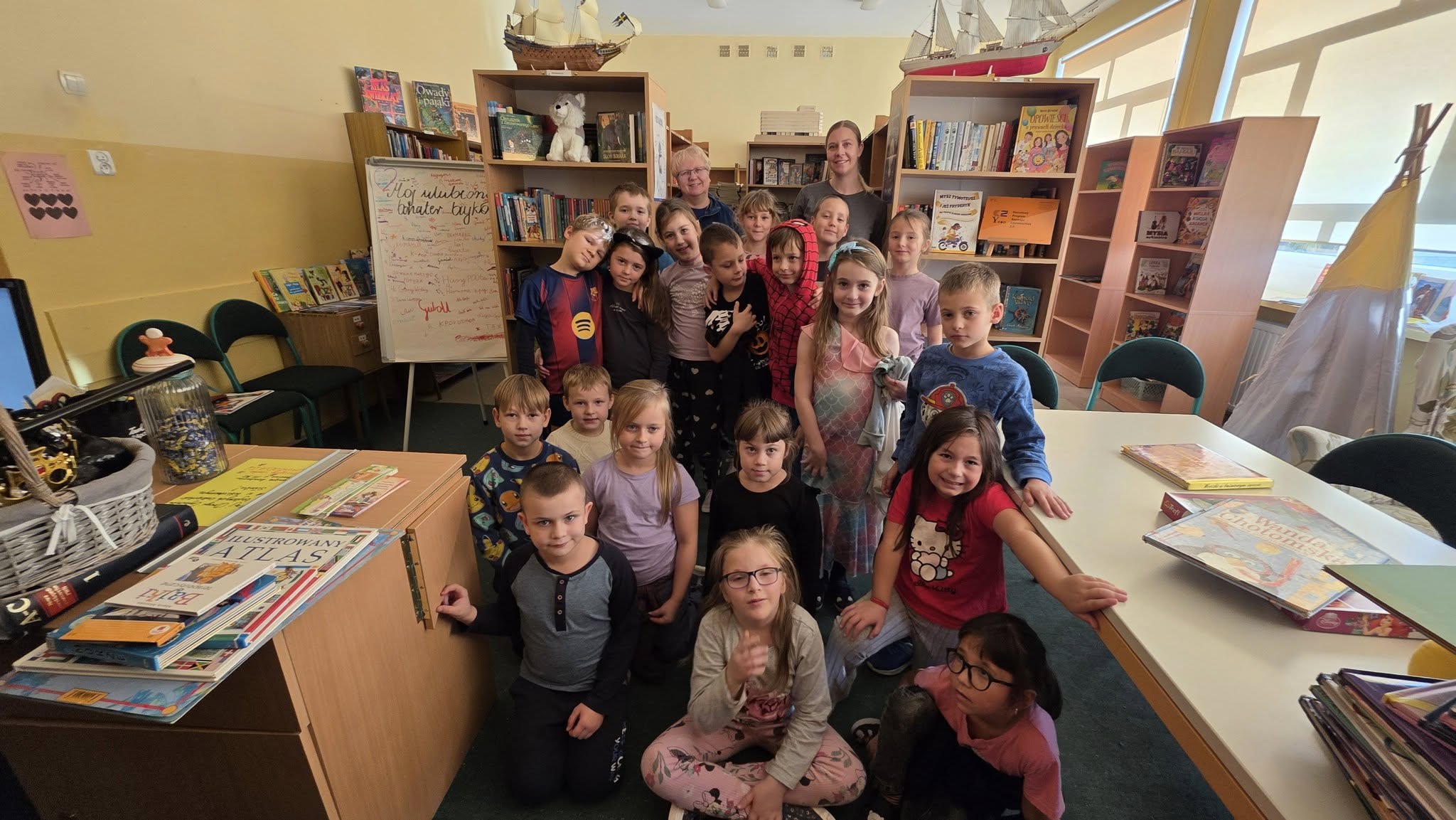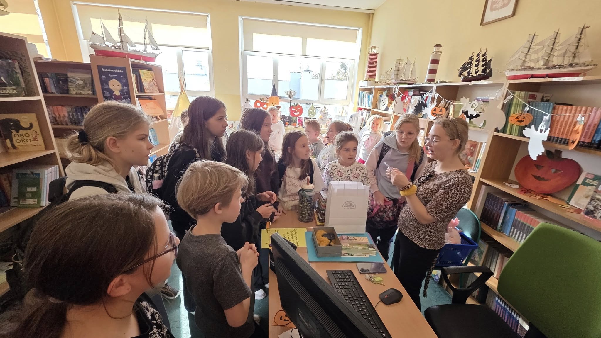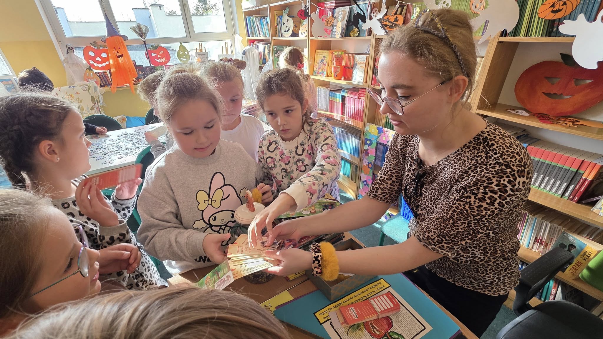 Nasza biblioteka zamieniła się dzisiaj w miejsce pełne wesołości i śmiechu, bowiem w nasze progi przybyły bajkowe postacie m.in. Mała Syrenka, Kot w butach, Spider-Man, Hermiona z Hogwartu. Czytaliśmy bajkę i układaliśmy puzzle pt. ”Mała syrenka” , wypisaliśmy naszych ulubionych bajkowych i baśniowych bohaterów, uczniowie szacowali ile cukierków (dar Rady Rodziców) było w bajkowym słoiku, a zwyciężczyni otrzymała w nagrodę książkę pt. „Mały książę”, słuchawki i długopis ufundowane przez bibliotekę. Ponadto klasa Ic wraz z Panią Kornelią i Panią Joanną przybyły na lekcję biblioteczną, podczas której uczniowie zapoznali się z zasadami funkcjonowania biblioteki szkolnej rozpoznawali bajkowe rekwizyty i rozwiązywali zagadki oraz opowiedzieli o swoich ulubionych bajkach i baśniach, otrzymując na koniec spotkania pamiątkowe zakładki do książek. Dzieci z radością pozowały do zdjęć z Panią bibliotekarką Alicją i nową Panią bibliotekarką Kamilą. Fantastycznie spędziliśmy ten wspólny magiczny czas.