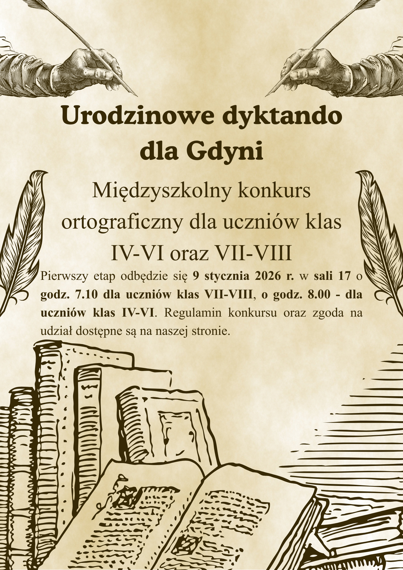 ✨ Zapraszam uczniów klas IV–VI oraz VII–VIII do udziału w konkursie ortograficznym „Urodzinowe dyktando dla Gdyni”! ✨