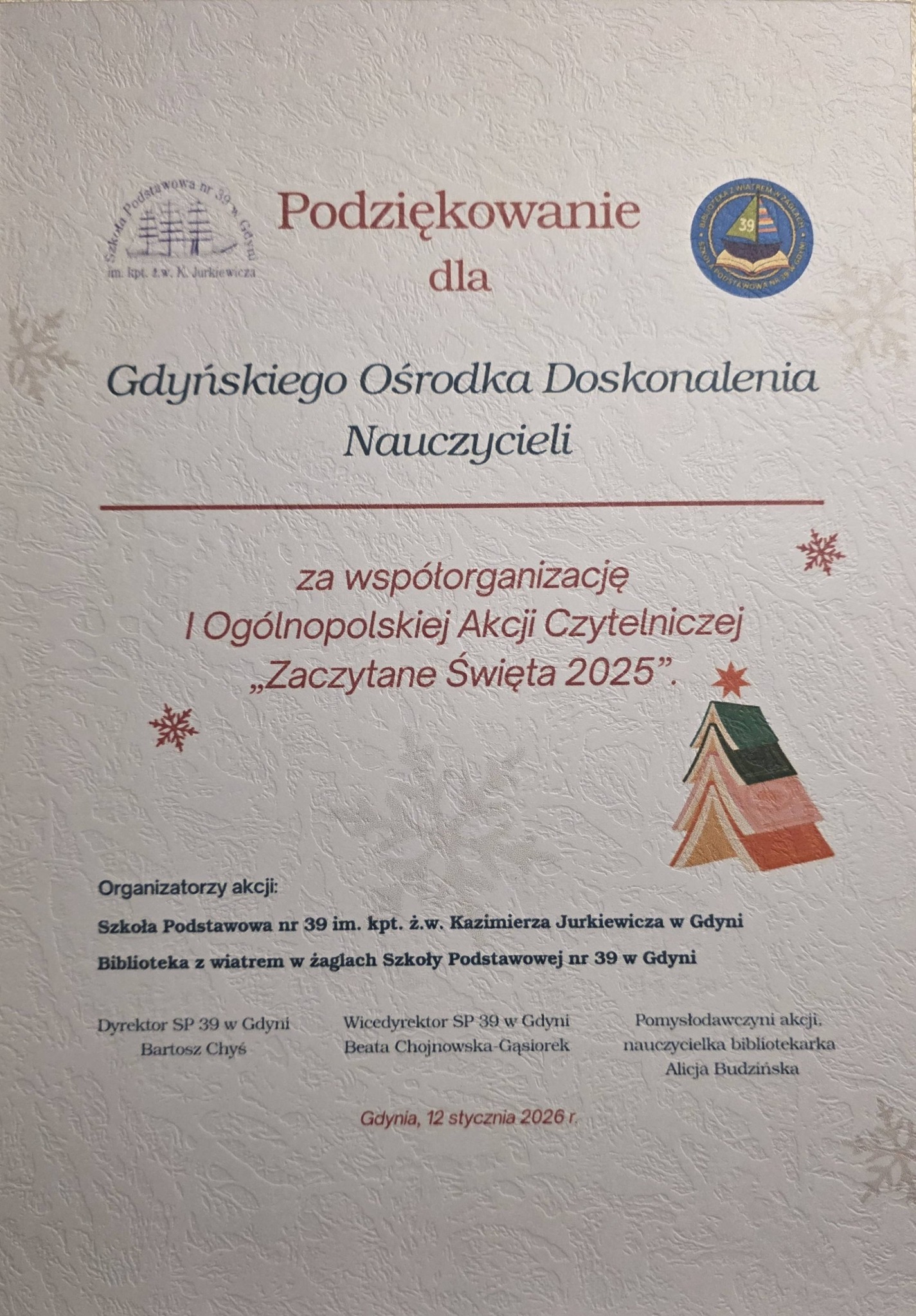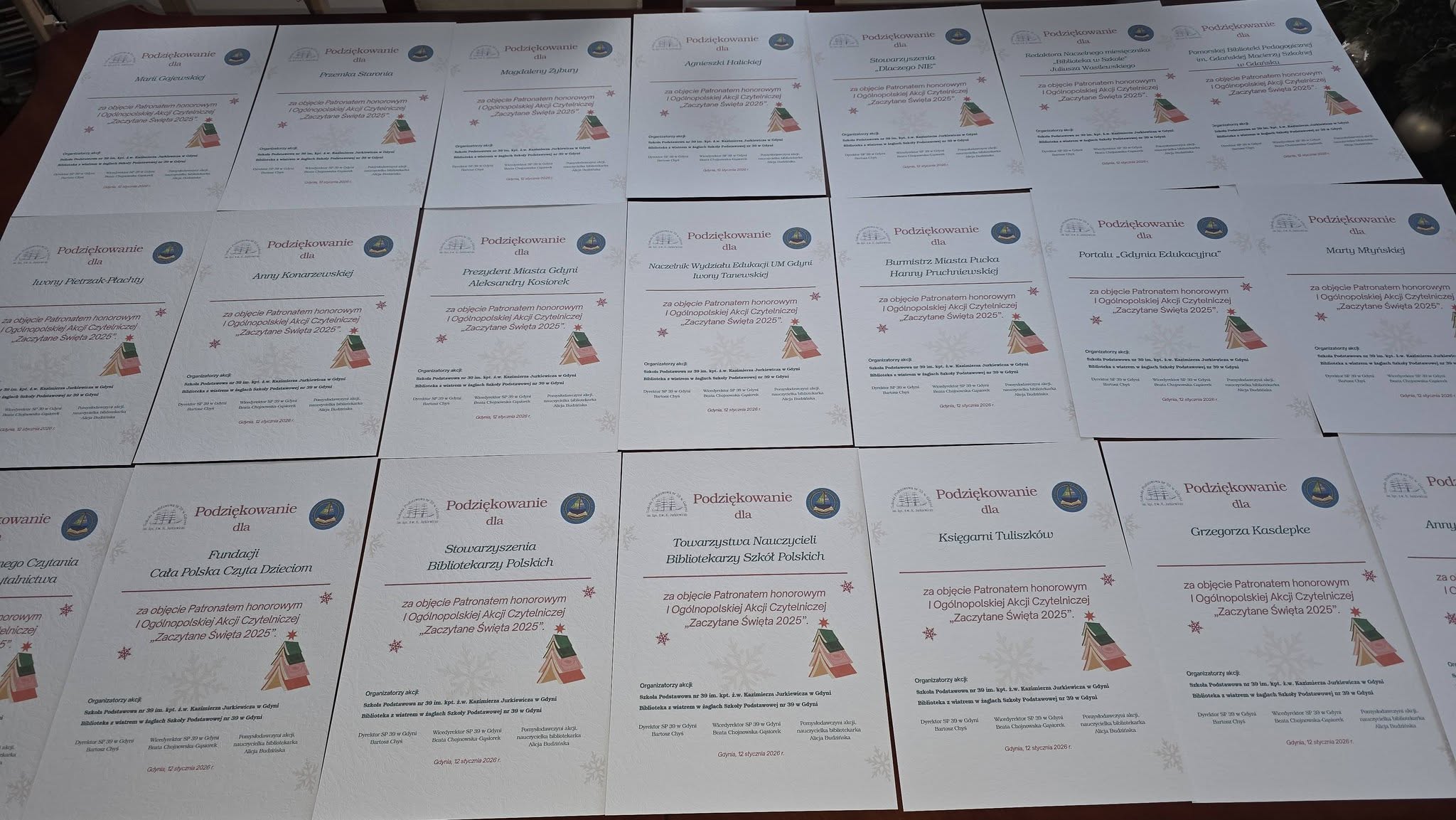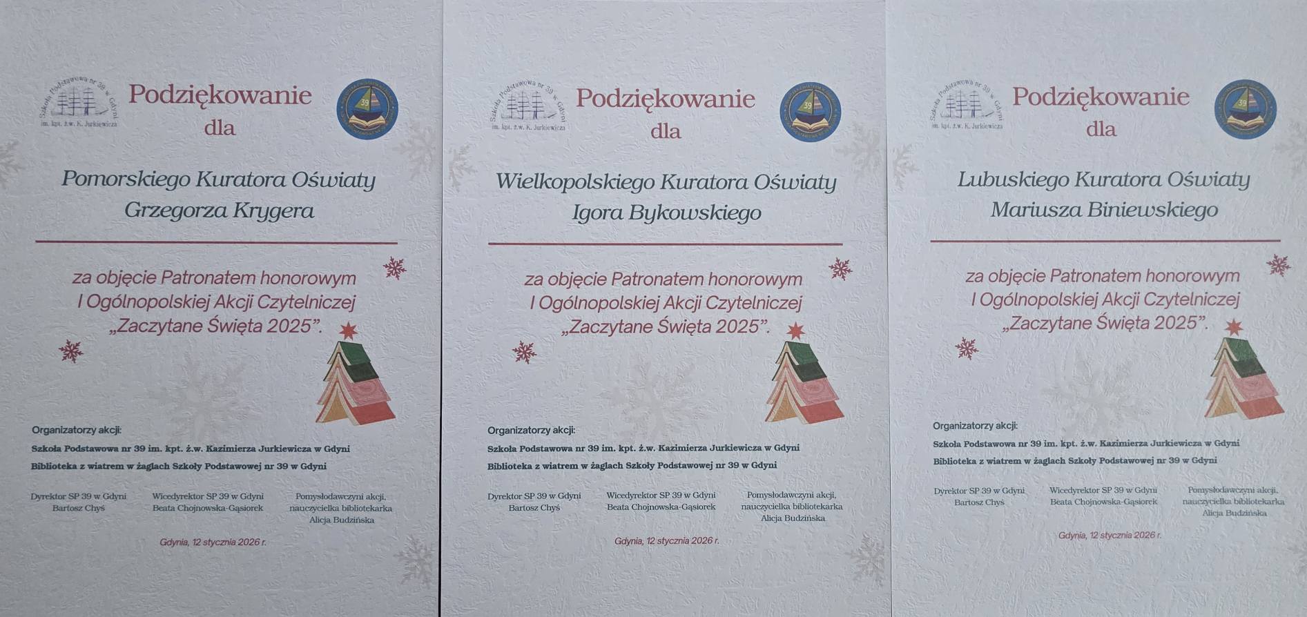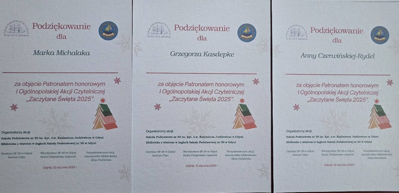 Na koniec pragniemy najpiękniej podziękować wszystkim wspaniałym Patronom honorowym I Ogólnopolskiej Akcji Czytelniczej „Zaczytane Święta 2025”, za okazane zaufanie i wsparcie jakim nas Państwo obdarzyliście, za pomoc w propagowaniu inicjatywy, czynne uczestnictwo i umieszczenie plakatów reklamowych Akcji na swoich stronach FB i w mediach społecznościowych. Dzięki Waszej pomocy wielu młodych ludzi i ich mentorów, sięgnęło po książki lub po prostu wysłuchało w ramach spotkań „na żywo”, albo podczas przeglądania stron FB Akcji, pięknych, literackich, świątecznych tekstów, częstokroć przekazujących ważne życiowe wartości. Co istotne, wszystko to działo się w atmosferze wspólnoty, tradycji i radości z przeżywania Świąt Bożego Narodzenia. To wielkie dzieło i wielkie dobro jakie gremialnie udało nam się osiągnąć.