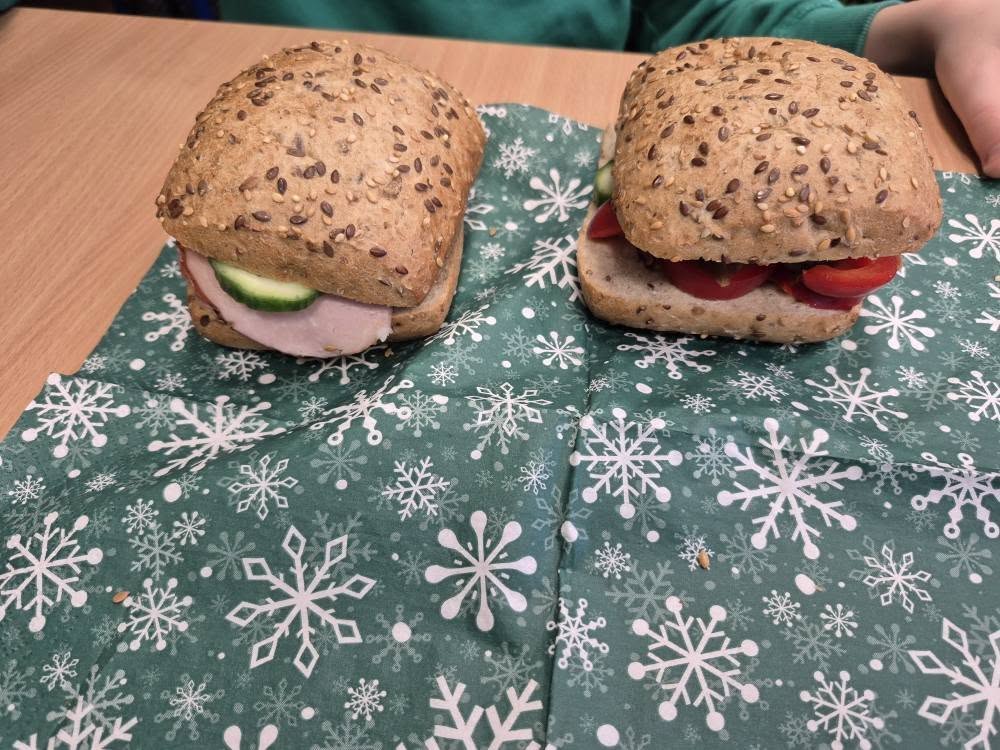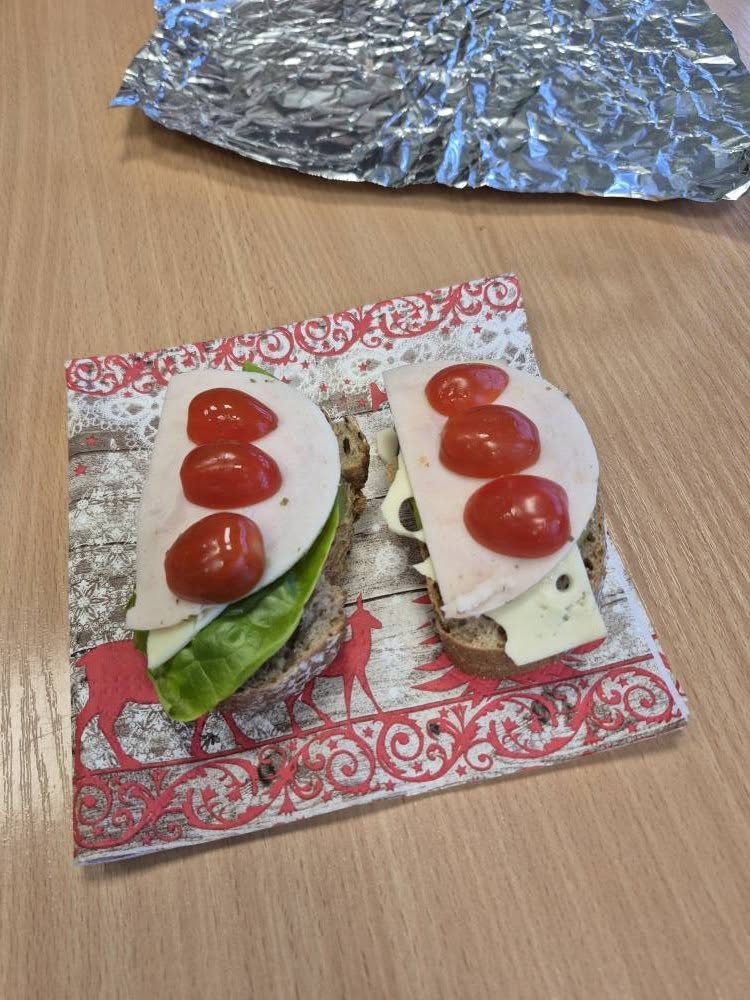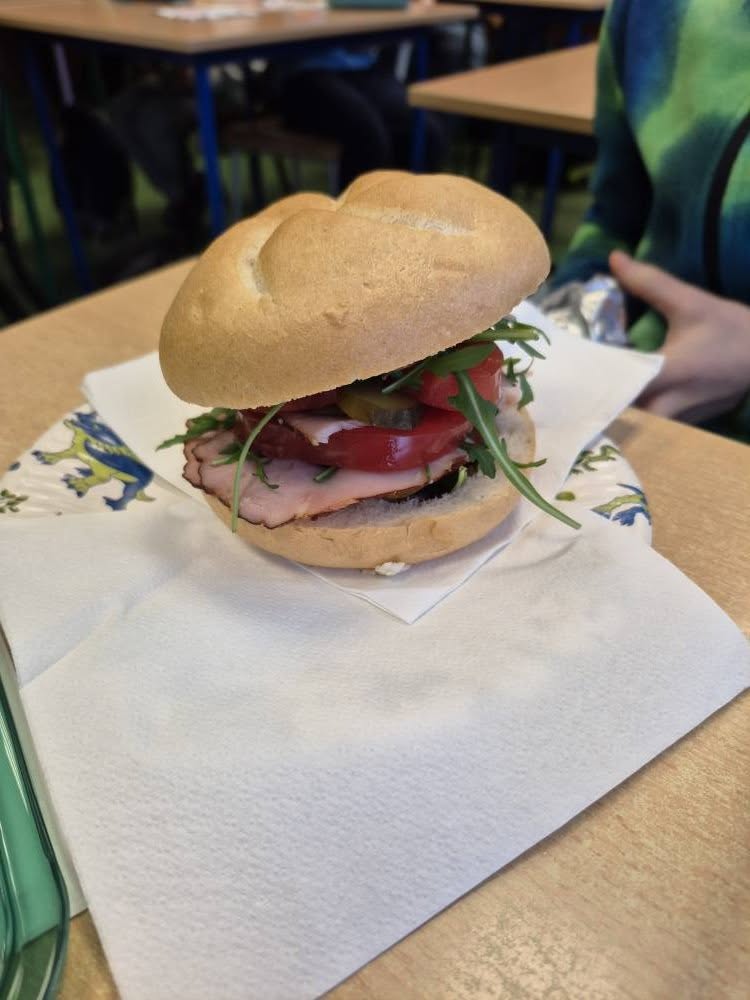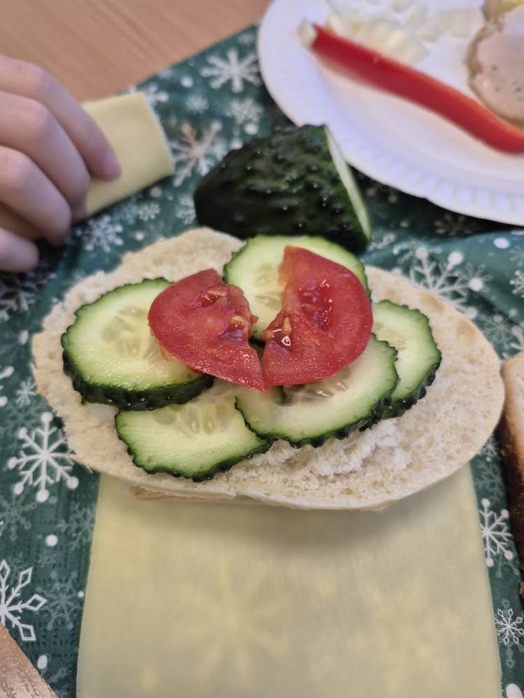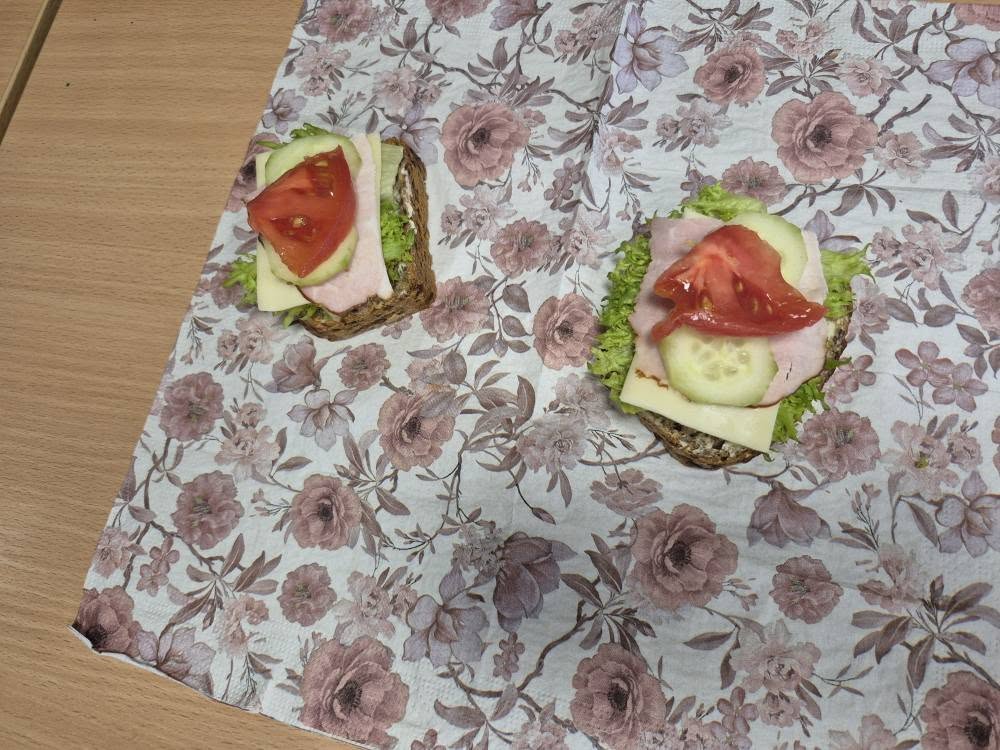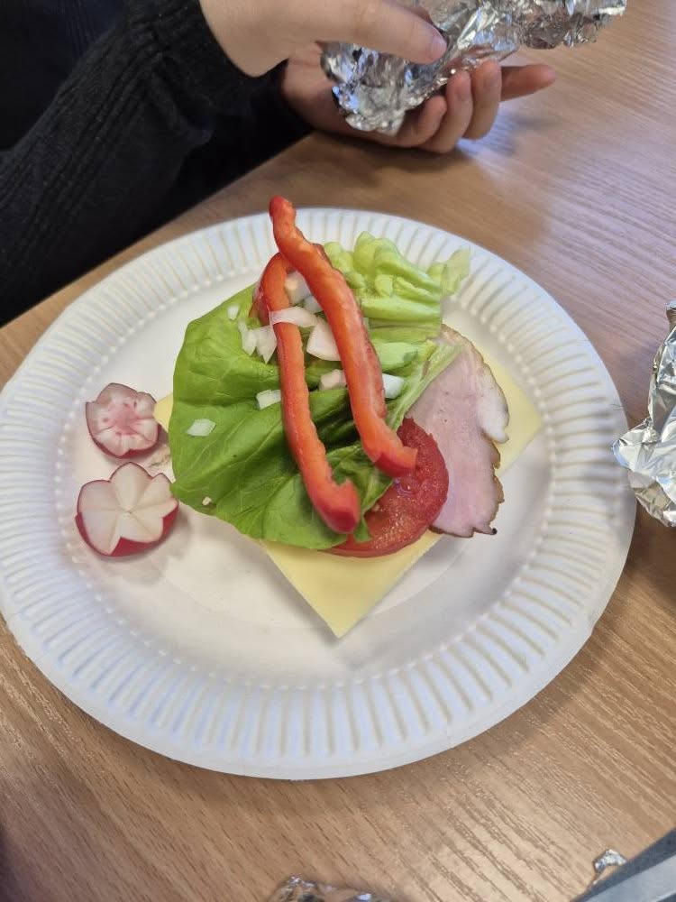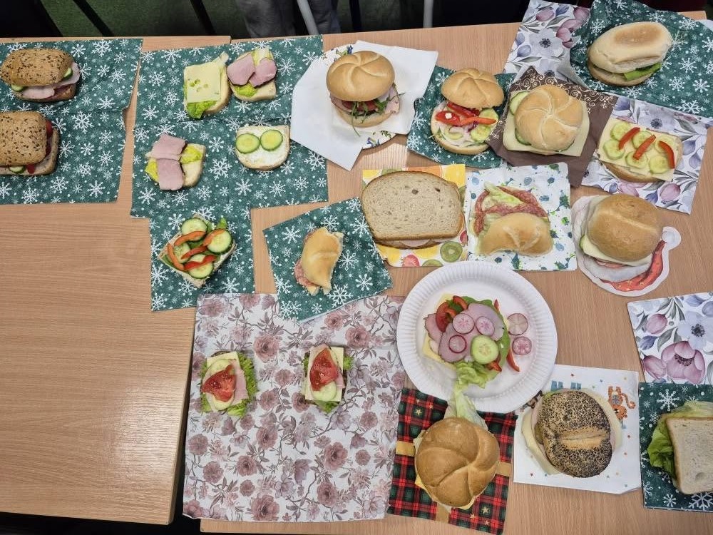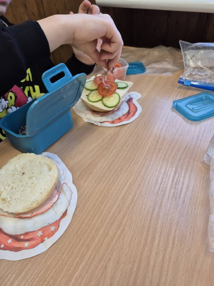 W trakcie lekcji kształtowaliśmy zdrowe nawyki żywieniowe , rozmawialiśmy o wartościach odżywczych produktów oraz o tym, jak komponować pełnowartościowe posiłki. Kolejnym etapem pracy było pisanie przepisu kulinarnego – uczniowie uczyli się, jak poprawnie i logicznie zapisać instrukcję: podawali listę składników, określali ich ilości oraz opisywali kolejne etapy przygotowania kanapek, dbając o jasność i poprawność językową.