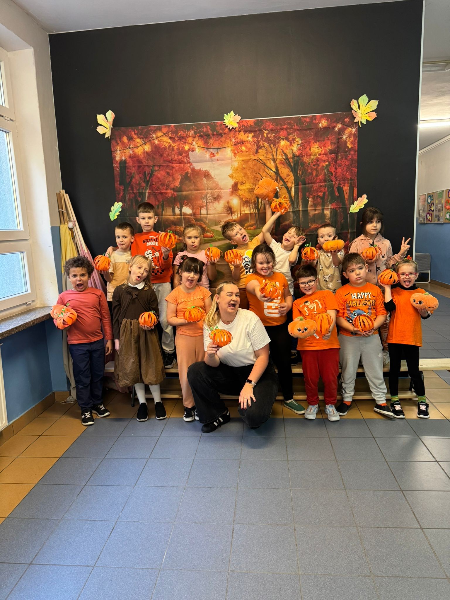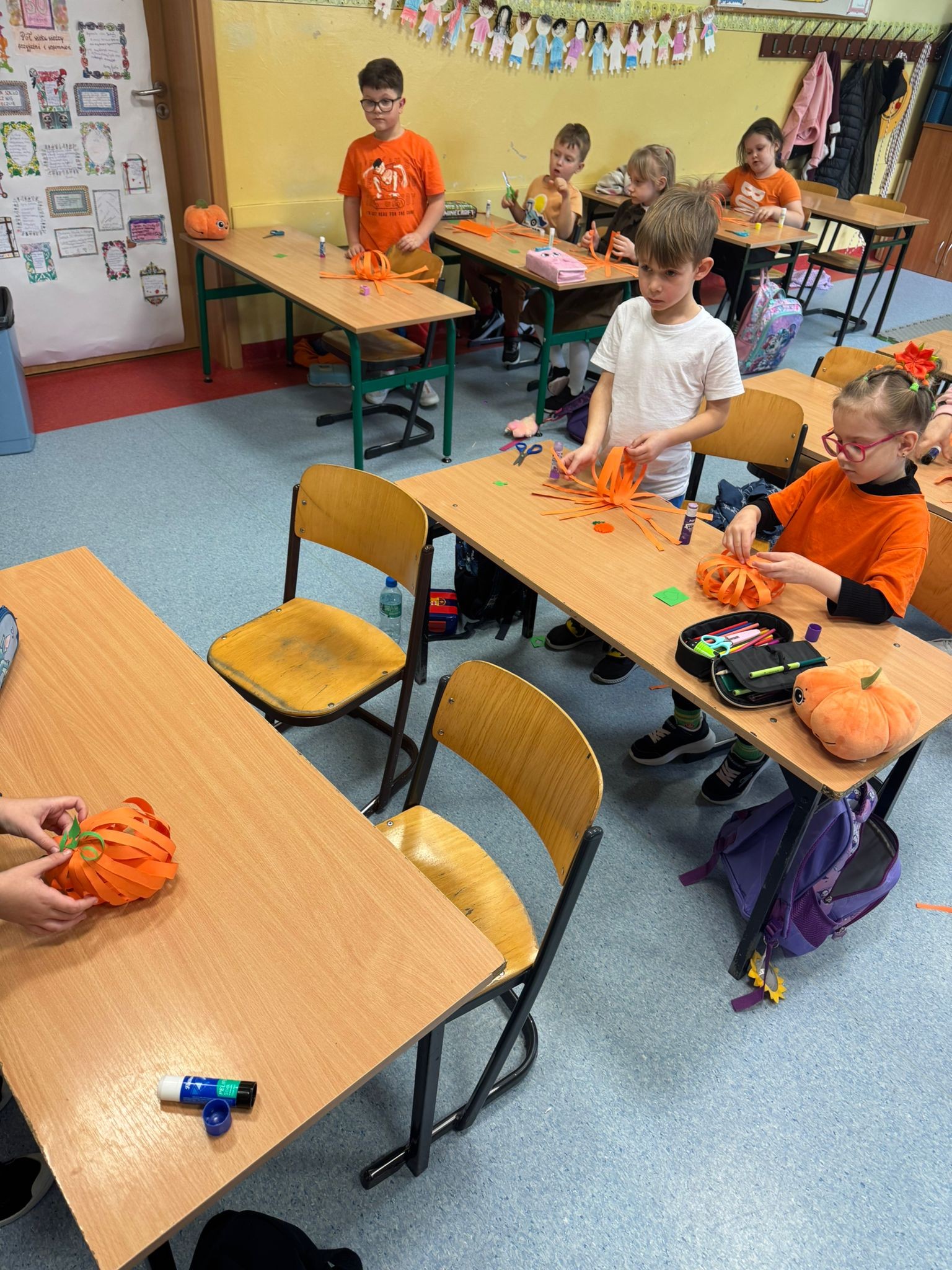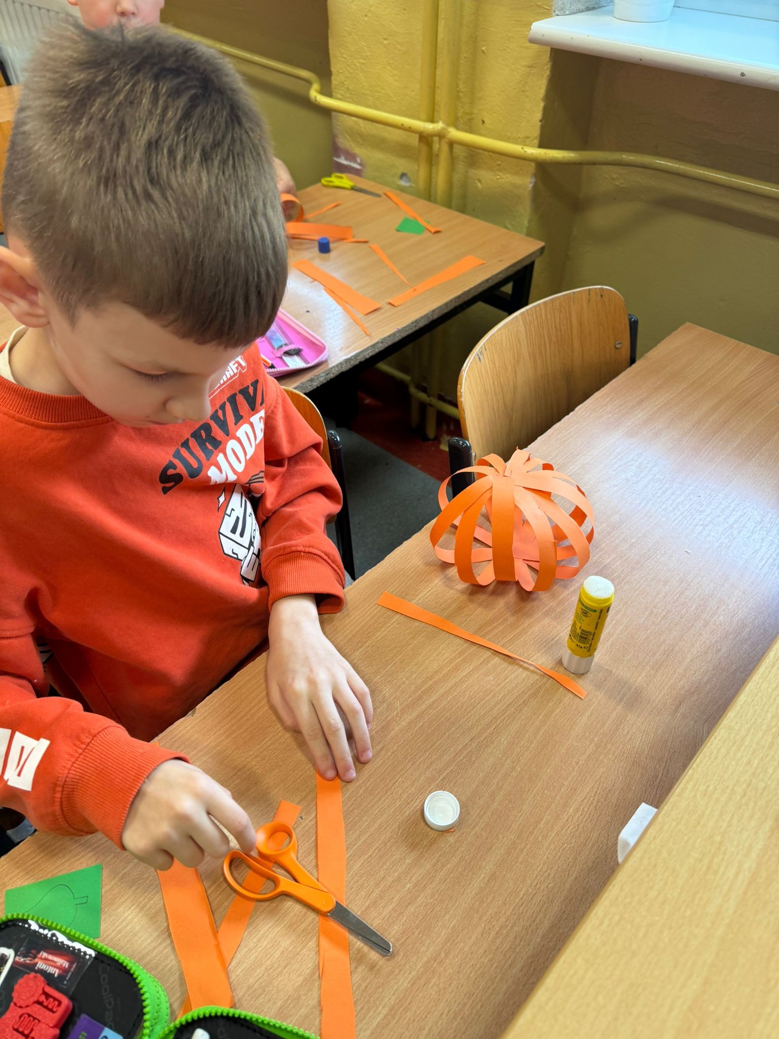 Na zakończenie każdy wykonał własną, papierową dynię, która pięknie ozdobiła naszą klasę.