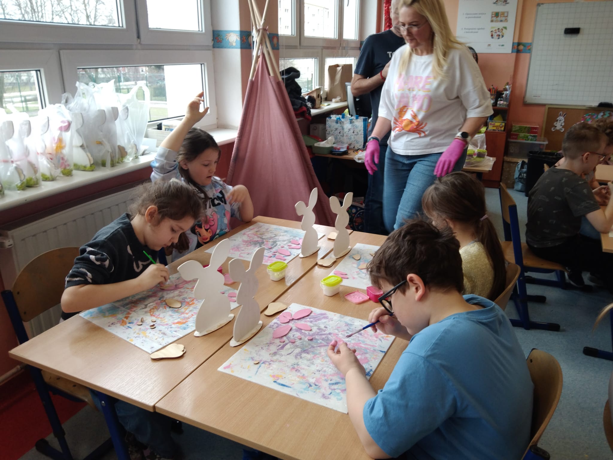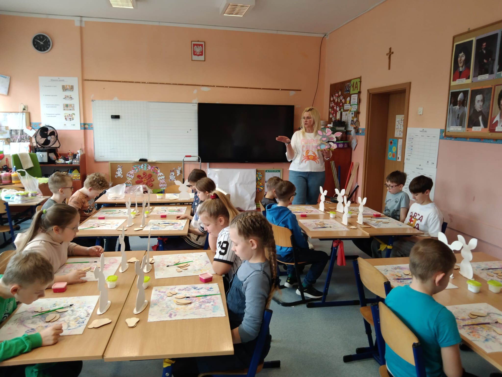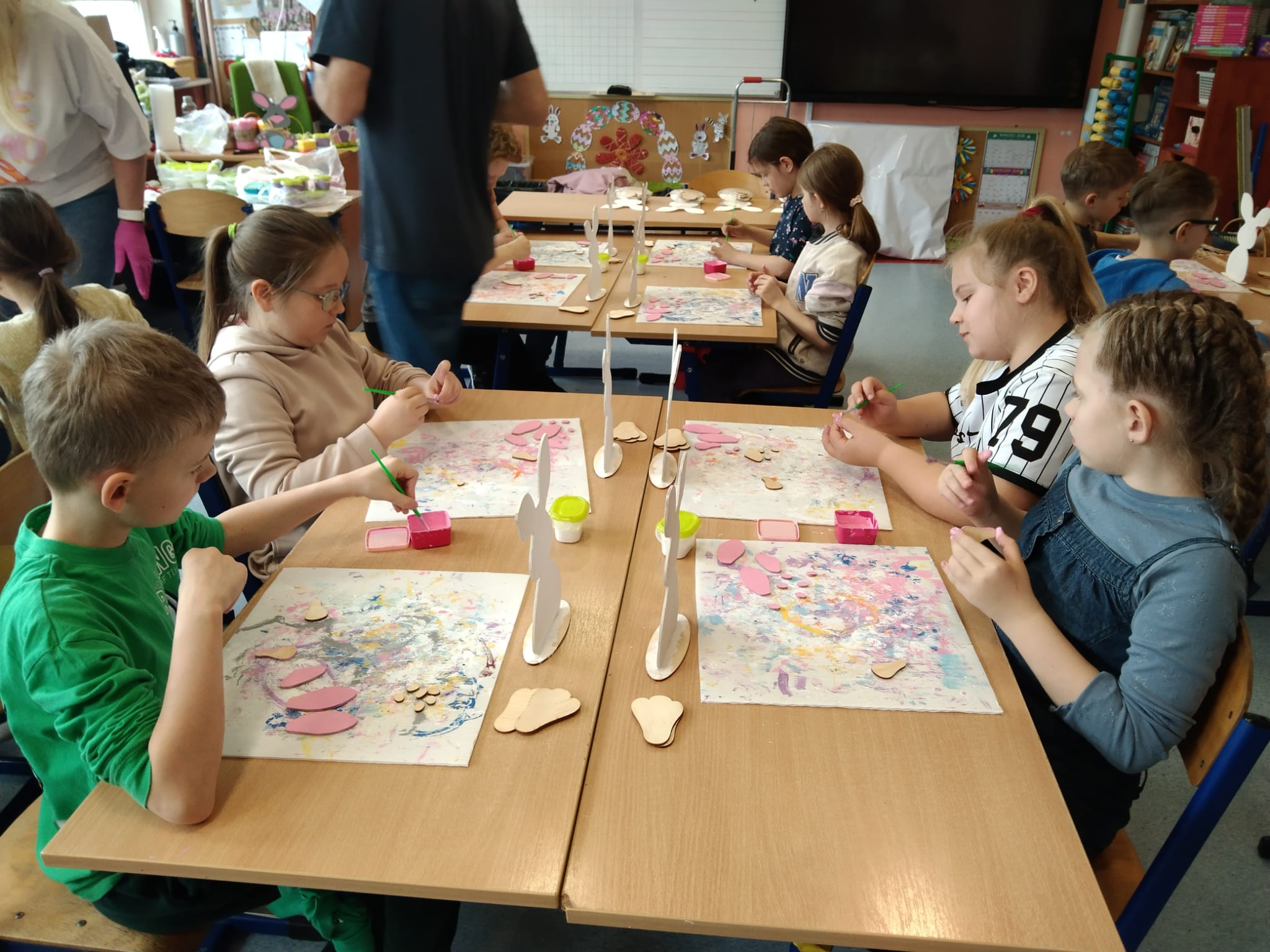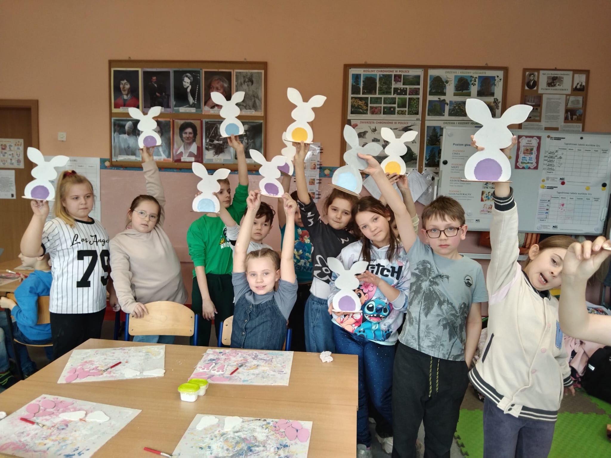 Przygotowania wielkanocne w klasie to doskonała okazja do budowania więzi poprzez wspólną aktywność. Przed świętami dzieci same udekorowały szkolną salę. Brały udział w warsztatach artystyczno-plastycznych i tworzyły Zajączki 3D. Rozwiązywały zagadki i krzyżówki związane tematycznie z symbolami świątecznymi. Przygotowały kartki wielkanocne z życzeniami dla dzieci z hospicjum. Brały udział w zabawach ruchowych i poszukiwały na terenie szkoły prezentów od Zajączka. Oglądały filmy dla dzieci na temat tradycji wielkanocnego koszyczka, śniadania z całą rodziną, śmigusa- dyngusa oraz zwyczajów ludowych w różnych regionach Polski. Wspólne działania wprowadziły wszystkich uczestników w świąteczny, wielkanocny nastrój.