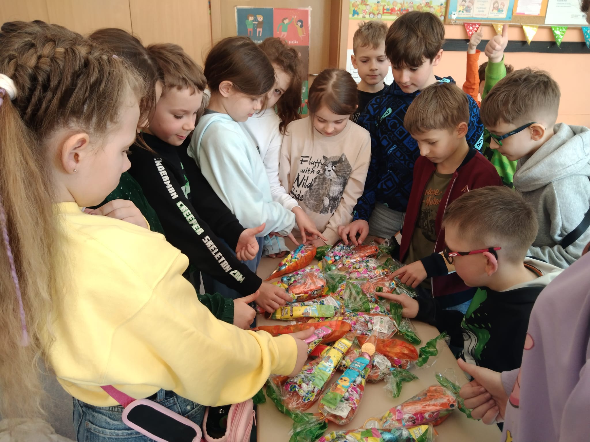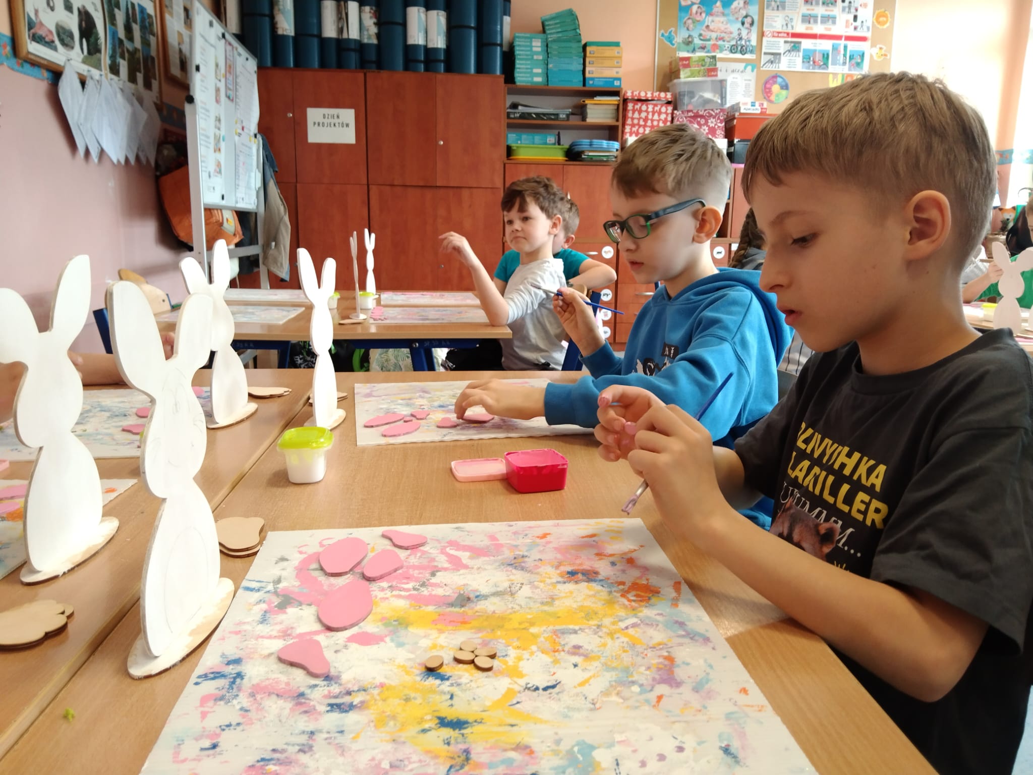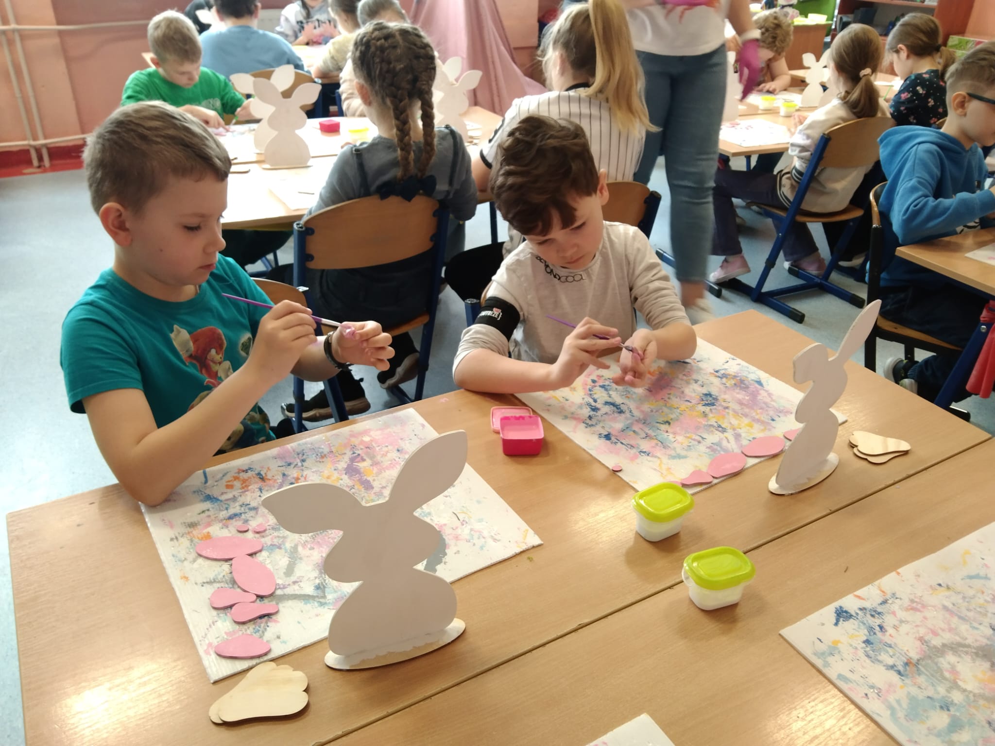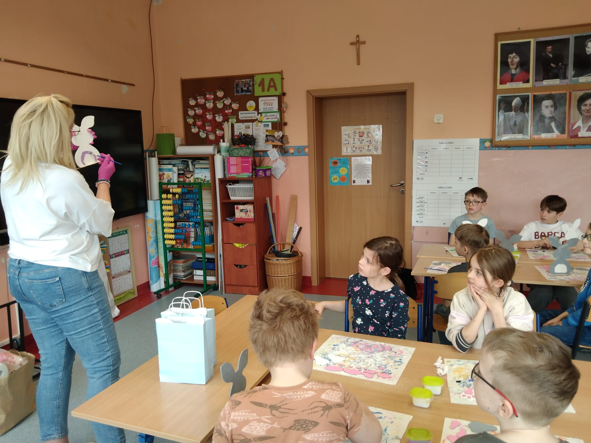 Przygotowania wielkanocne w klasie to doskonała okazja do budowania więzi poprzez wspólną aktywność. Przed świętami dzieci same udekorowały szkolną salę. Brały udział w warsztatach artystyczno-plastycznych i tworzyły Zajączki 3D. Rozwiązywały zagadki i krzyżówki związane tematycznie z symbolami świątecznymi. Przygotowały kartki wielkanocne z życzeniami dla dzieci z hospicjum. Brały udział w zabawach ruchowych i poszukiwały na terenie szkoły prezentów od Zajączka. Oglądały filmy dla dzieci na temat tradycji wielkanocnego koszyczka, śniadania z całą rodziną, śmigusa- dyngusa oraz zwyczajów ludowych w różnych regionach Polski. Wspólne działania wprowadziły wszystkich uczestników w świąteczny, wielkanocny nastrój.