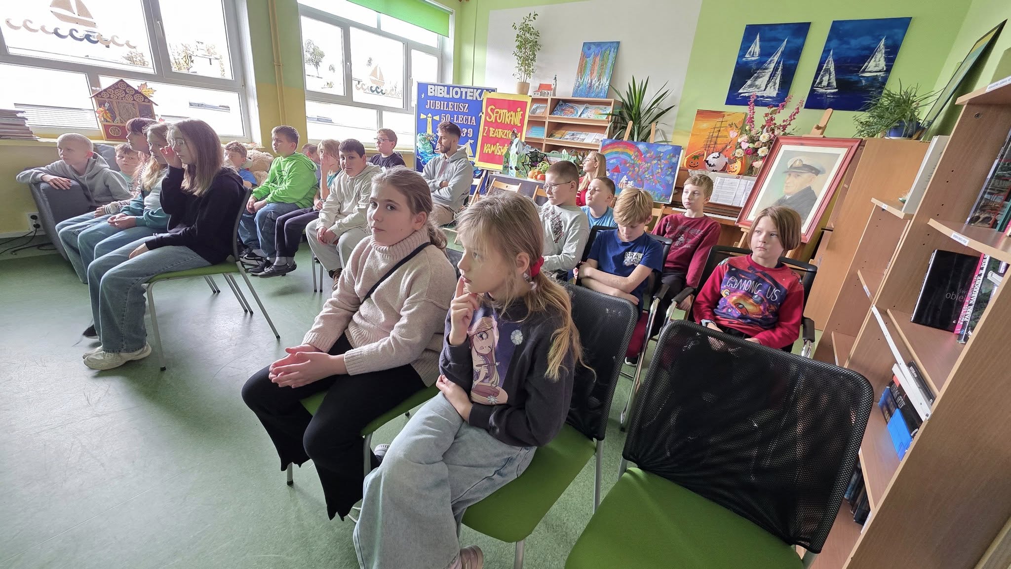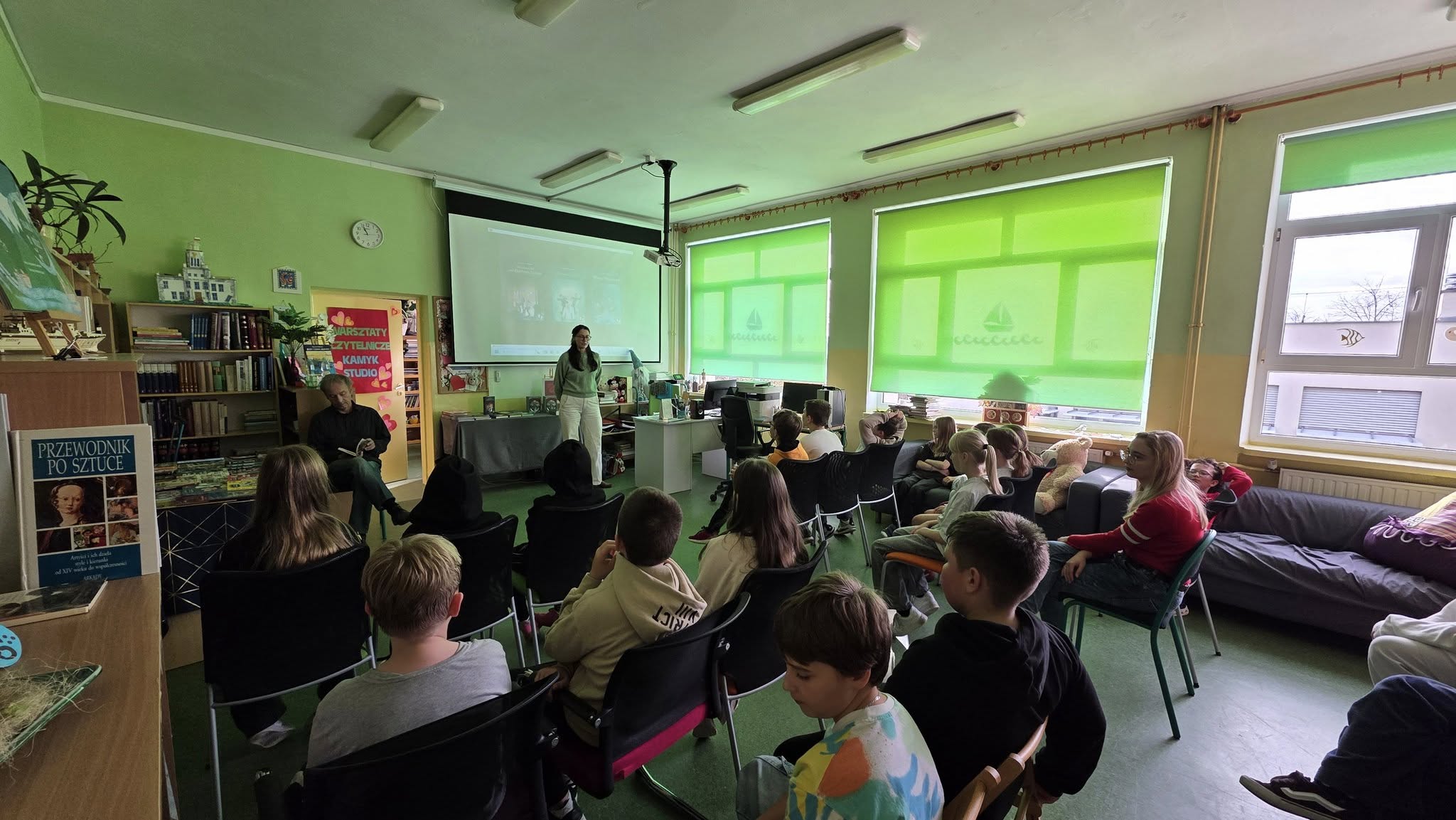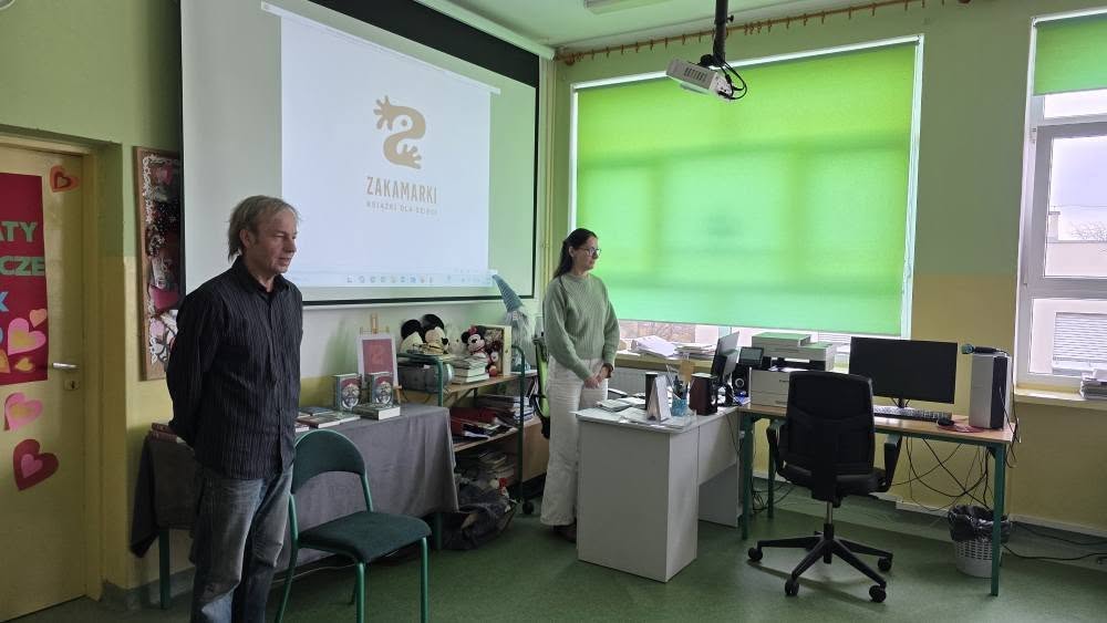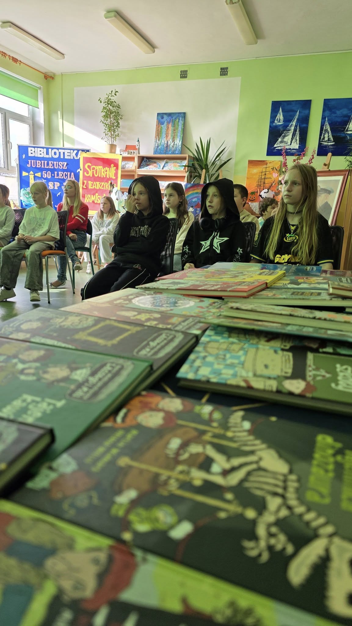 "Antykwariat pod Błękitnym Lustrem" to tytuł powieści skandynawskiego pisarza Martina Widmarka, która stała się tworzywem do przeprowadzenia warsztatów czytelniczych przygotowanych przez goszczącą w naszej szkole, w tym tygodniu, grupę aktorską Kamyk Studio, współpracującą z wydawnictwem "Zakamarki". Czego tu nie było? Intryga, poszukiwanie eliksiru nieśmiertelności, budzące się uczucia. To niezwykłe spotkanie z literaturą obfitowało we fragmenty książki po mistrzowsku czytane przez Pana Macieja i Panią Beatę, lekcję chemii w pigułce z demonstracją pierwiastków na Tablicy Mendelejewa, informacjami na temat dokonań i przygód Karola Darwina twórcy teorii ewolucji, ciekawostkami na temat najdłużej żyjących na Ziemi ludzi i zwierząt. To były po mistrzowsku przeprowadzone warsztaty czytelnicze, na których zarówno uczniowie, jaki i my nauczyciele, siedzieliśmy z wypiekami na twarzach. Dziękujemy bardzo za tą wspaniałą ucztę literacką.