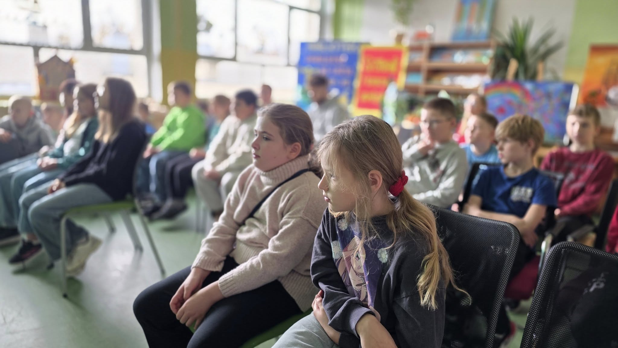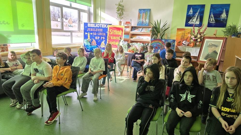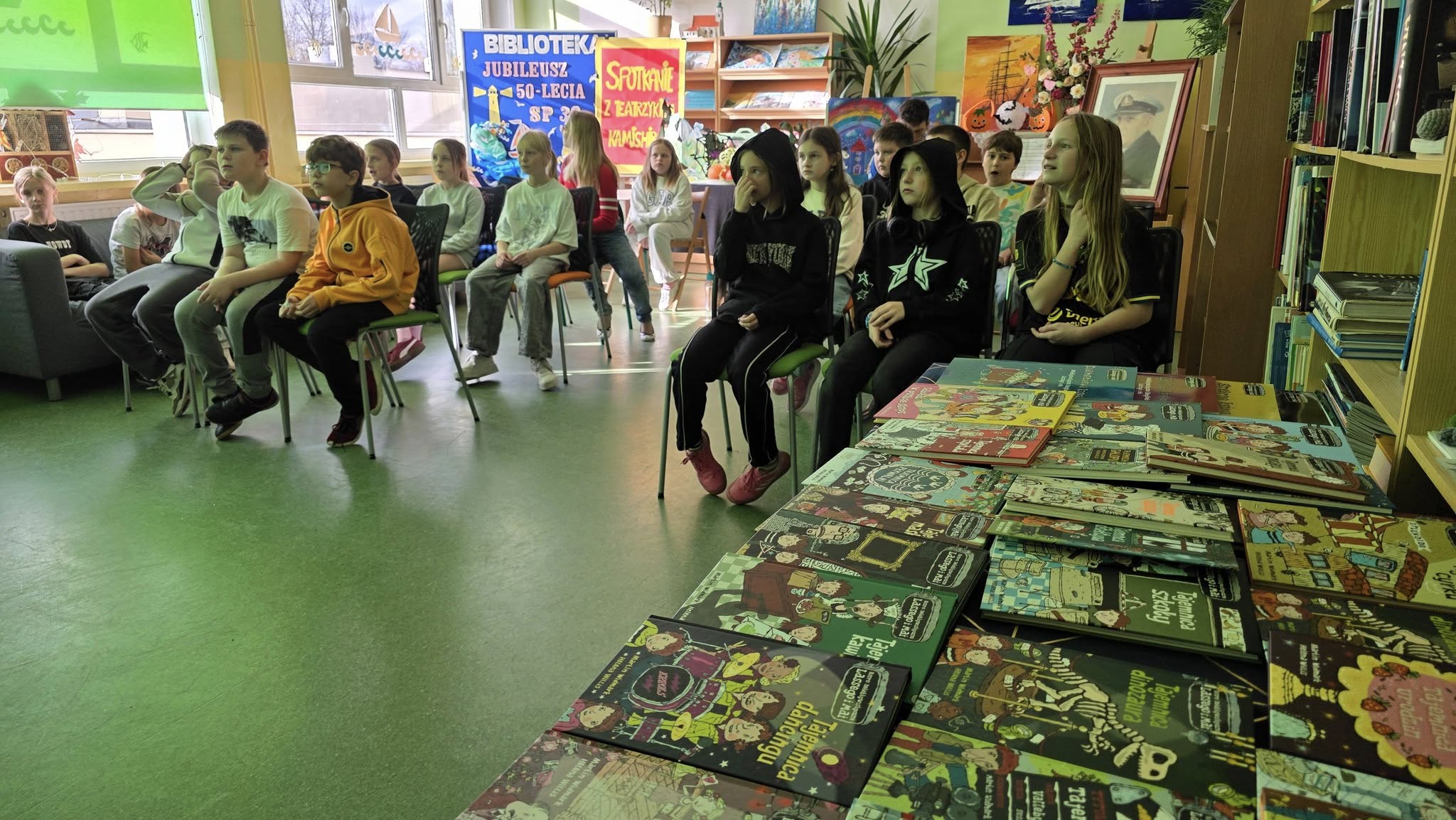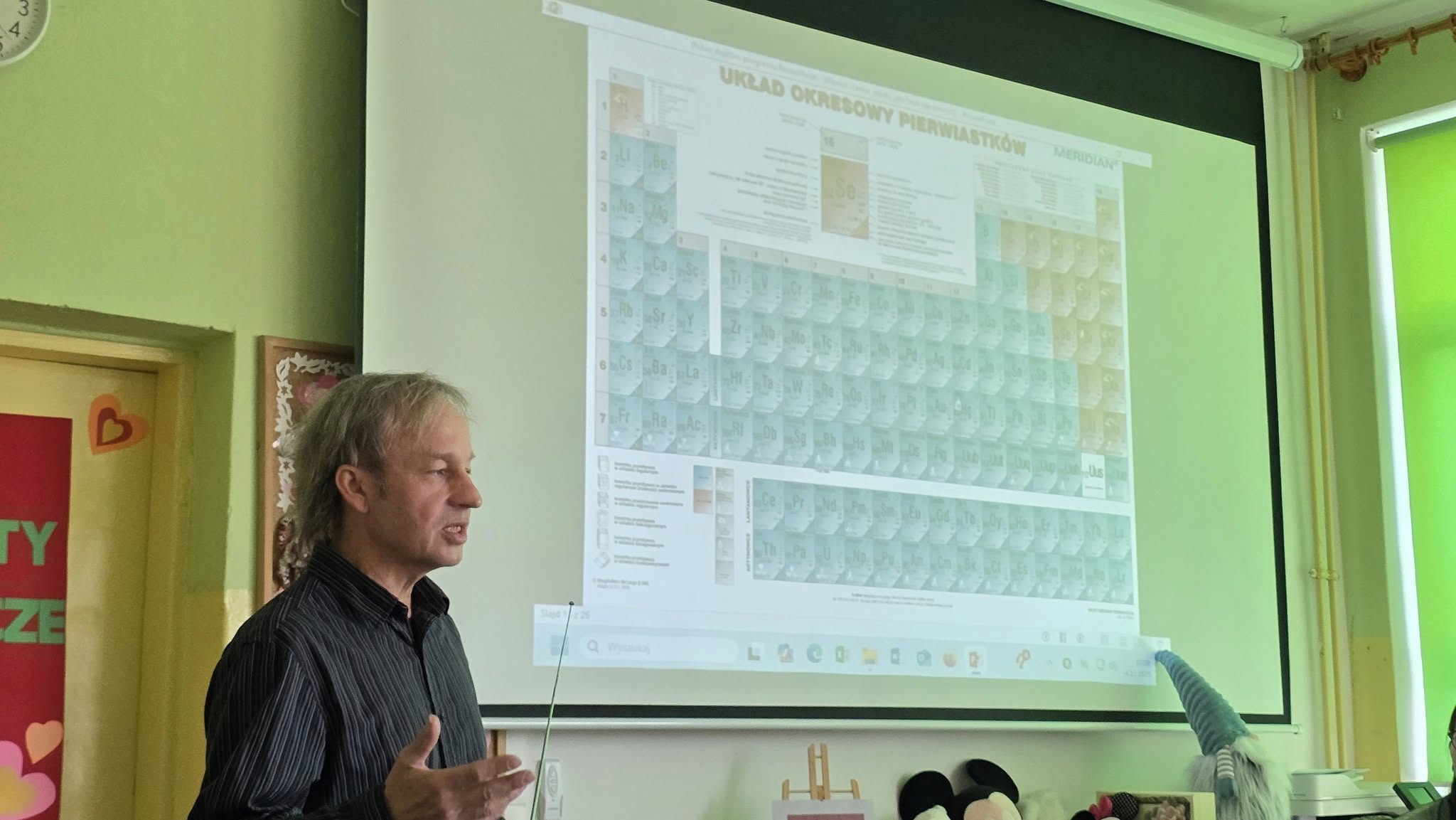 "Antykwariat pod Błękitnym Lustrem" to tytuł powieści skandynawskiego pisarza Martina Widmarka, która stała się tworzywem do przeprowadzenia warsztatów czytelniczych przygotowanych przez goszczącą w naszej szkole, w tym tygodniu, grupę aktorską Kamyk Studio, współpracującą z wydawnictwem "Zakamarki". Czego tu nie było? Intryga, poszukiwanie eliksiru nieśmiertelności, budzące się uczucia. To niezwykłe spotkanie z literaturą obfitowało we fragmenty książki po mistrzowsku czytane przez Pana Macieja i Panią Beatę, lekcję chemii w pigułce z demonstracją pierwiastków na Tablicy Mendelejewa, informacjami na temat dokonań i przygód Karola Darwina twórcy teorii ewolucji, ciekawostkami na temat najdłużej żyjących na Ziemi ludzi i zwierząt. To były po mistrzowsku przeprowadzone warsztaty czytelnicze, na których zarówno uczniowie, jaki i my nauczyciele, siedzieliśmy z wypiekami na twarzach. Dziękujemy bardzo za tą wspaniałą ucztę literacką.