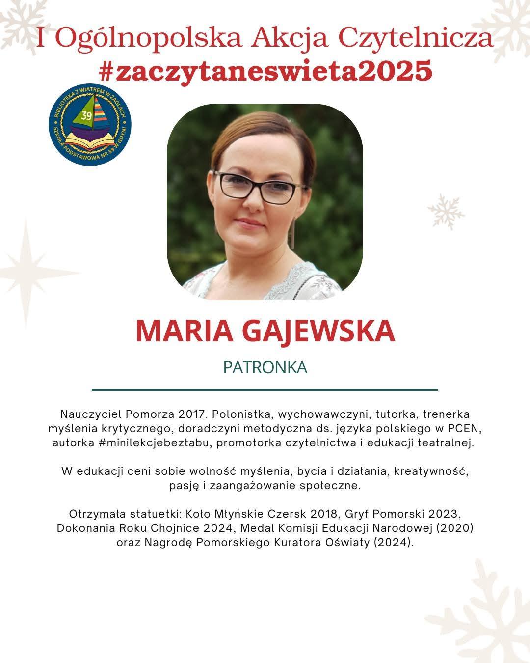 Przypomnijmy, Pani Maria już wcześniej gościła w naszej placówce, jest także Patronką honorową I Ogólnopolskiej Akcji Czytelniczej "Zaczytane Święta 2025" organizowanej przez Dyrekcję SP 39 i Bibliotekę z wiatrem w żaglach Szkoły Podstawowej nr 39 w Gdyni .