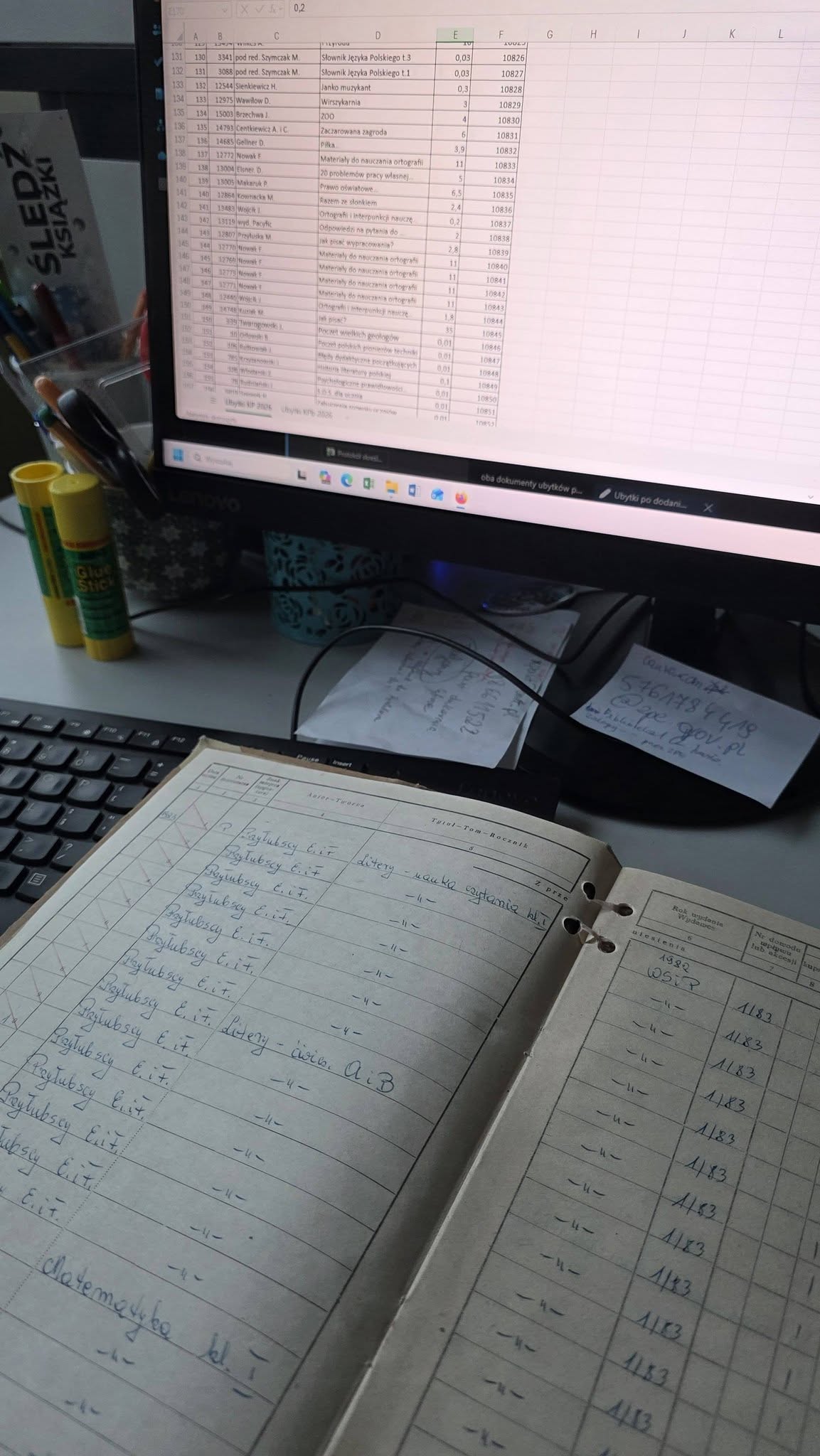 Praca w bibliotece ma wiele odsłon. Nasze Panie bibliotekarki pracują od dwóch lat łącznie w wymiarze 1,5 etatu. Oprócz codziennej obsługi czytelników, porządkowania zbiorów, przyjmowania od klas młodszych przerobionych części podręczników, prowadzenia dokumentacji biblioteki przekazywanej do Urzędu Miasta Gdyni, w bibliotece odbywa się wiele działań edukacyjnych, które trzeba zaplanować, przygotować i zrealizować, a potem przedstawić w formie fotorelacji lub filmu wraz z opisem na FB biblioteki oraz stronie internetowej szkoły. Są to m.in. lekcje biblioteczne, spotkania autorskie, akcje czytelnicze, projekty Ogólnopolskie, warsztaty, konkursy, wystawy, szkolenia, przedstawienia, także festyny, a w obecnym roku szkolnym również wiele dodatkowych zadań zrealizowanych w związku z Jubileuszem 50- lecia naszej placówki i 100- lecia Gdyni. Ponad to przez cały rok szkolny zakupujemy i przyjmujemy od Rady Rodziców, naszych uczniów i innych darczyńców książki, które ewidencjonujemy wpisując do papierowych ksiąg inwentarzowych i systemu e- biblio.Tą niewidoczną, ale niezwykle ważną pracą informatyczną zajmuje się Pani bibliotekarka Brygida, która wprowadziła już ponad 3/4 naszego księgozbioru do systemu e- biblio katalogując i przygotowując kody kreskowe nie tylko do książek, ale także podręczników. Pani Kamila porządkowała księgozbiór, Pani Alicja zajęła sie ubytkowaniem czyli wyprowadzaniem z systemu e- biblio podręczników, których każdego roku mamy do kilku tysiecy. W pracach związanych wprowadzanim nowych książek do ksiąg inwantarzowych wspiera bibliotekę Pani asystentka nauczyciela Agnieszka.