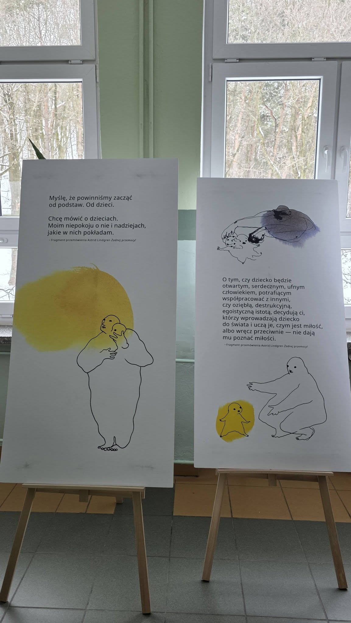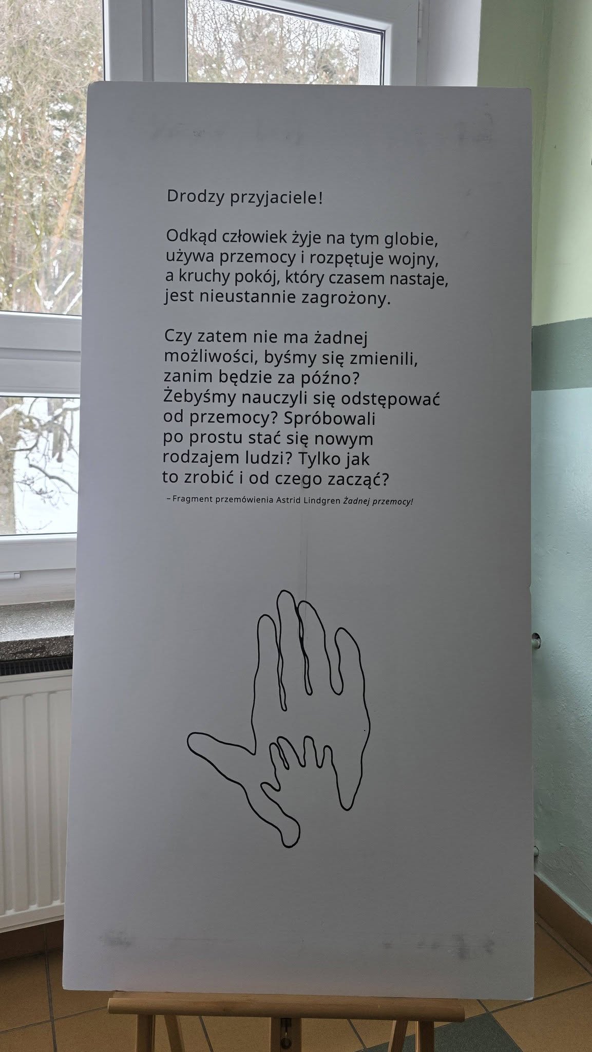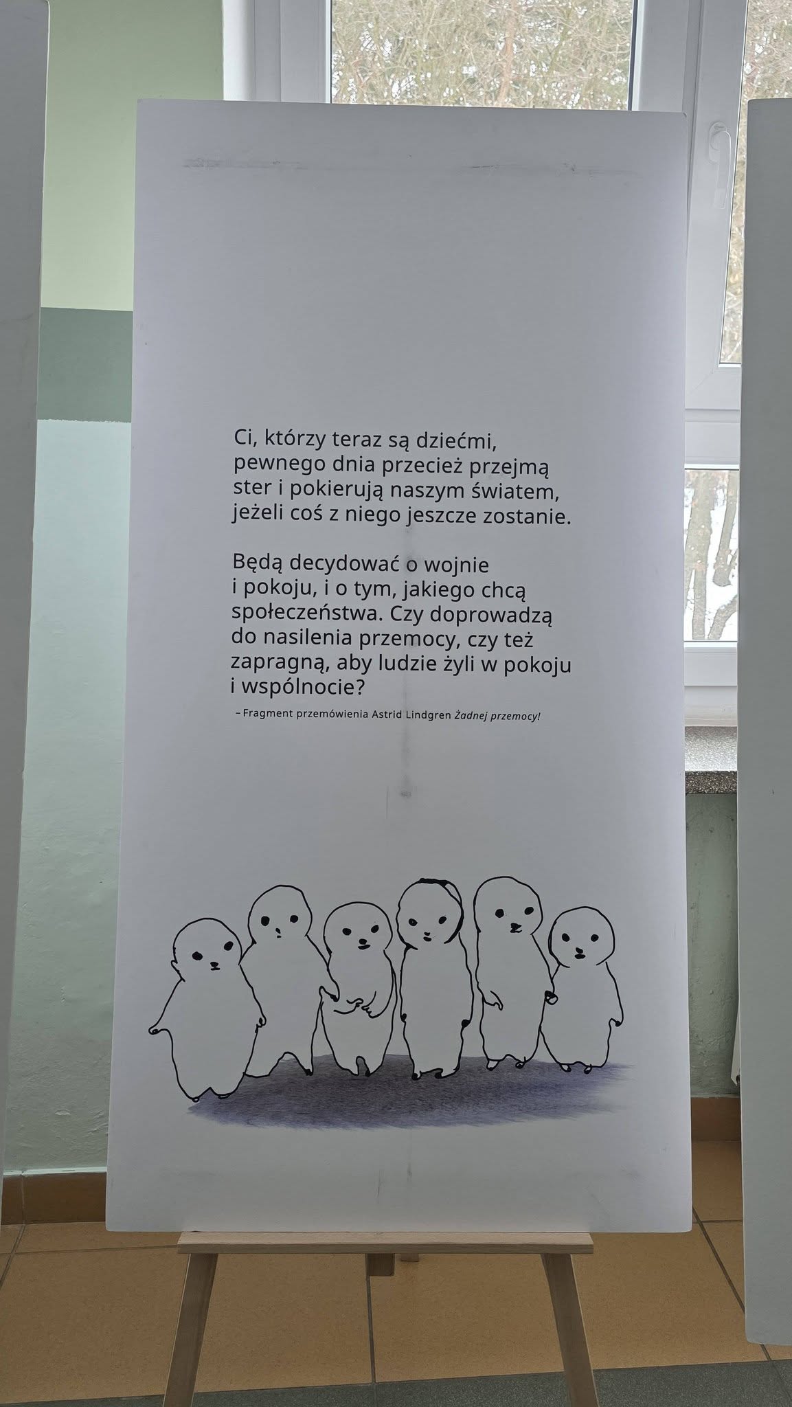 Na zaproszenie Pana dyrektora Bartosza Czyś i Biblioteka z wiatrem w żaglach Szkoły Podstawowej nr 39 w Gdyni w miesiącu lutym 2026 r., w naszej szkole gości wystawa wydawnictwa „Zakamarki” pt. „ŻADNEJ PRZEMOCY! Pokój na świecie według Astrid Lindgren”.