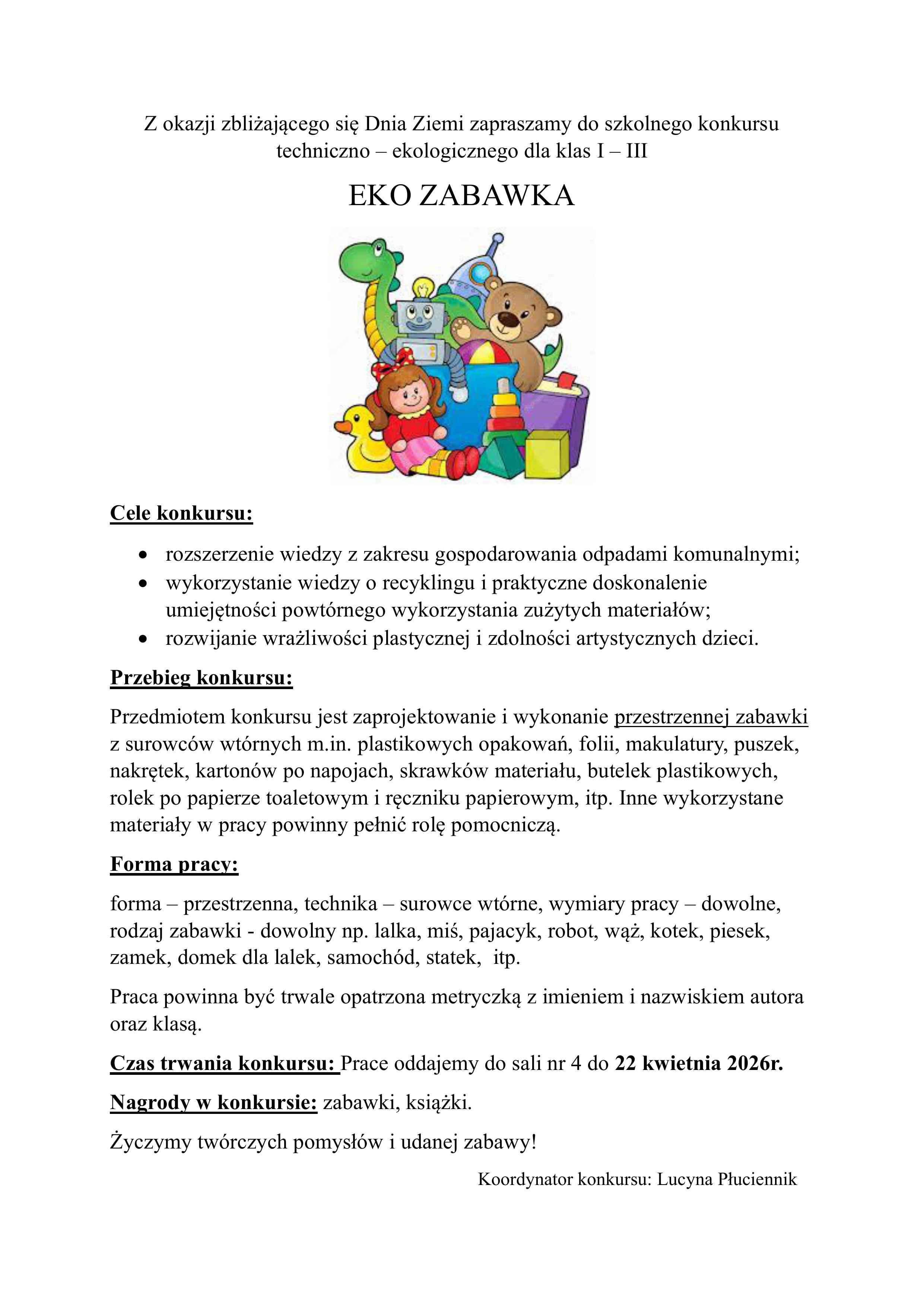 Z okazji zbliżającego się Dnia Ziemi zapraszamy do szkolnego konkursu techniczno – ekologicznego dla klas I – III  EKO ZABAWKA