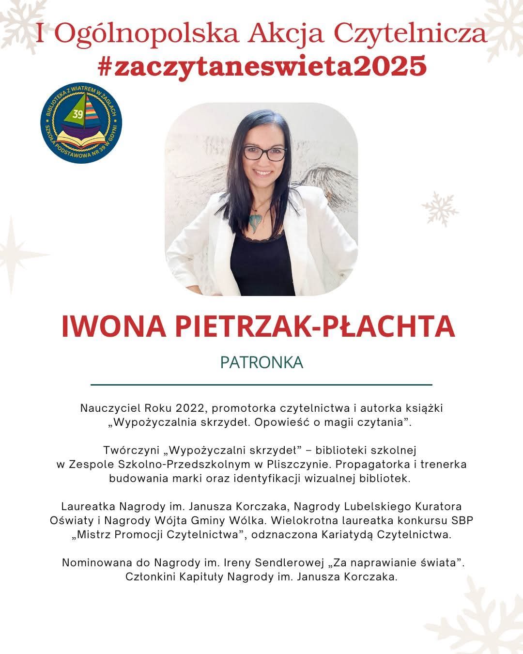 Przypomnijmy, że ta niezwykła bibliotekarka – Nauczyciel Roku 2022 – stworzyła w Zespole Szkolno-Przedszkolnym w Pliszczynie wyjątkową bibliotekę „Wypożyczalnia skrzydeł”. Jest także Patronem honorowym organizowanej przez naszą bibliotekę I Ogólnopolskiej Akcji Czytelniczej „Zaczytane Święta 2025” oraz laureatką wielu prestiżowych nagród, m.in.: