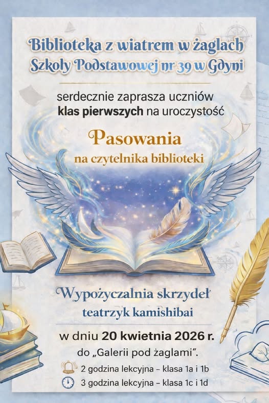 Biblioteka z wiatrem w żaglach Szkoły Podstawowej nr 39 w Gdyni serdecznie zaprasza uczniów klas pierwszych wraz z Paniami wychowawczyniami na uroczystość